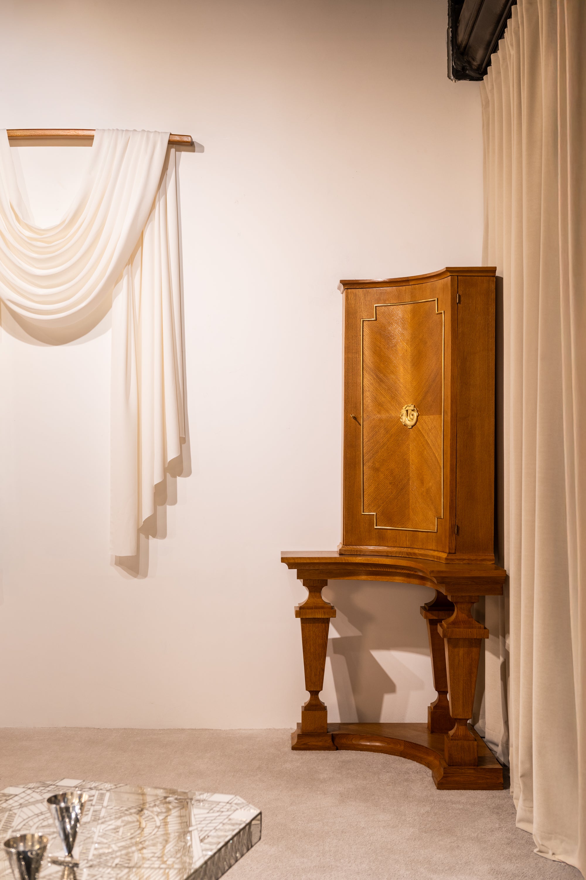 Cette superbe superbe paire de consoles d’encoignures, attribuée à André Arbus, ajoutera à coup sûr un élément de chic néoclassique français à n'importe quel projet de décoration. Elles ont probablement été dessinées et réalisées par André Arbus au début des années 1940. Les trois pieds balustres sculptés sont en chêne massif, la partie supérieure formant un cabinet présentant un magnifique placage papillon en chêne, sublimé par un cadre jonc de laiton et un médaillon en bronze doré au centre. Cette paire s'appelait autrefois « Monsieur et Madame », l'armoire de gauche présentant un médaillon représentant le signe Gémeaux et celle de droite, un médaillon représentant le signe Capricorne. Tous les détails forment un très beau témoignage du néoclassicisme chic d'André Arbus. Chaque cabinet comprend à l'intérieur trois étagères en chêne. Ces deux pièces ont été entièrement restaurées et sont dans un superbe état.
