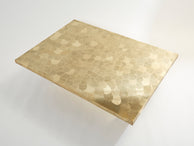 Très belle table basse signée du designer Belge Christian Krekels réalisée à la fin des années 1970. Le plateau est très décoratif, formant des écailles irrégulières, entièrement en laiton gravé, et reposant sur une base en bois recouvert de laiton poli. Le plateau rectangulaire aux lignes finement gravées semble flotter au-dessus de la base. La technique utilisée, typique du travail des décorateurs Belges des années 70 - 80, est celle de la gravure à l’acide, créant un motif unique. Elle a été entièrement restaurée et repolie, et est en superbe état de conservation. Une pièce rare, et très décorative.