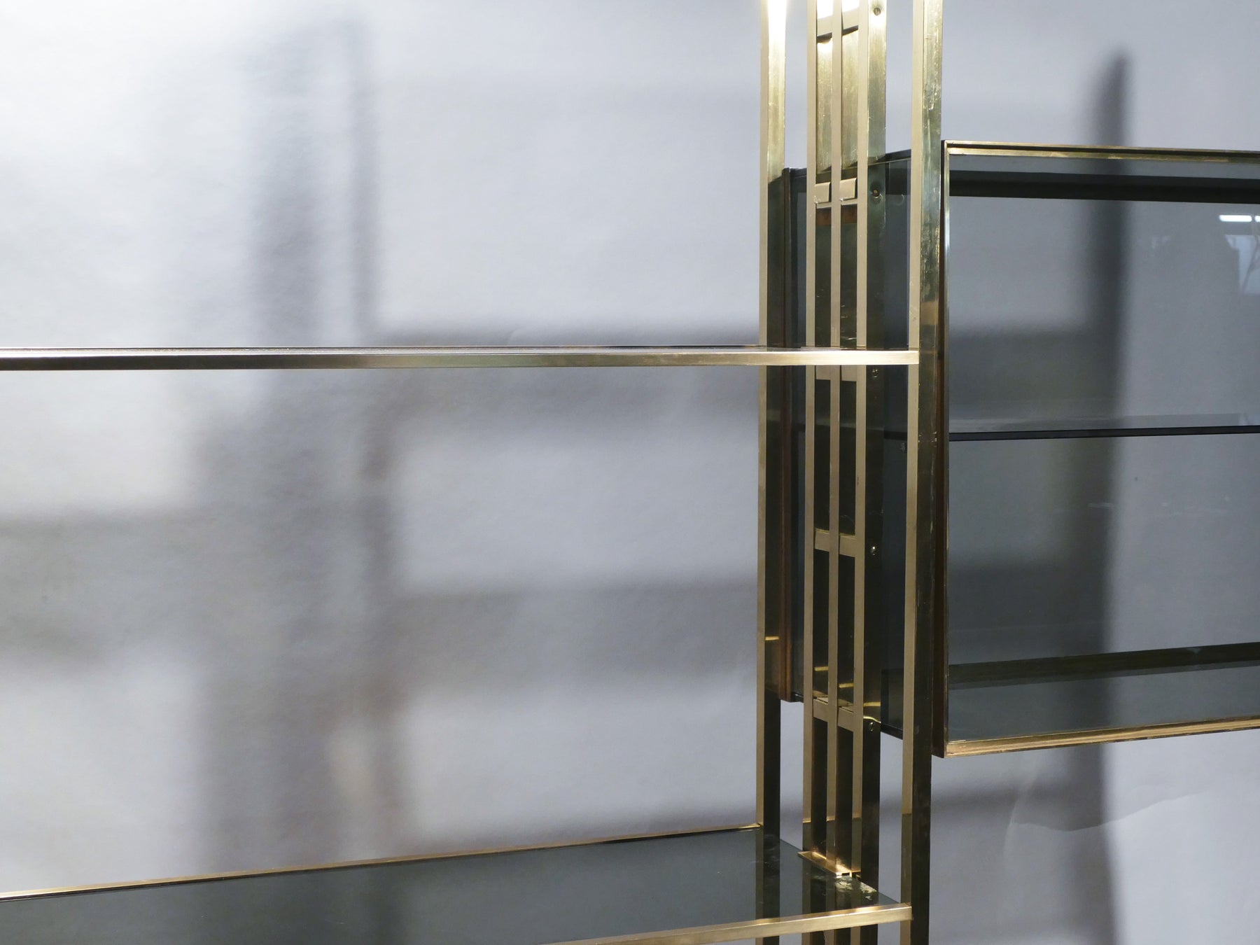 Très belle étagère bibliothèque laquée noire et laiton designée par Kim Moltzer dans les années 70. Elle comprend un module en verre fumé bleu et laiton, et quatre étagères en verre fumé bleu. Les laitons et la laque ont été entièrement nettoyés, et l’ensemble est en très bon état de conservation. Une pièce vraiment typique des années 70, très décorative, et d’une rare qualité de fabrication.