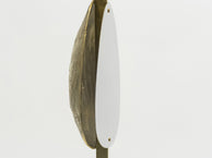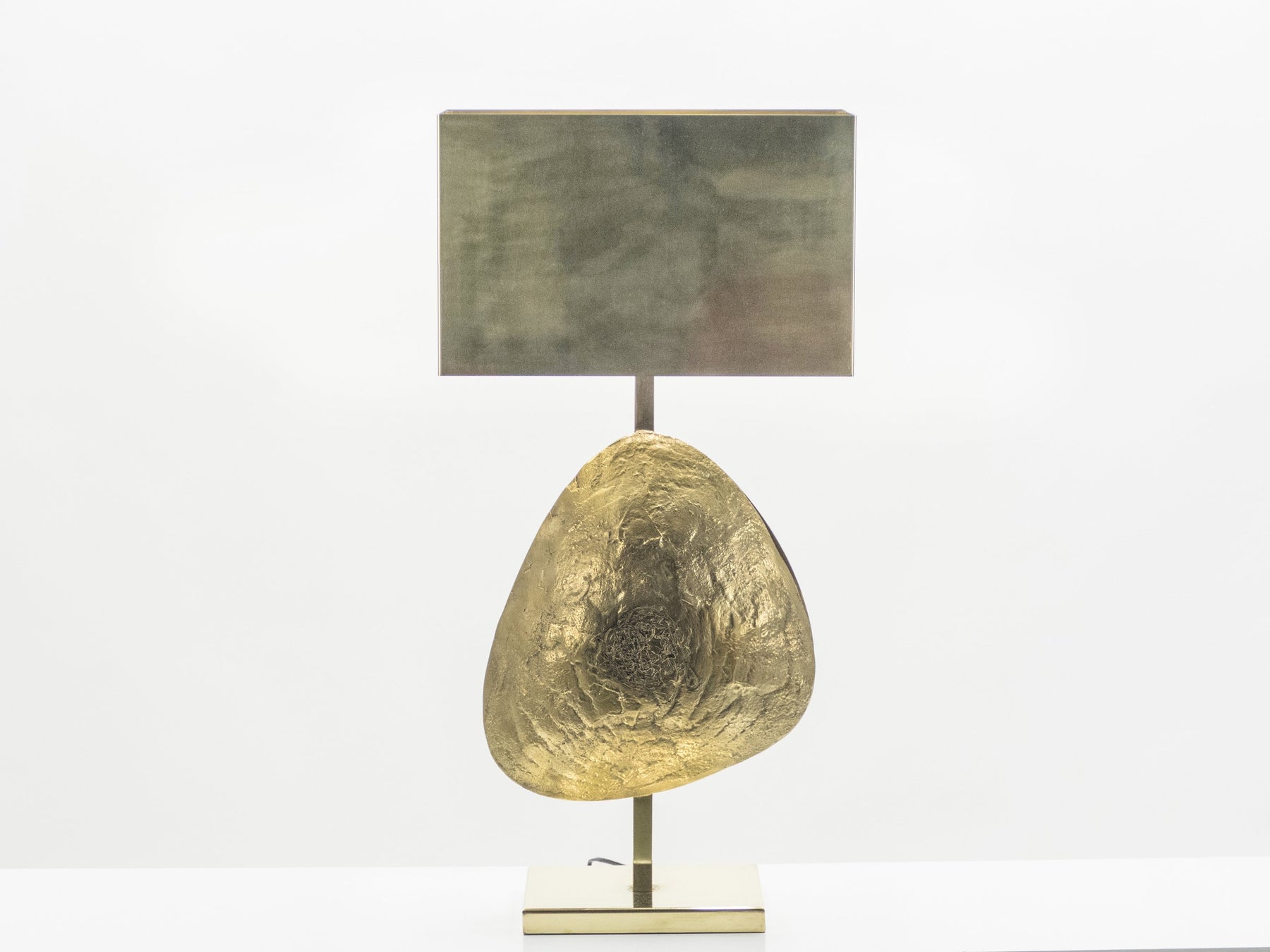 Superbe lampe sculpture belge en bronze et laiton designée dans les années 70 par Willy Daro. Le piètement et l’abat-jour sont en laiton brillant, et la sculpture en forme de carapace est en bronze travaillé. Elle a été nettoyée et est en superbe état de conservation, avec une légère patine sur l’abat-jour, du plus bel effet. Très belle qualité de fabrication, et très lourde. Design très élégant, à la fois intemporel avec cette touche vintage, cette lampe est peu profonde et facile à placer dans un salon décoré.