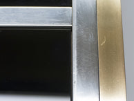 Typique des créations de Romeo Rega pour Metalarte, cette grande table de salle à manger chrome et laiton à plateaux de verre opalin noir date du milieu des années 70. Un design à la fois chic et intemporel. Elle est très lourde, et d’une rare qualité de fabrication. Les différents plateaux en verre opalin, comme la structure chrome et laiton, sont en superbe état de conservation. Une pièce vraiment unique, à ne pas rater.
