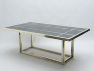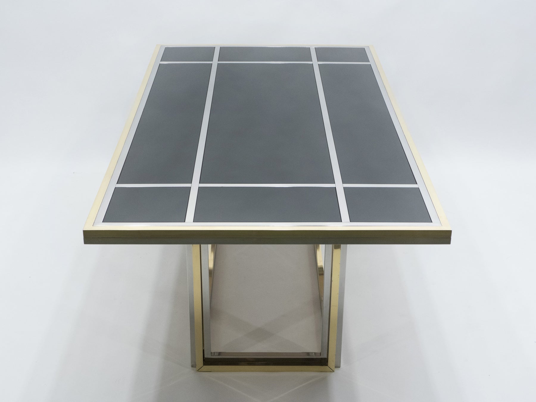 Grande table à manger chrome et laiton verre noir Romeo Rega 1970