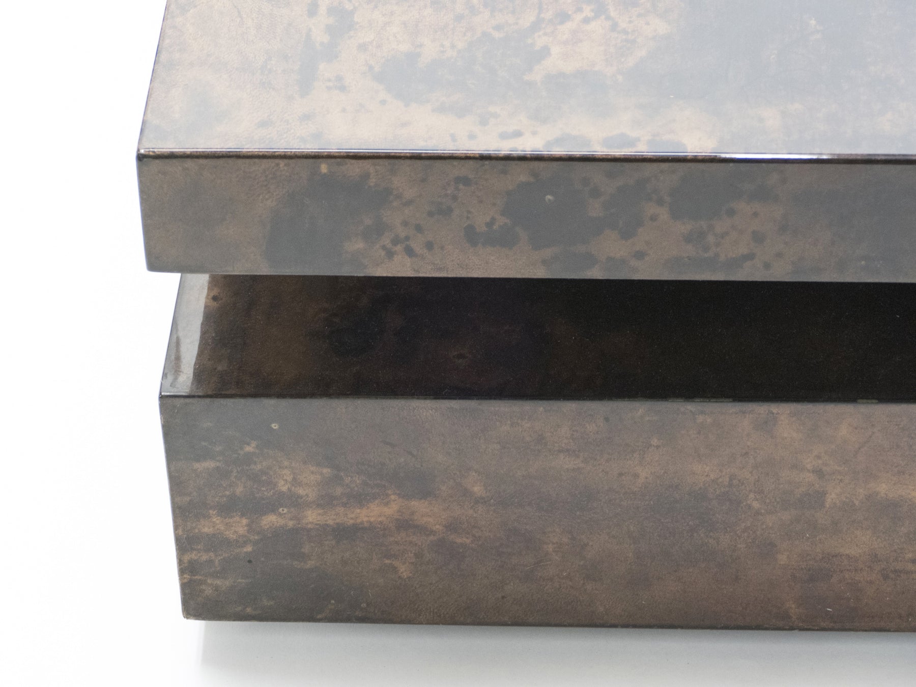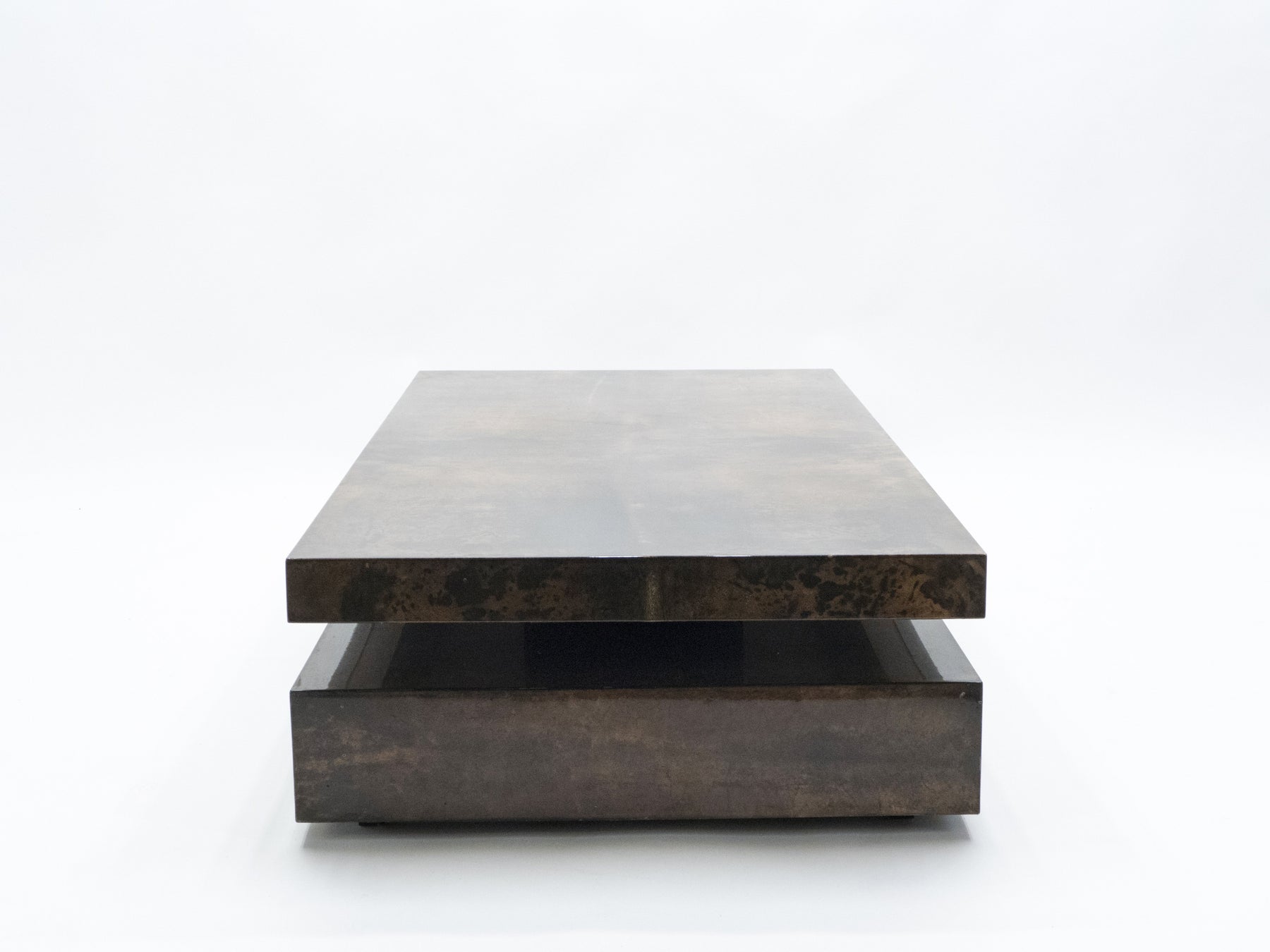 Très grande table basse en parchemin designée et éditée par Aldo Tura à Milan en Italie. Caractéristique du travail d’Aldo Tura, le parchemin est une peau de chèvre teintée et laquée qui donne ses nuances de marron et ce piqué absolument superbe. Cette grande table basse ajoutera une touche d’élégance et de charme vintage à votre salon, et en sera sans nul doute la pièce centrale. Elle a été entièrement nettoyée et revernie, et est en très bon état de conservation. Vraiment une très belle pièce décorative, et extrêmement rare dans ces dimensions.