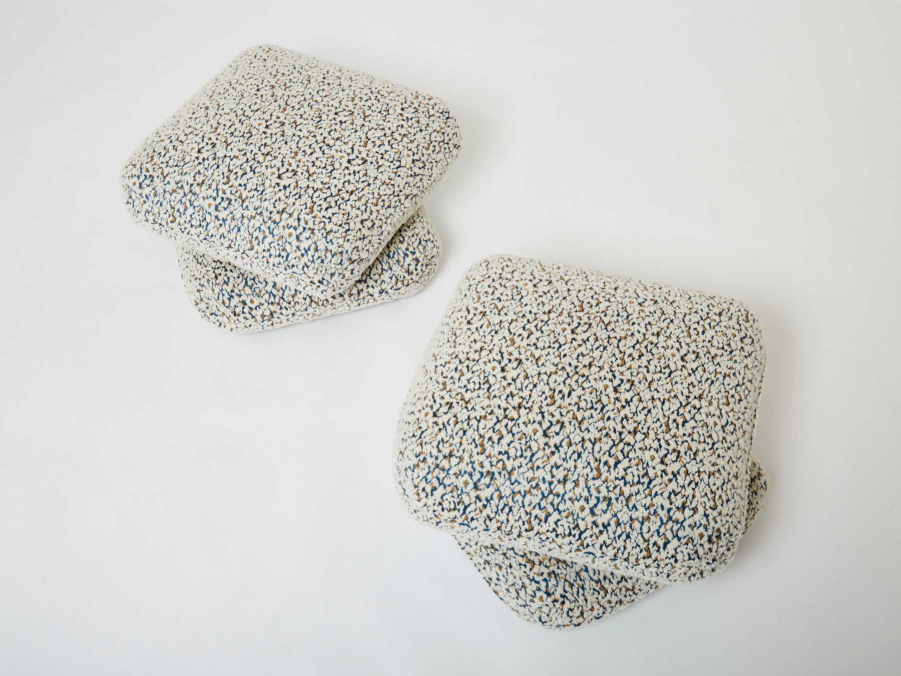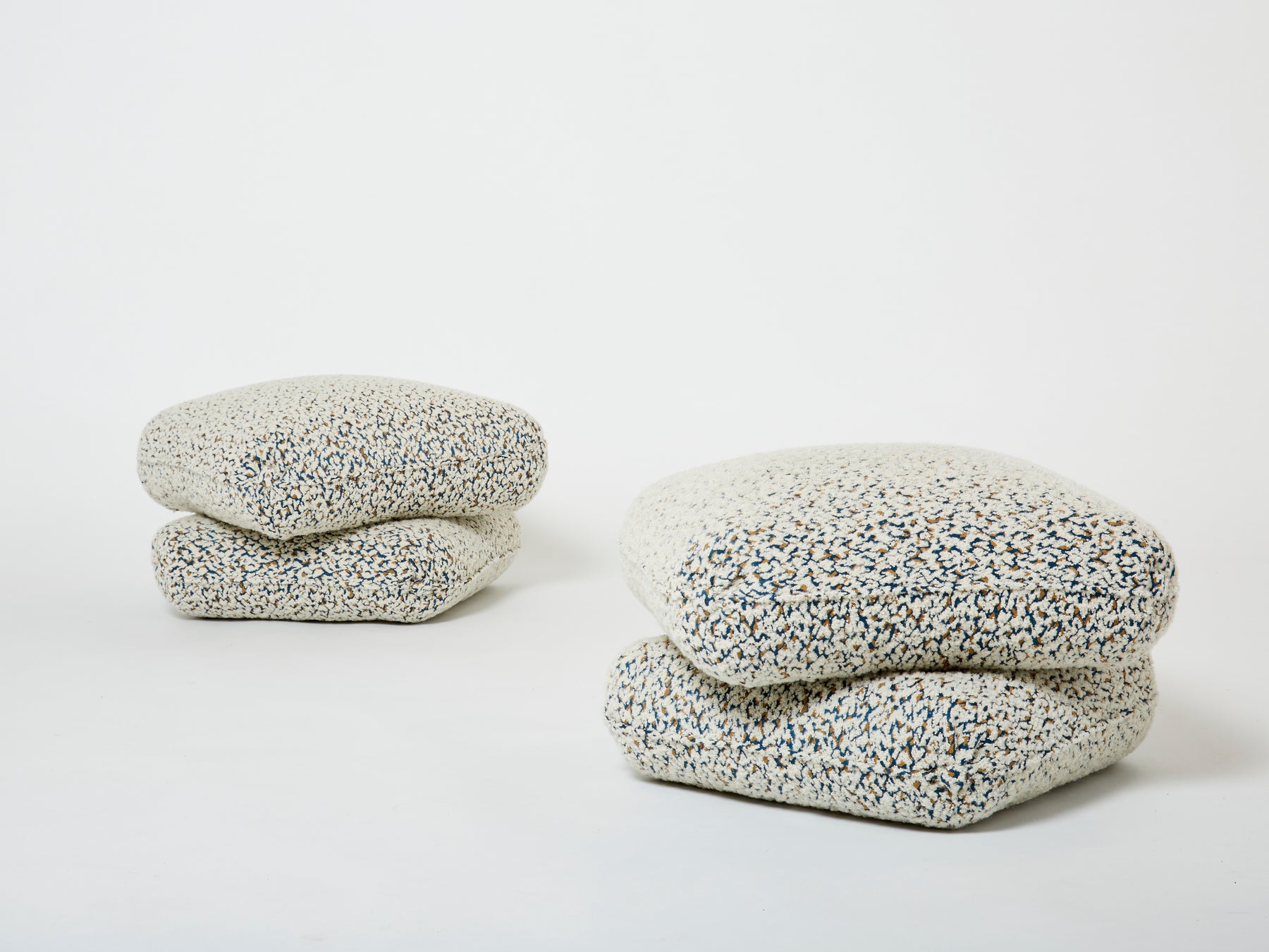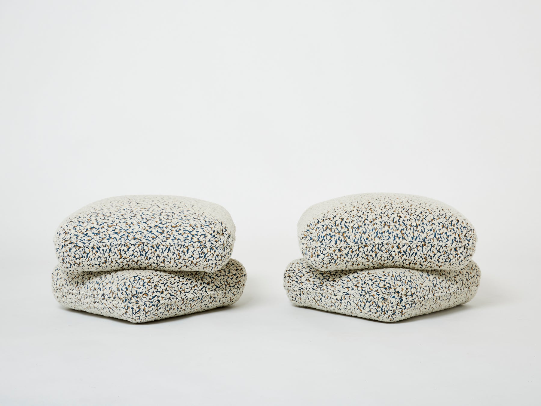 Très belle paire de poufs ou ottomans dessinés par Jacques Charpentier et édités par Maison Jansen au milieu des années 70. Ils se composent de deux coussins fixés entre eux. Les poufs ont été entièrement retapissées avec un tissu en mélange de laine vierge et alpaga à bouclettes et motifs graphiques jacquards de Métaphores. Des pièces iconiques des années 70, dans le pur style seventies, chics et décoratives.