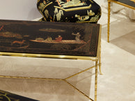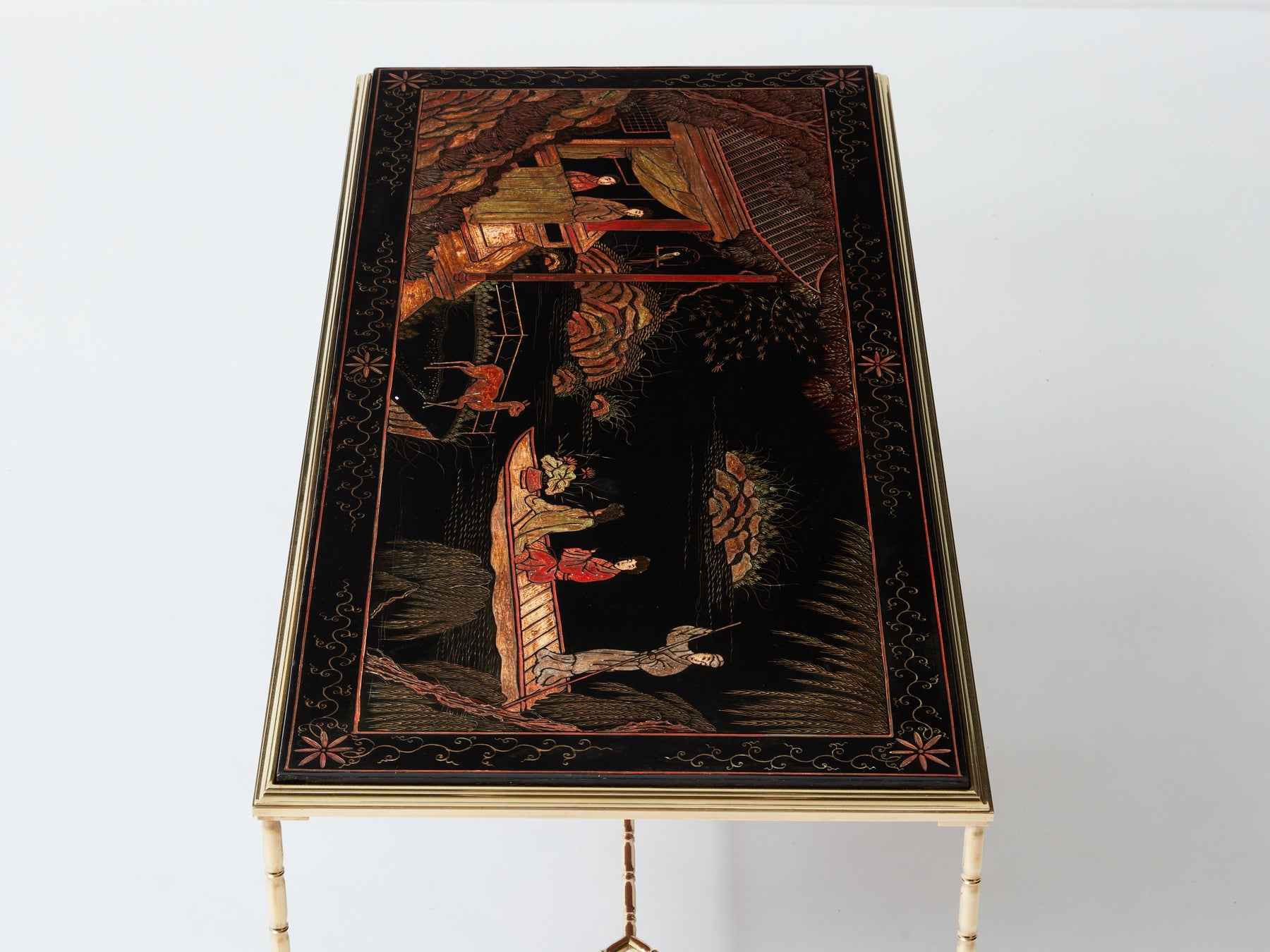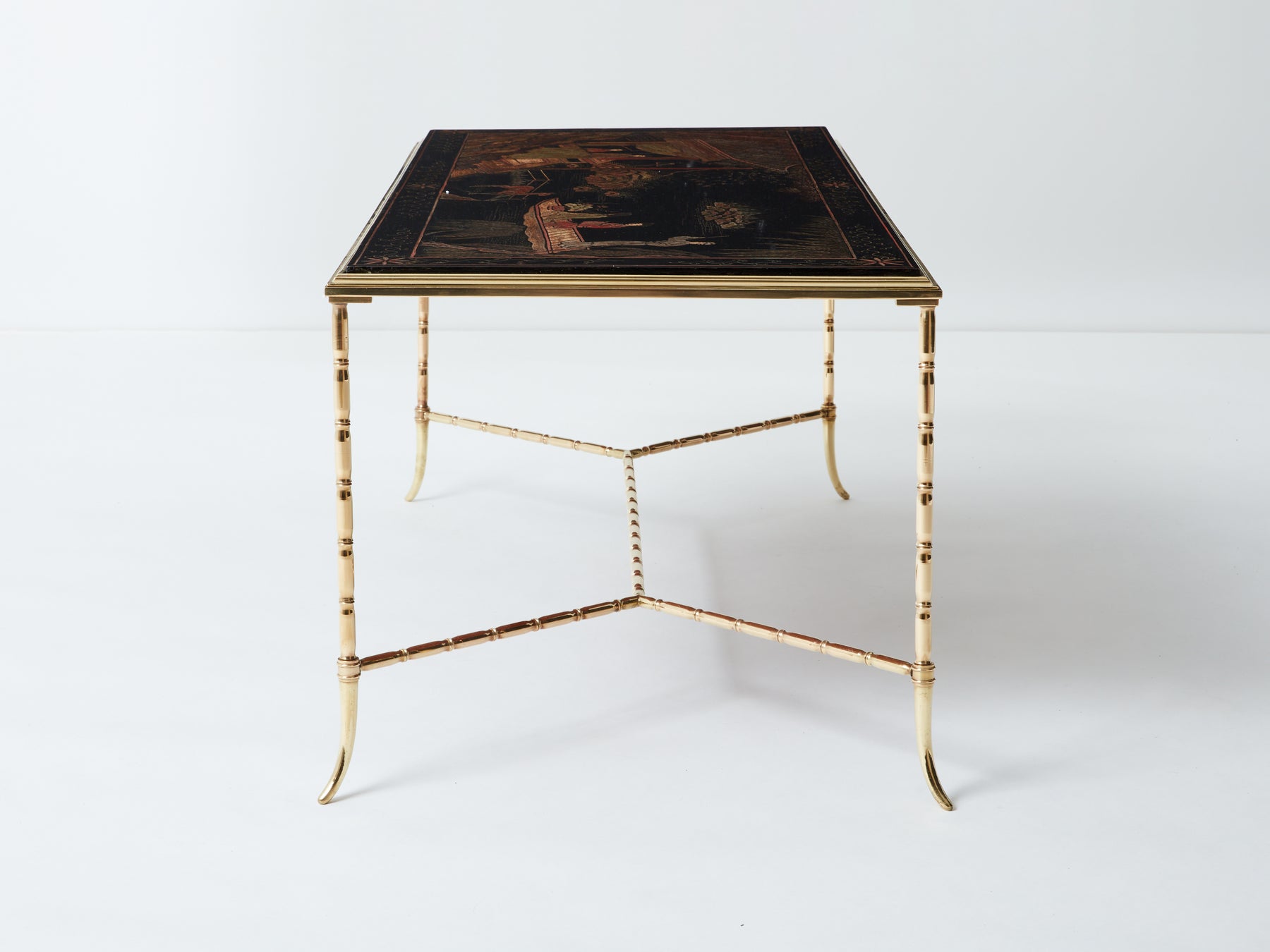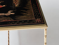 Superbe table basse en laiton façon bambou et plateau en laque de Chine de la Maison Baguès datant du début des années 60. Le travail du laiton associé au décor d’une scène ancienne dans un parc. Faux bambou et laque de chine sont les attributs typiques du style néoclassique français des années 50 à 70, par la Maison Baguès et la Maison Jansen. La structure a été nettoyée, et le laiton présente une très belle patine. Le plateau en laque a été entièrement restauré. Une pièce intemporelle et très décorative, dans un parfait état.