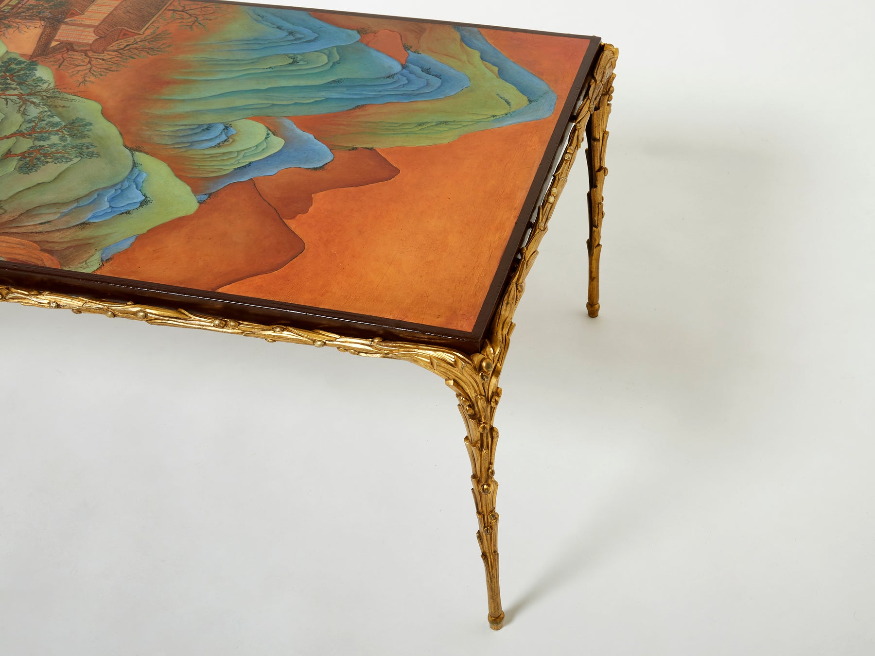 Superbe table basse en bronze façon bambou et plateaux en laque de Chine de la Maison Baguès datant du début des années 60. Le travail du bronze associé au décor d’un temple dans les montagnes est juste superbe. Faux bambou et laque de chine sont les attributs typiques du style néoclassique français des années 50 à 70, par la Maison Baguès et la Maison Jansen. La structure a été nettoyée, et le bronze présente une très belle patine. Le plateau en laque a été entièrement restauré. Une pièce intemporelle et très décorative, dans un parfait état.