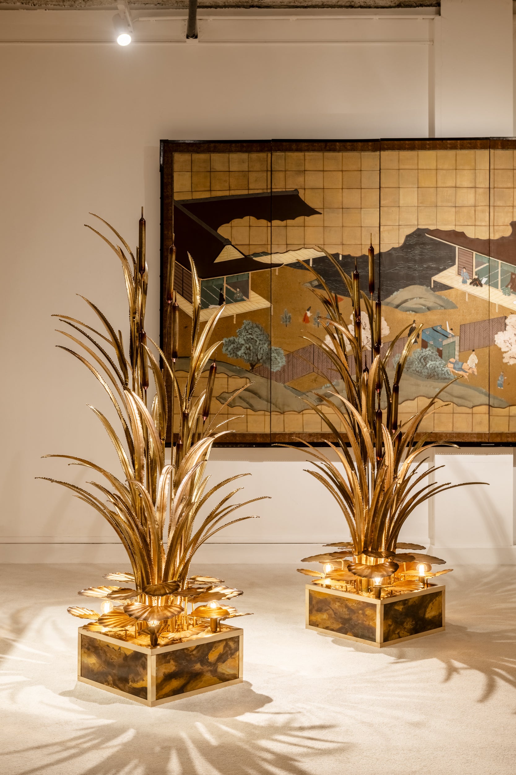 Superbe ensemble de deux lampadaires en laiton de Maison Jansen à décors de roseaux et nénuphars, l'une des pièces les plus iconique de la Maison Jansen des années 1970. Les lampes et lampadaires de Maison Jansen sont vraiment spéciales, le soin apporté à chaque détail reste inégalé aujourd’hui. Chaque nénuphar, chaque feuille de roseau et chaque tige ont été travaillés à la main, le travail de découpe, de soudure, et de finition au chalumeau donnant les nuances de couleurs au laiton est vraiment superbe. Les roseaux sont flexibles, et paraissent presque vivants. Le socle carré, mix de laiton poli et patiné, s'accorde parfaitement avec l'esprit général de la pièce, élégant et poétique. Quatre douilles et ampoules sont disposées à chaque angle du socle, sous les nénuphars, et un puissant halogène est placé à la base du roseau. De loin, on ne distingue pas la source de la lumière. Ces deux pièces ont été entièrement restaurées et réélectrifiées, et sont dans un état exceptionnel. Incroyablement rare en paire avec une patine assortie.