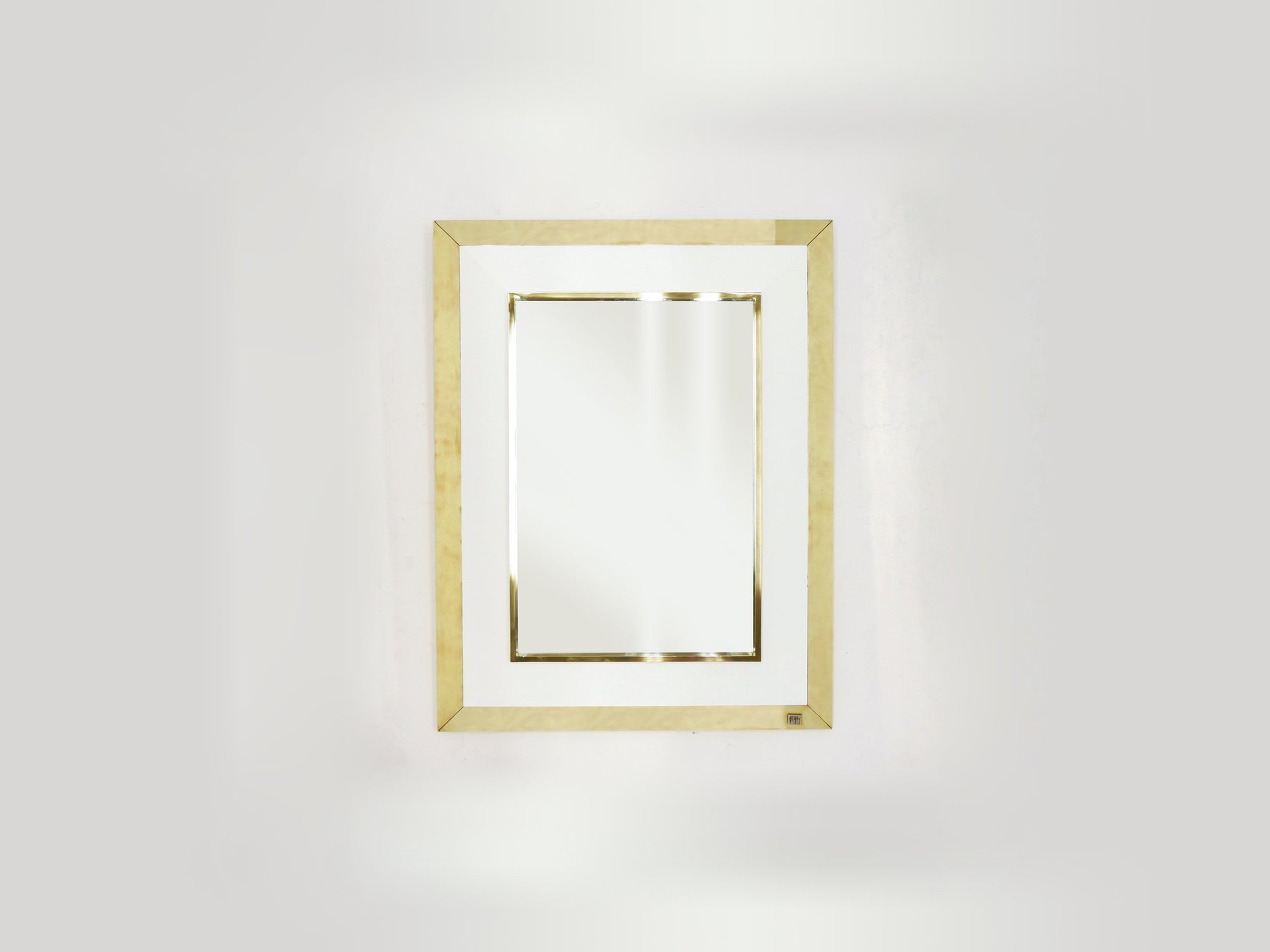 Superbe miroir vintage laqué blanc et laiton signé de Jean-Claude Mahey édité par Roméo Paris dans les années 70. Très belle qualité de fabrication, très belles finitions. Les laitons ont été nettoyés, et il est en parfait état de conservation. Très décoratif, et très seventies !