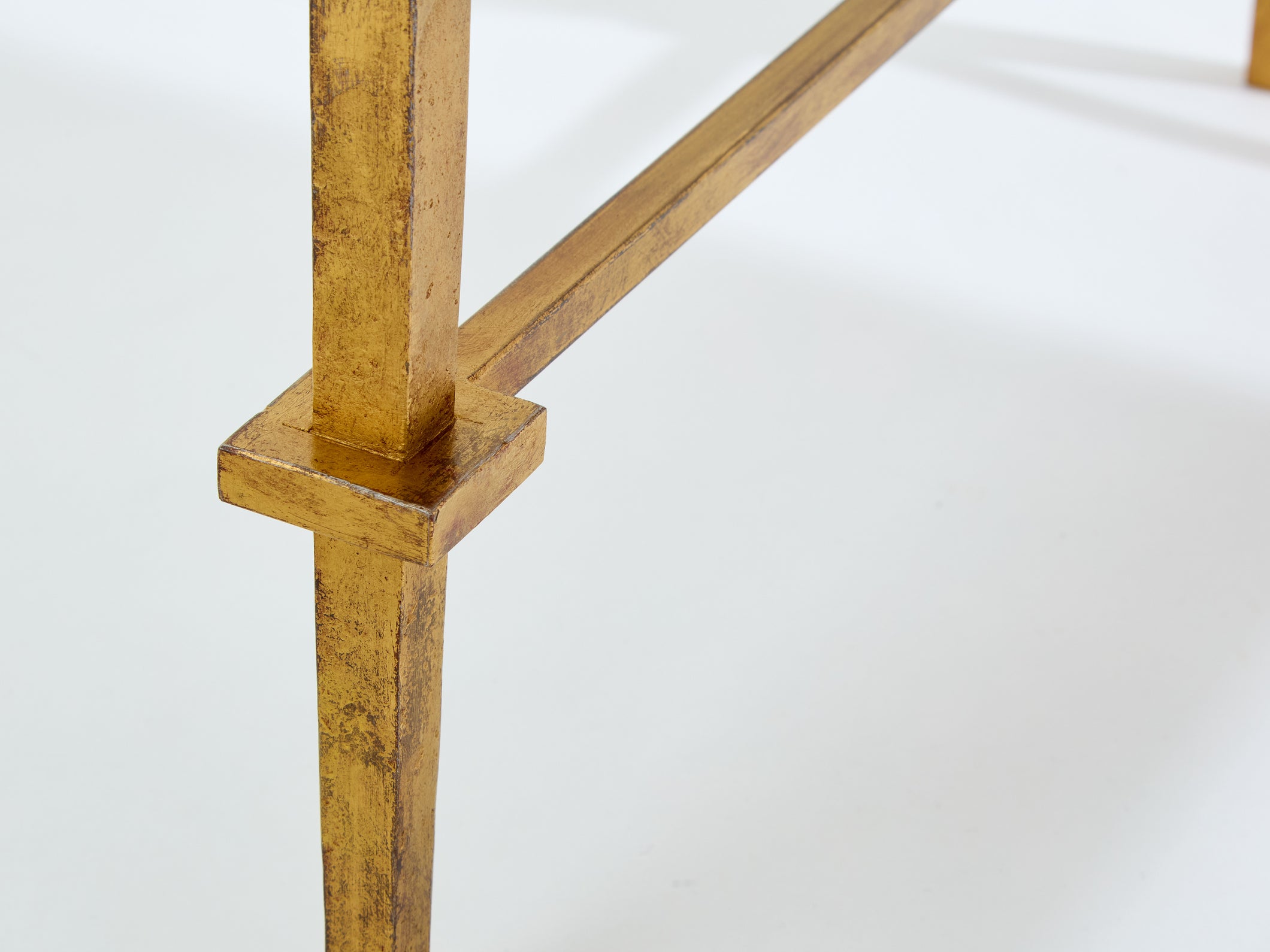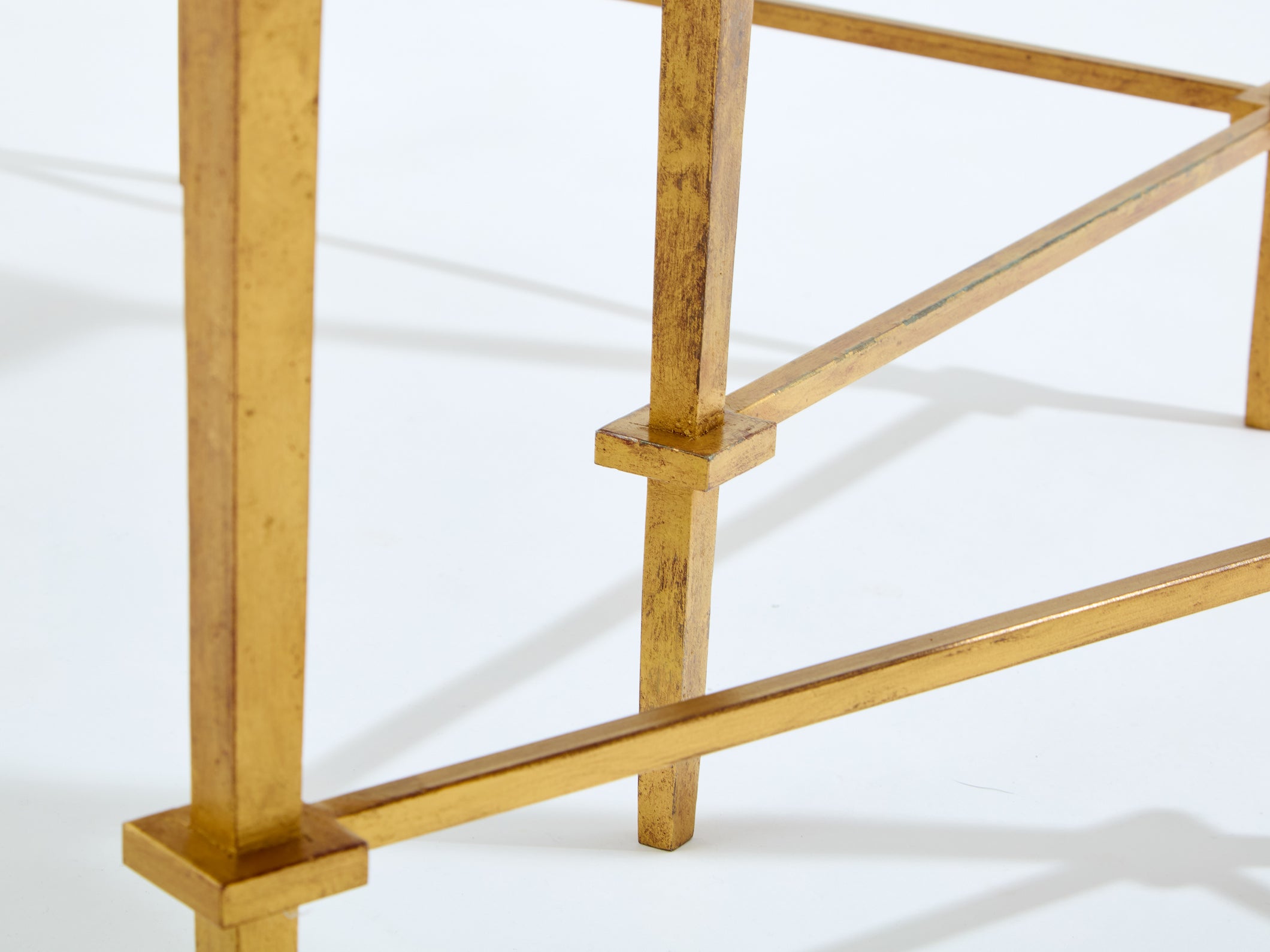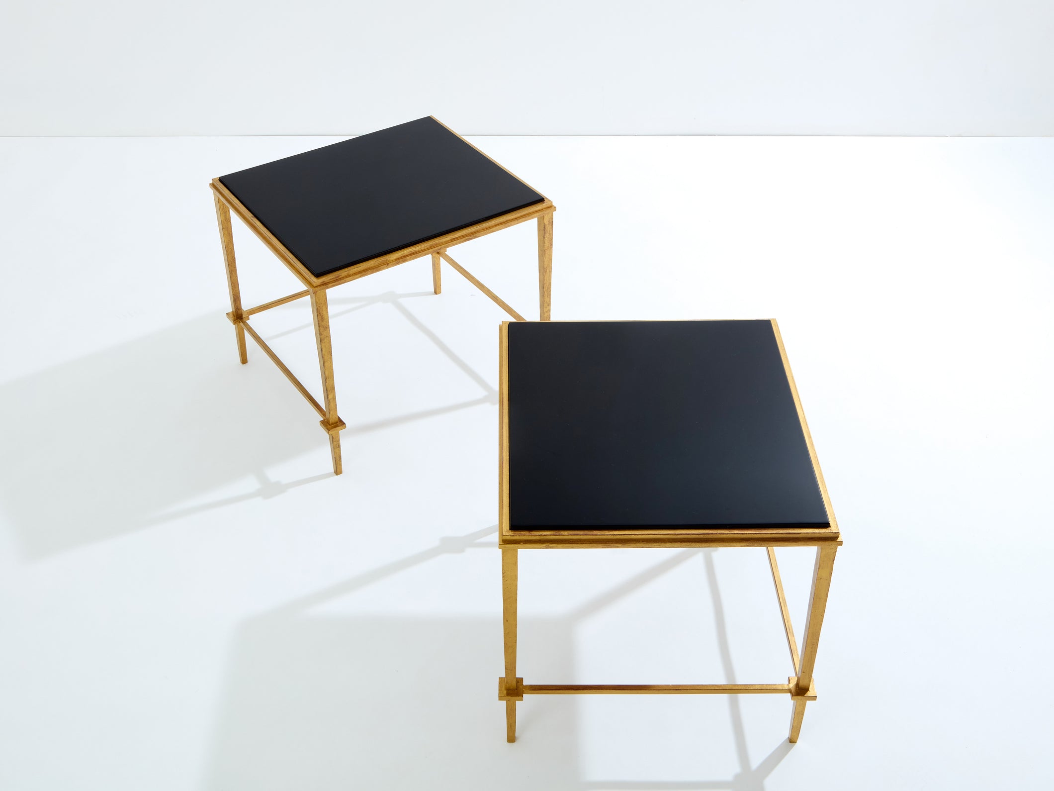 Très belle paire de tables d’appoint, ou bouts de canapé néoclassiques en fer doré à la feuille de la Maison Ramsay datant des années 50, dans le pur style des décorateurs français post art deco. Les plateaux sont en bois laqué noir. D’une superbe qualité de fabrication et de finition, ce modèle est très connu des décorateurs, et un grand classique intemporel des années 40 - 50. Elles ont été entièrement restaurées, plateaux relaqués, et sont en superbe état de conservation.