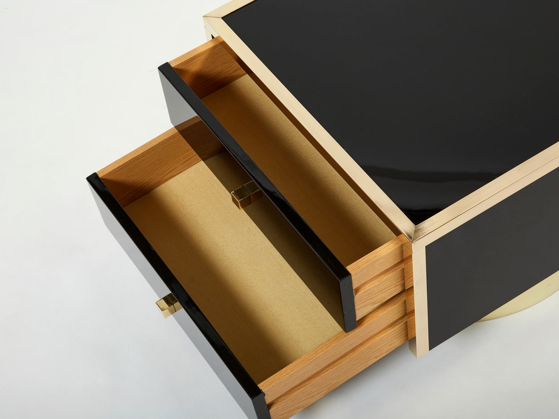 Très belle et rare paire de tables de chevets ou bouts de canapé laqués noir et laiton designées par Michel Pignères à la fin des années 70. Le contraste entre la laque noir et les éléments en laiton poli et laiton brossé est superbe. Une paire très chic et décorative, dans le pur style des années 70, d’une rare qualité de fabrication, et dans un superbe état de conservation.