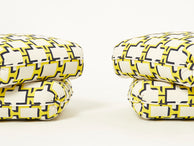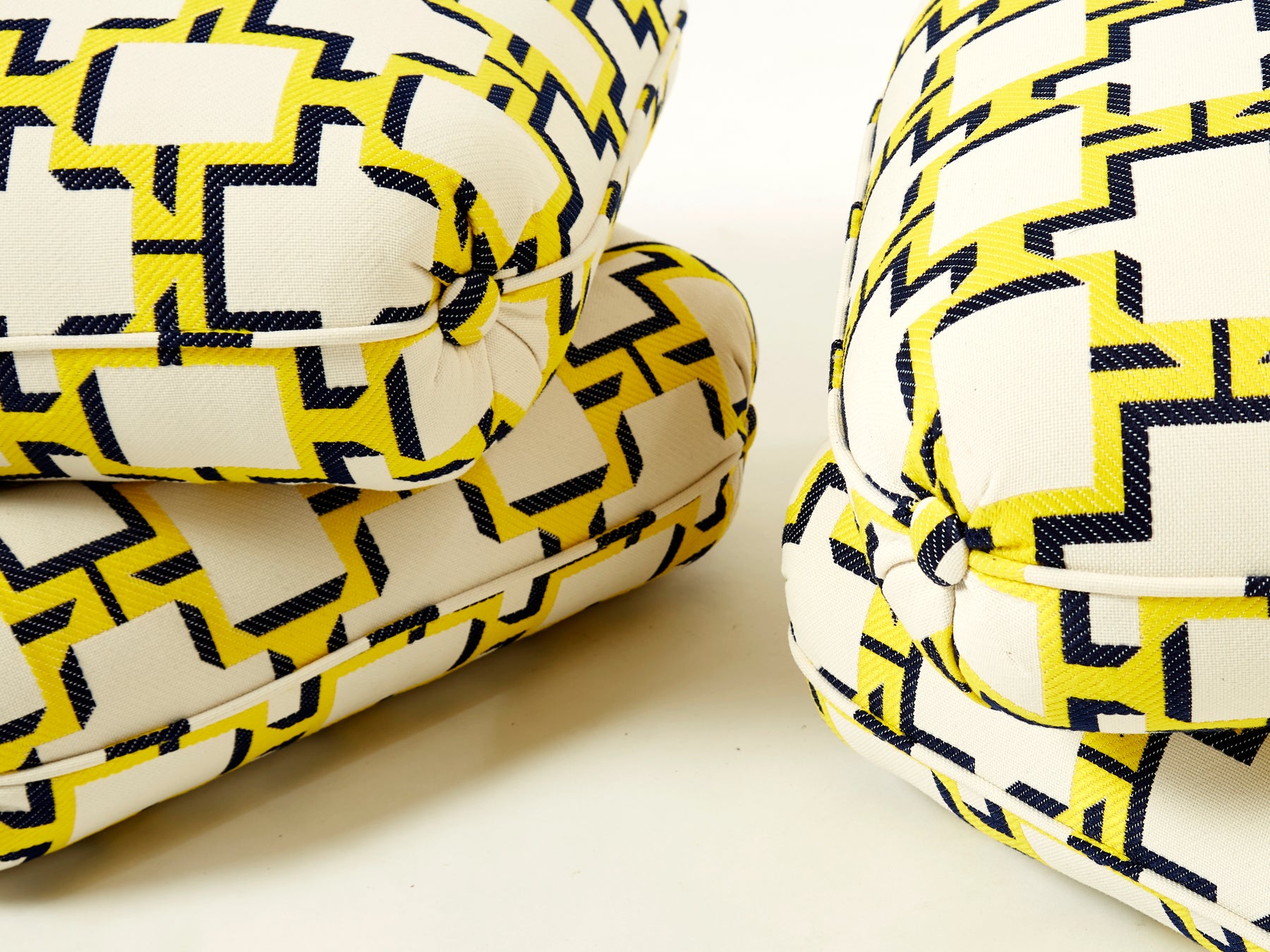 Rare paire de poufs ou ottomans designés par Jacques Charpentier et édité par Maison Jansen au milieu des années 70. Ils se composent de deux coussins fixés entre eux. Les poufs ont été entièrement retapissées avec un superbe tissus outdoor géométrique de Dedar - référence Campus, à la fois très doux et résistant. Des pièces iconiques des années 70, dans le pur style seventies, très chics et décoratives.
