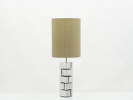 Superbe paire de lampes en métal chromé et abats-jours texturé réalisés sur mesure du designer américain Curtis Jere éditées dans les années 70. Ces lampes sont très décoratives et architecturales. Elles ont été nettoyées, et sont en très bel état de conservation. Typique du travail du métal de Curtis Jere dans les années 70. Les dimensions sont avec abat-jours. Le pied seul mesure 47 cms.