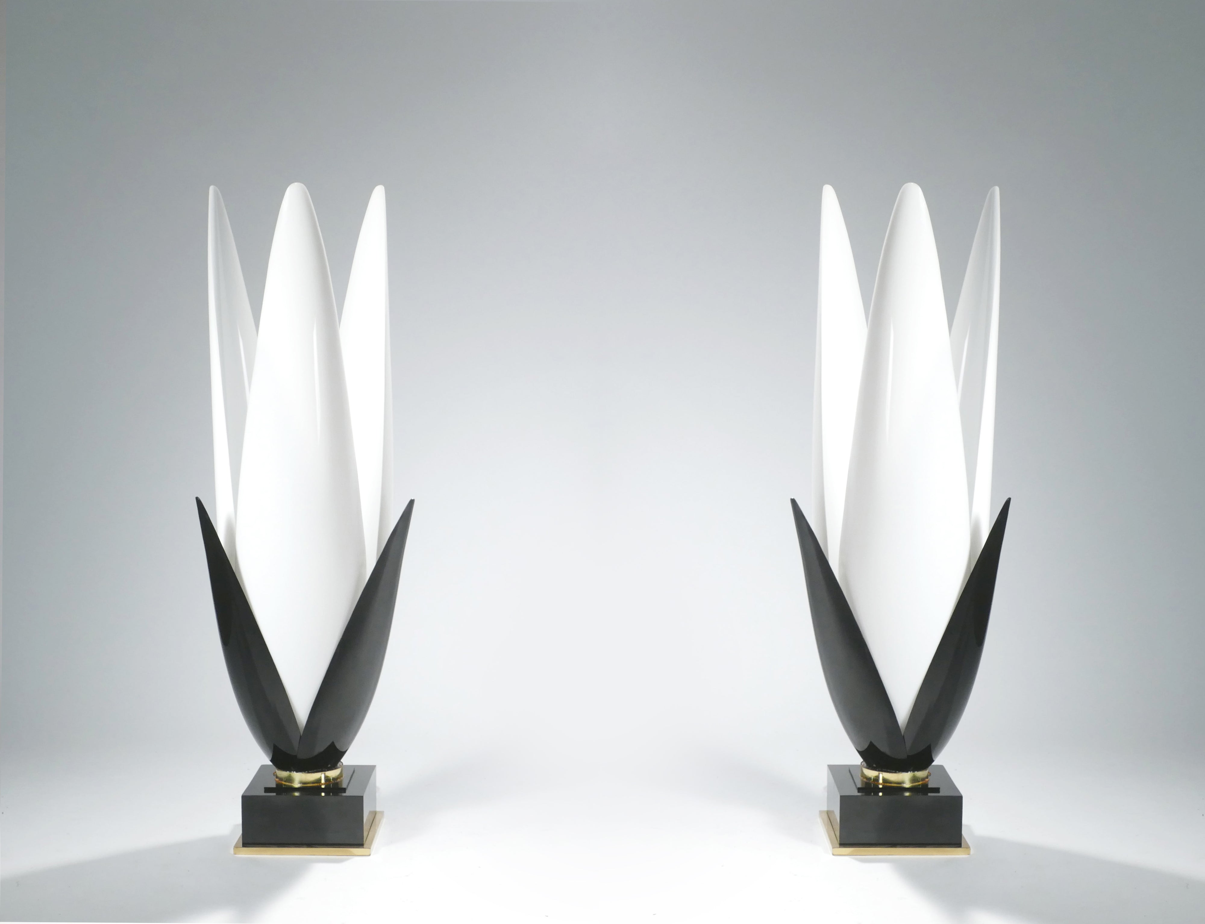 Rare et superbe paire de lampadaires ou grandes lampes de Roger Rougier pour la Maison Rougier en plexiglas perpex blanc et noir datant des années 70. Leur socle est laqué noir et cerclé de laiton. Des pièces très aériennes et très décoratives, en très bon état de conservation. Superbe design et très belle qualité de fabrication, très originale et typique des années 70.