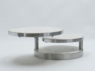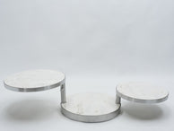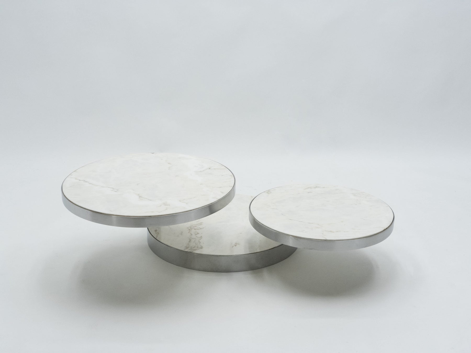 Une rare table ronde pivotante à trois niveaux de la Maison Mercier éditée au début des années 1970. Elle présente un cadre et une structure en acier brossé avec trois niveaux en marbre blanc qui peuvent être ajustés et fixés par deux poignées. Il s'agit d'une table assez rare et unique, inspirée de la «table éventail» de Maria Pergay. Fermée, le diamètre de la table basse est 73 cms, complètement ouvert sa largeur monte jusqu'à 190 cms.