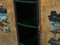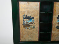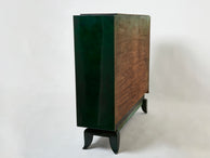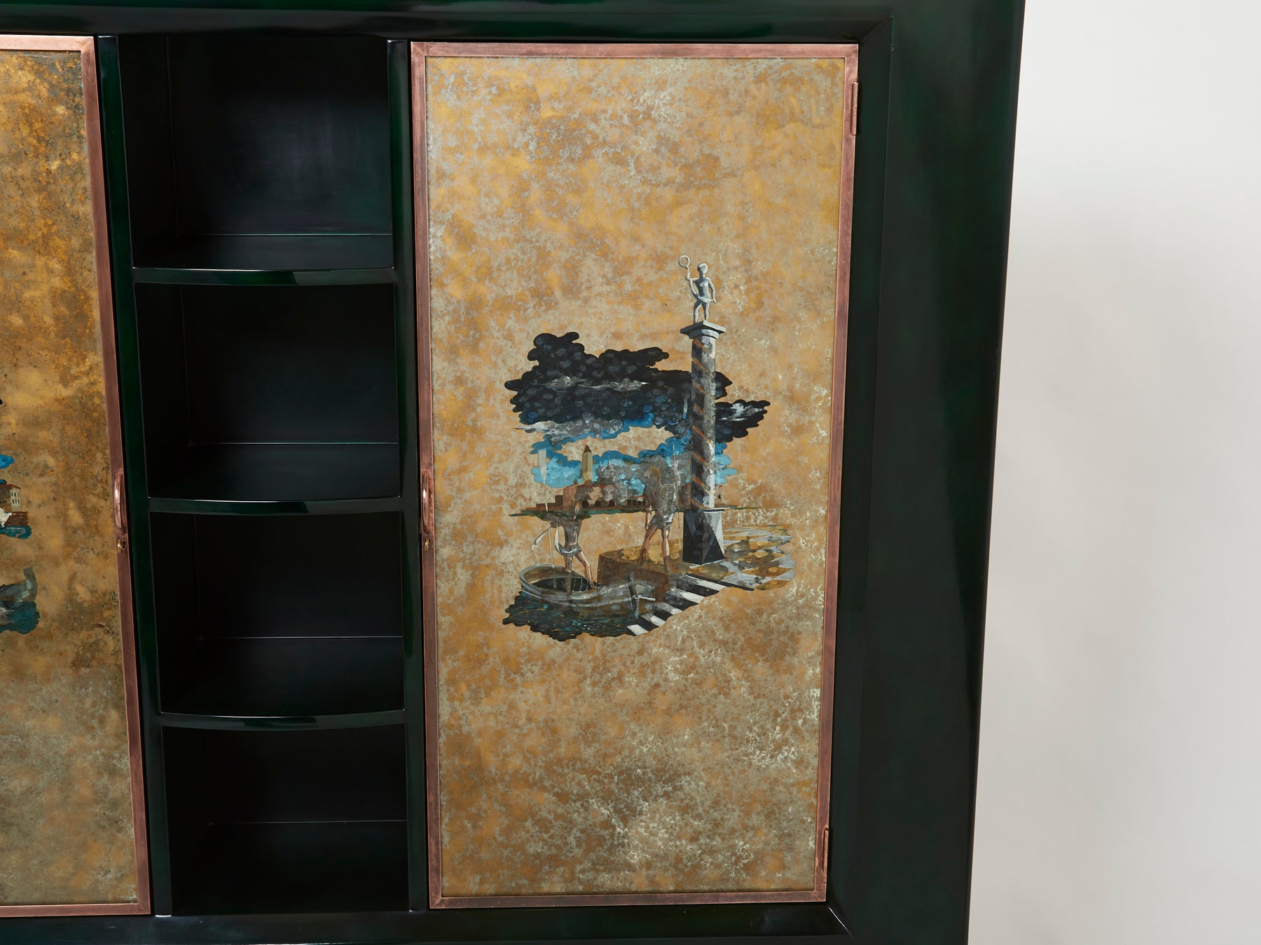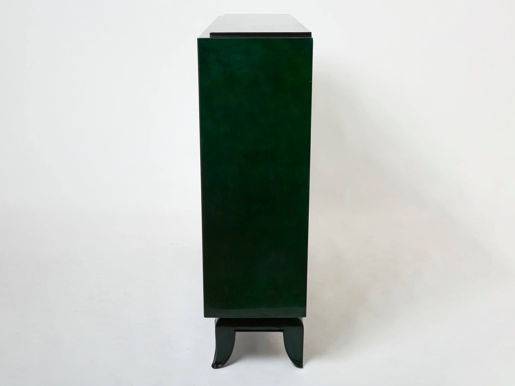 Unique meuble de rangement Art déco en laque vert foncé réalisé en 1938, collaboration collaboration entre René Drouet et Pierre Adrien Ekman. Il comporte quatre niches centrales et deux portes en miroir peintes et décorées par Ekman. Pierre Adrien Ekman était un artiste très talentueux travaillant en France, collaborant principalement avec René Drouet et René Prou. Le travail d’Ekman sera honoré avec "Ekman: Décors", une exposition en 1975 au Musée Denon. Ce cabinet est un parfait exemple de la richesse artistique de l’époque Art Déco en France.. Il a été entièrement restauré et se trouve dans un excellent état.
