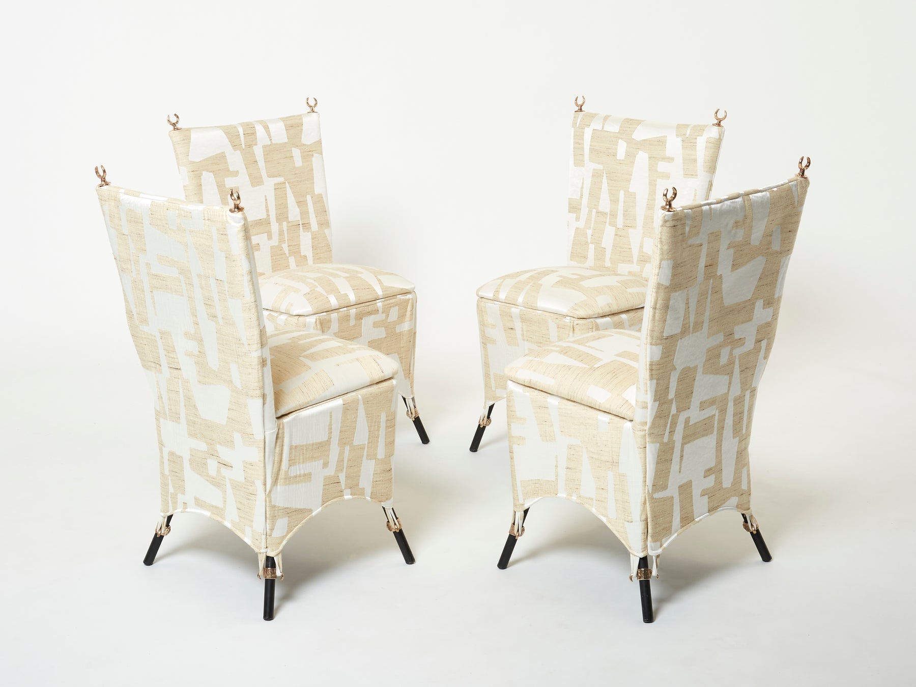 Rare ensemble de 8 chaises par Elizabeth Garouste & Mattia Bonetti, modèle Jour et Nuit, en acier patiné canon de fusil noir et bronze. Garouste & Bonetti ont commencé leur collaboration et ont acquis une reconnaissance mondiale suite à la décoration intérieure de la discothèque parisienne Le Palace en 1979, commandé par Fabrice Eamer. Ce modèle de chaises a été conçu par le duo en 1991, et édité par la Galerie Avant-scène. Elles ont été entièrement restaurées, et recouvertes d’un tissu jacquard italien Dedar référence Pazl, qui est un tissu en satin de soie et en lin mélant des éléments géométriques et des références à l'art primitif, collant parfaitement à ces chaises et à l'esprit de Garouste & Bonetti. Une occasion unique d'acheter un bout d’histoire du design moderne. Référence : Y. Brunhammer & M.L. Perrin, « Le mobilier français 1960-1998 », Editions Massin, Paris, 1998, pages 58, 155, 212 et 226. A. d'Arnoux & J. Denardant, "Paris, un art de vivre", Editions Chêne & Hachette, 2010, Paris, page 76.