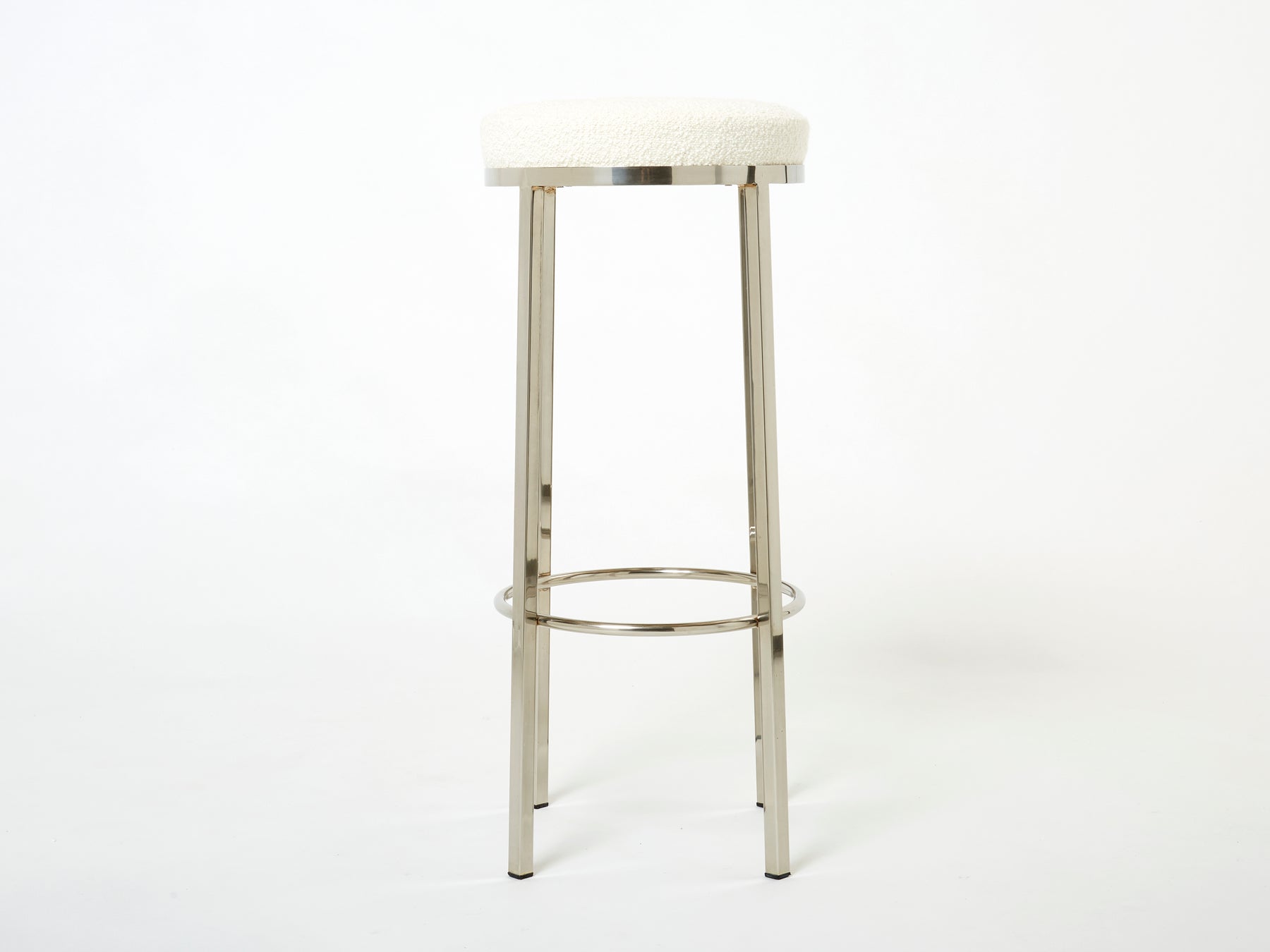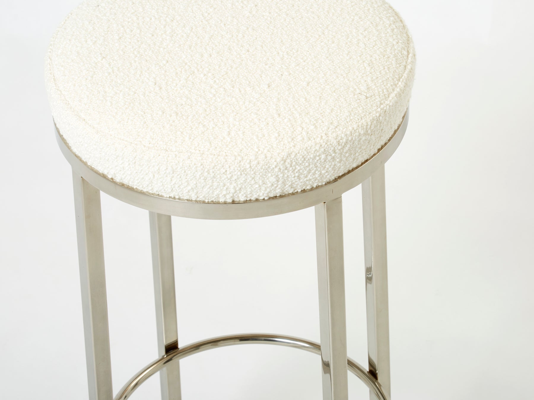 Très beaux tabourets de bar vintage en acier brossé de Jean-Claude Mahey pour Romeo Paris datant des années 70. Très belle qualité de fabrication, un grand classique intemporel des années 70. Ils ont été entièrement restaurés, et retapissés avec un tissu en laine bouclette de chez Lelièvre, et sont en très bon état de conservation.