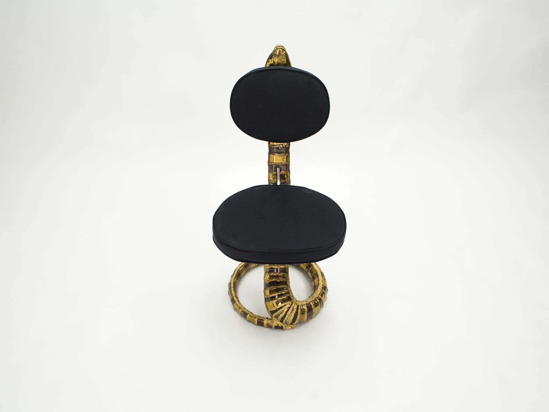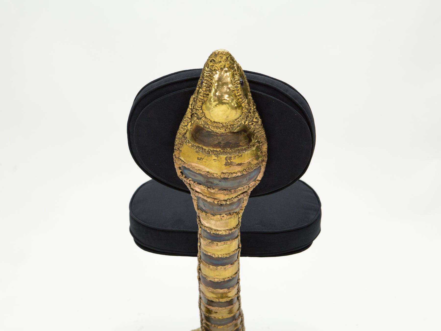 Superbe chaise sculpture Cobra signée d’Isabelle Masson-Faure pour la Maison Honoré dans les années 70. Mélange de métal, bronze, cuivre, laiton et étain soudé. Une pièce unique réalisée à la main, signée de l’artiste, réaliste et extrêmement décorative, à placer dans un jardin d’hiver, une véranda, une entrée ou dans un angle de salon. Cette chaise a été entièrement restaurée, et retapissée avec un tissus Alcantara noir de chez Lelèvre.