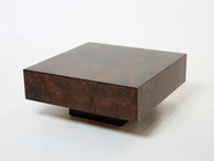 Très belle petite table basse carré en parchemin éditée par Aldo Tura à Milan en Italie. Caractéristique du travail d’Aldo Tura, le parchemin est une peau de chèvre teintée et laquée qui donne ses nuances de marron et ce piqué absolument superbe. Elle a été entièrement nettoyée et est en très bon état de conservation. Vraiment une très belle pièce décorative, typique des années 70 et de la production d’Aldo Tura.