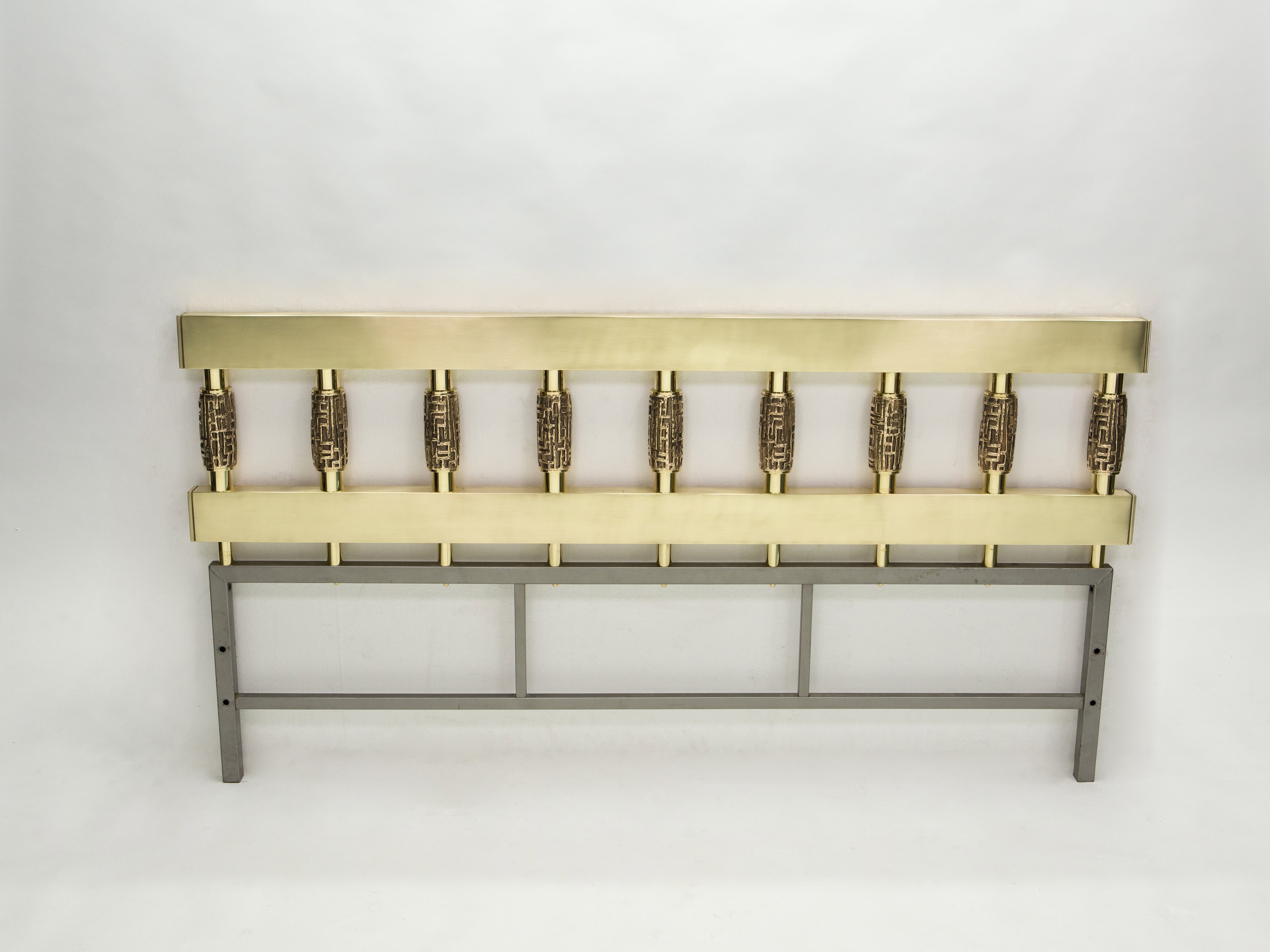 Grande tête de lit réalisée par l'artiste et designer italien Luciano Frigerio. Le cadre en laiton est solide et élégant, offrant un écrin parfait pour les neuf sculptures brutalistes en bronze. Il s'agit du modèle «Bagdad», qui fait partie de la série de «Letti Scultura» dessinée par Luciano Frigerio pour Frigerio Di Desio en Italie au début des années 1970. Cette pièce a été entièrement restaurée et repolie, et est dans un très bon état vintage. Prévue pour un lit king size, la fixation de la tête de lit au sommier ne nécessite que quatre grosses vis. Une tête de lit similaire de Lucio Frigerio est présentée dans l'édition de janvier / février 2021 du magazine AD.