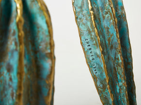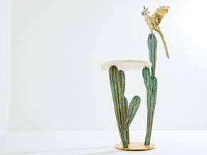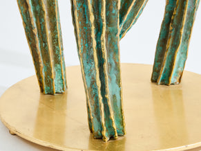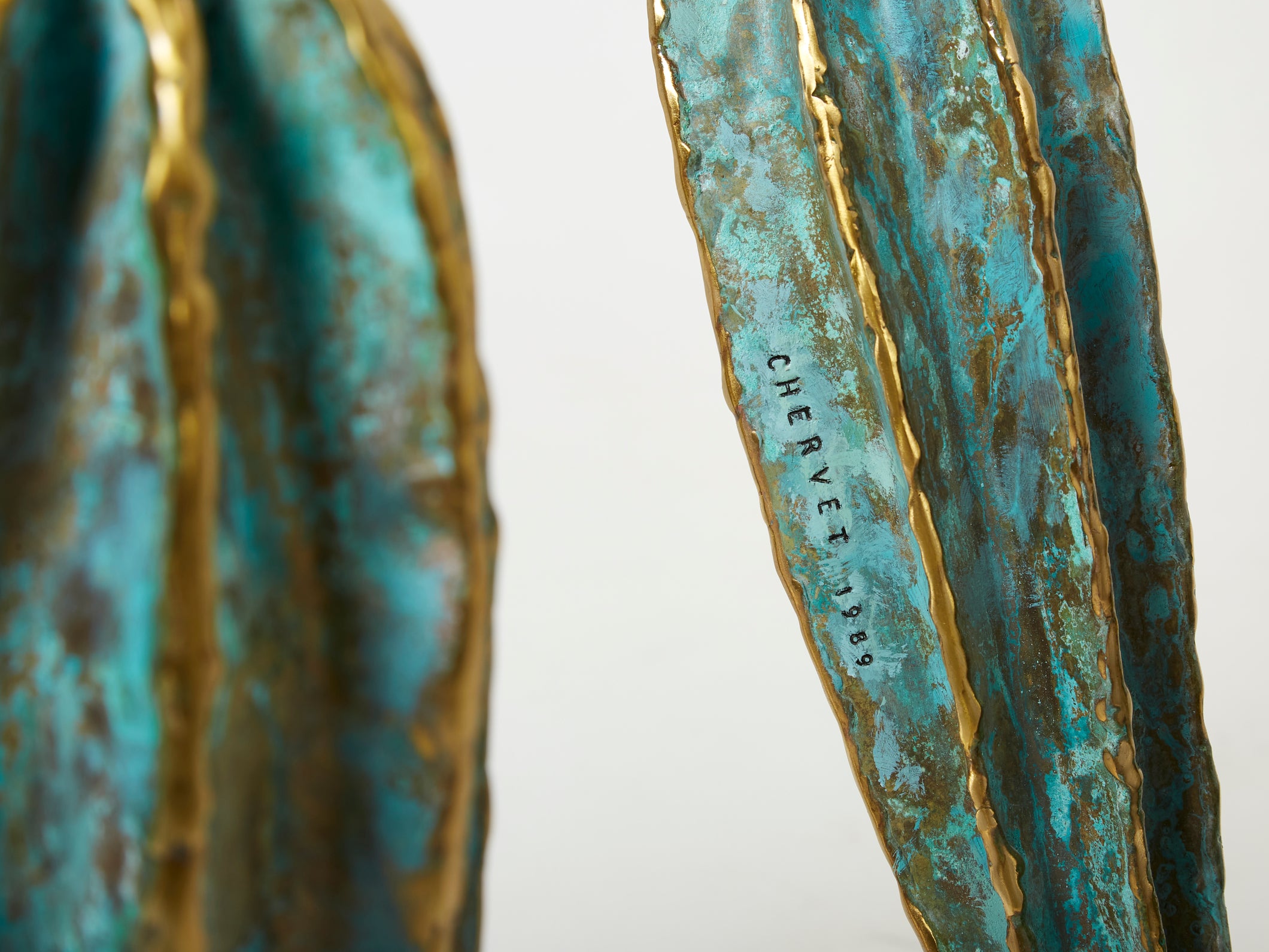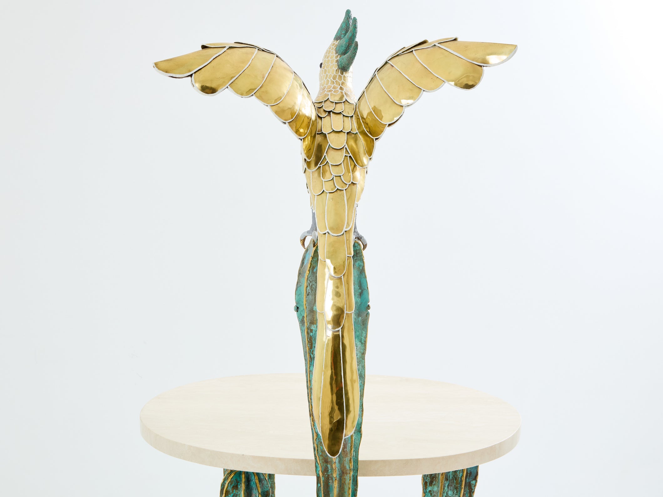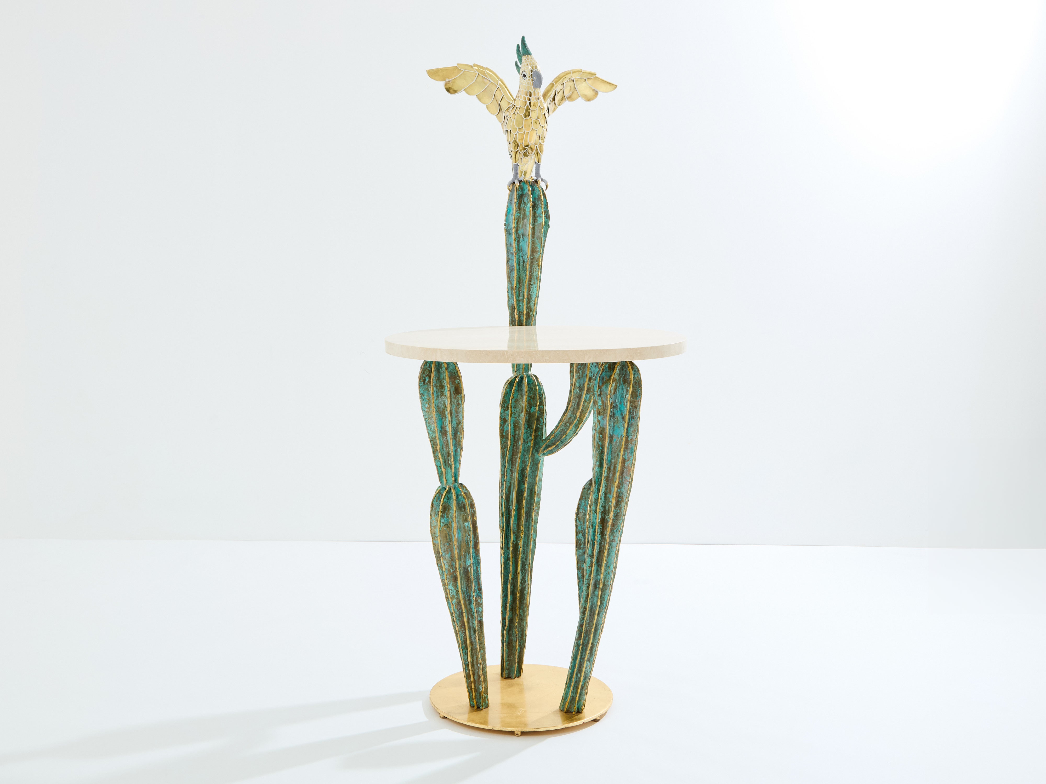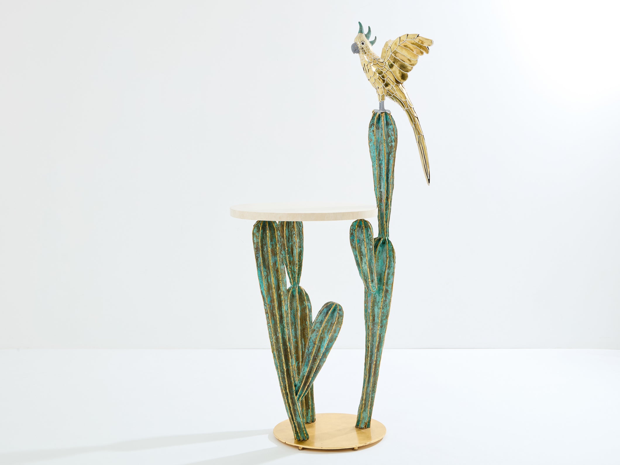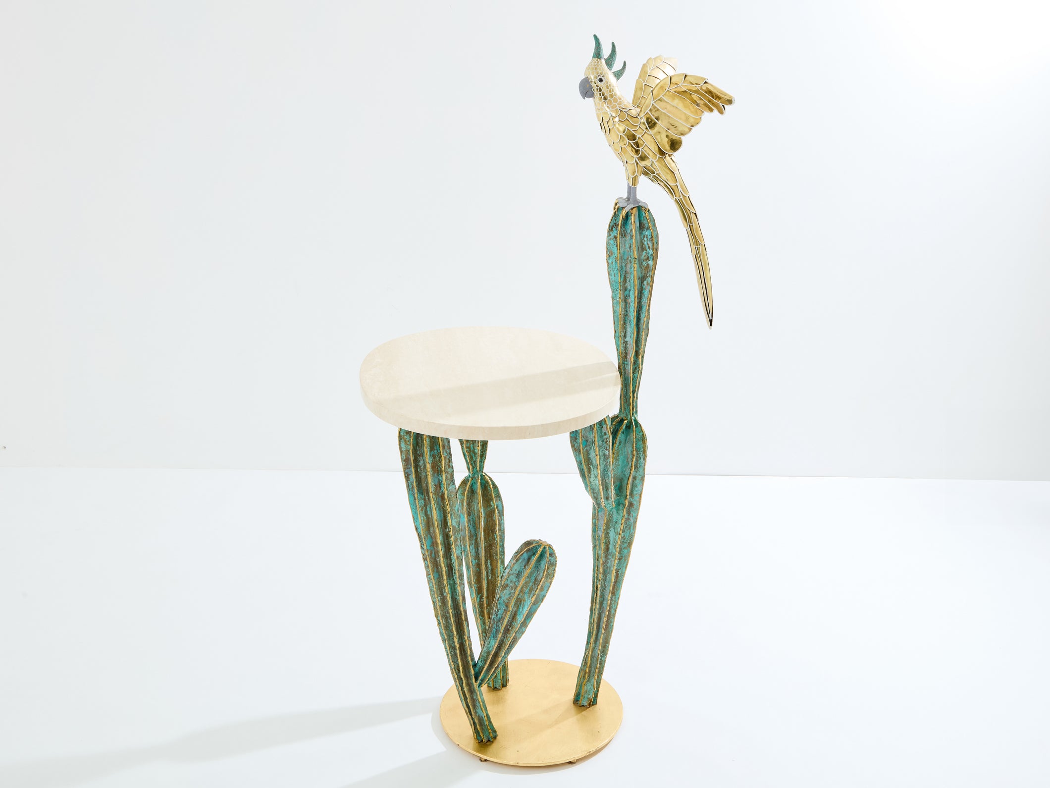 This unique cactus and parrot sculpture console table signed Alain Chervet was designed in 1989. The console base is made of gilt brass, supporting a beautiful vert de gris bronze cactus structure with an oval slick travertine top, and a brass decorated parrot, oil painted by the artist Arnaldo Montes Pinheiro. This sculptural piece of furniture is truly one of a kind. The Fauna et Flora theme, and rich patinated textures are imbued with Alain Chervet signature flair. The sculpture has been fully cleaned, revarnished, and is in an amazing condition.