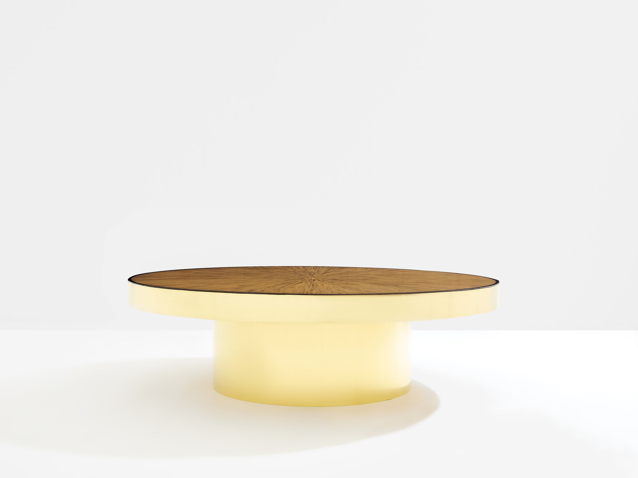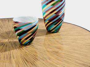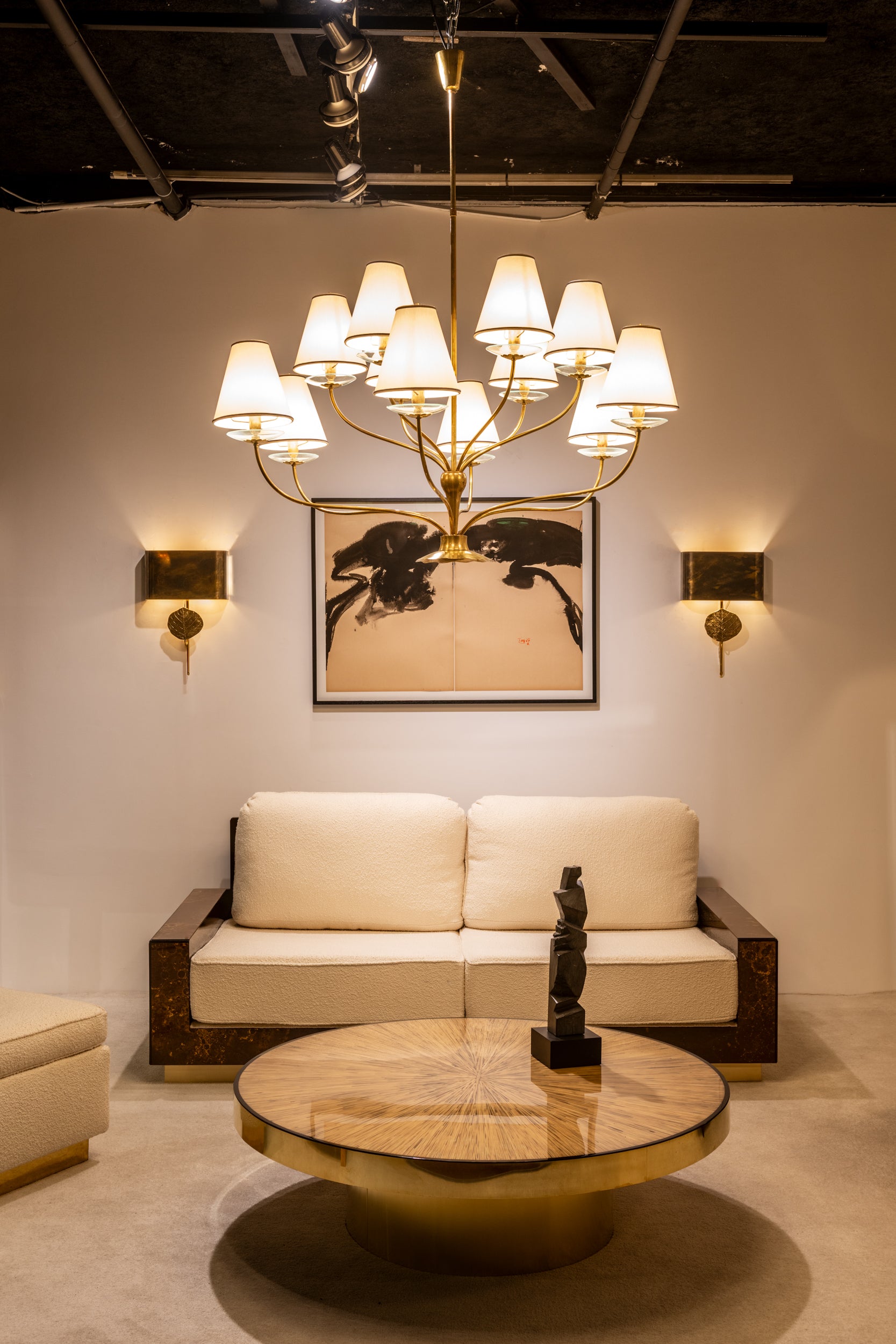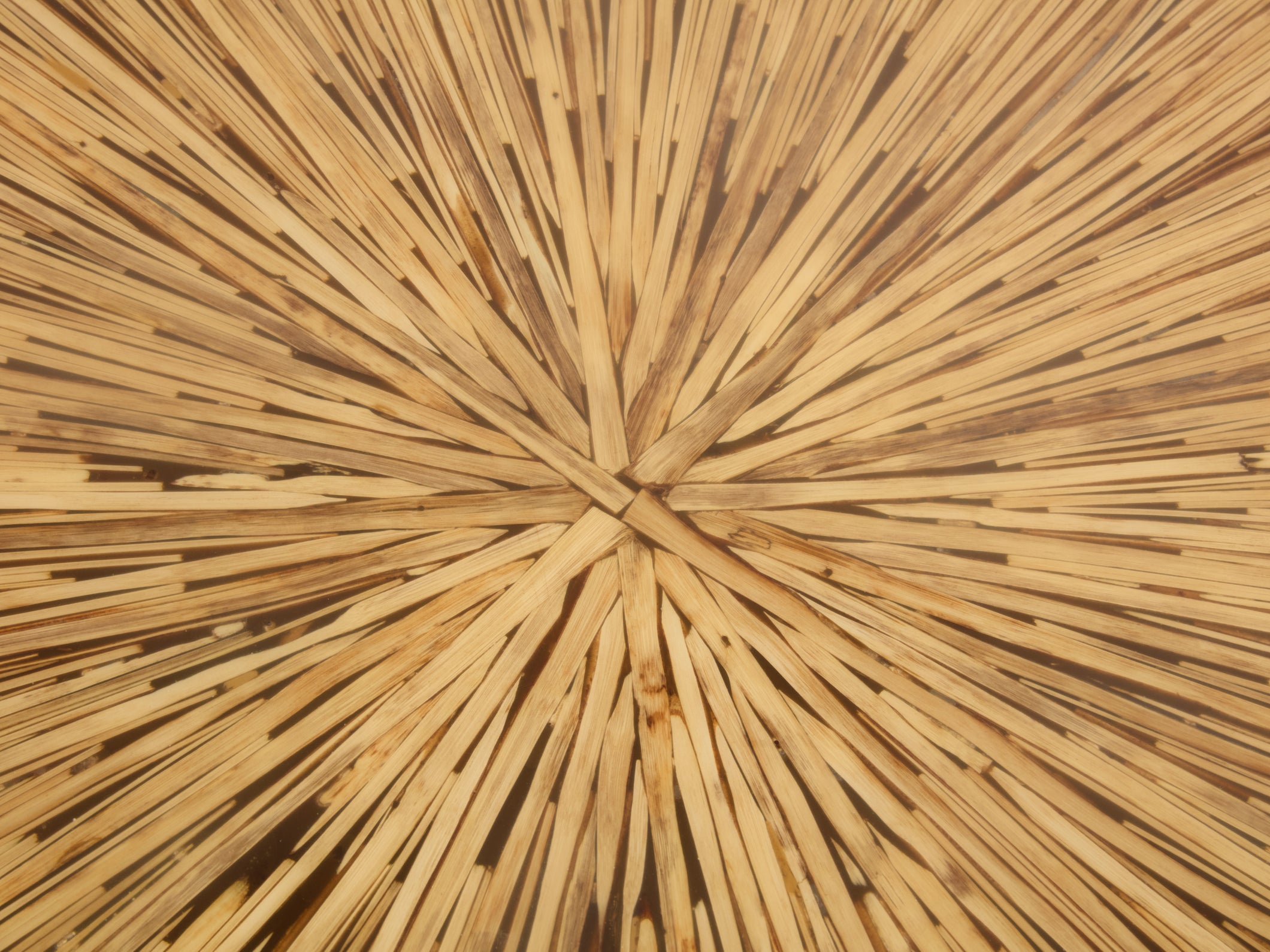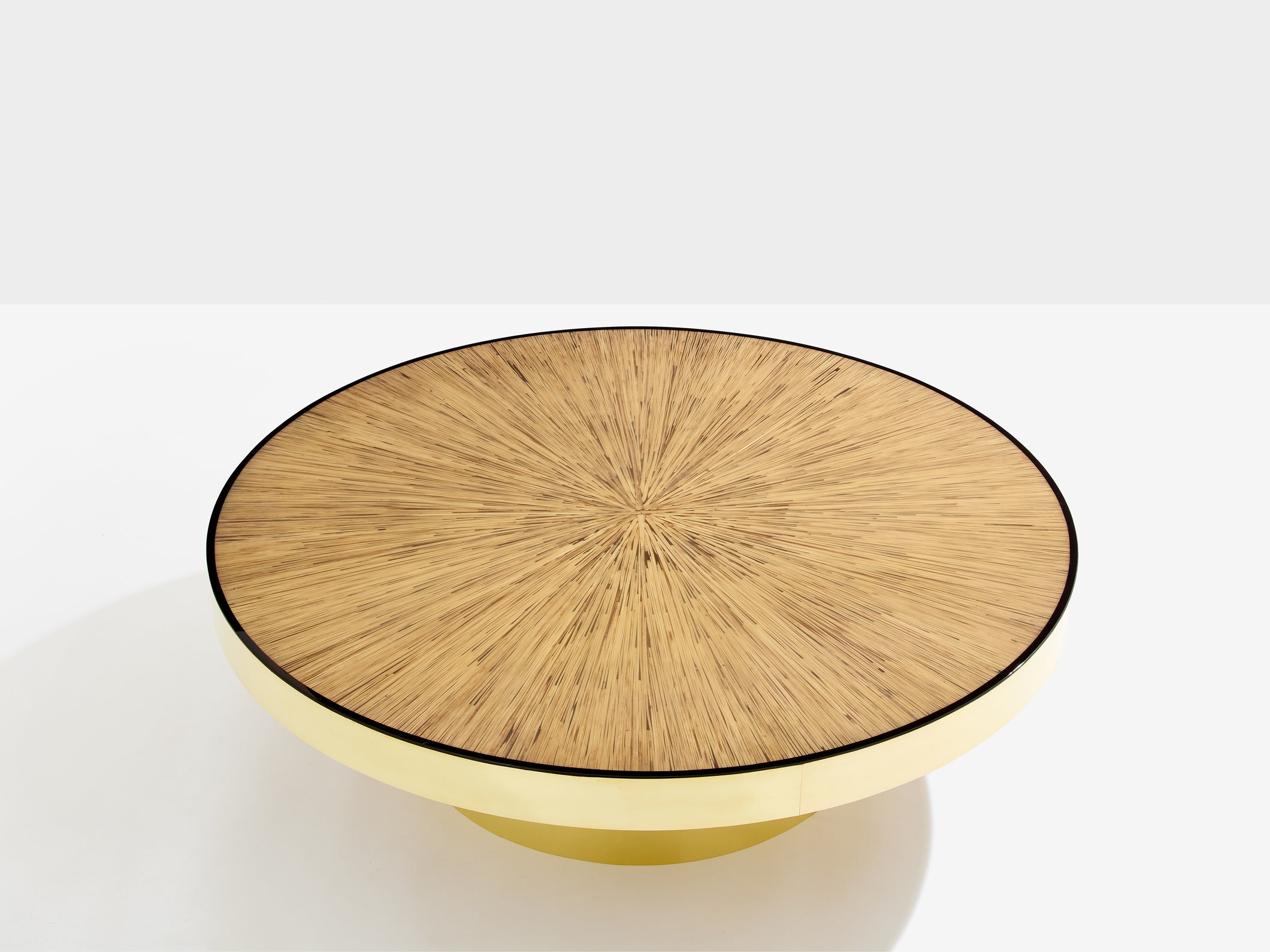 Beautiful coffee table, probably made to order by a French interior designer in the 1980s. Natural bamboo as the chief material, the patterned marquetry on the table top creates a beautiful symmetry, with an organic aesthetic, while the bright polished brass on the hooping and base adds an eye-catching touch. This table was purchased in Cannes, and the design is typical French Riviera, bamboo and brass being a signature of the region’s aesthetic in the 1970s and 1980s. The table has been fully restored, the top lacquered with a transparent lacquer, and the brass repolished. A beautiful piece, with a very nice decorative presence.