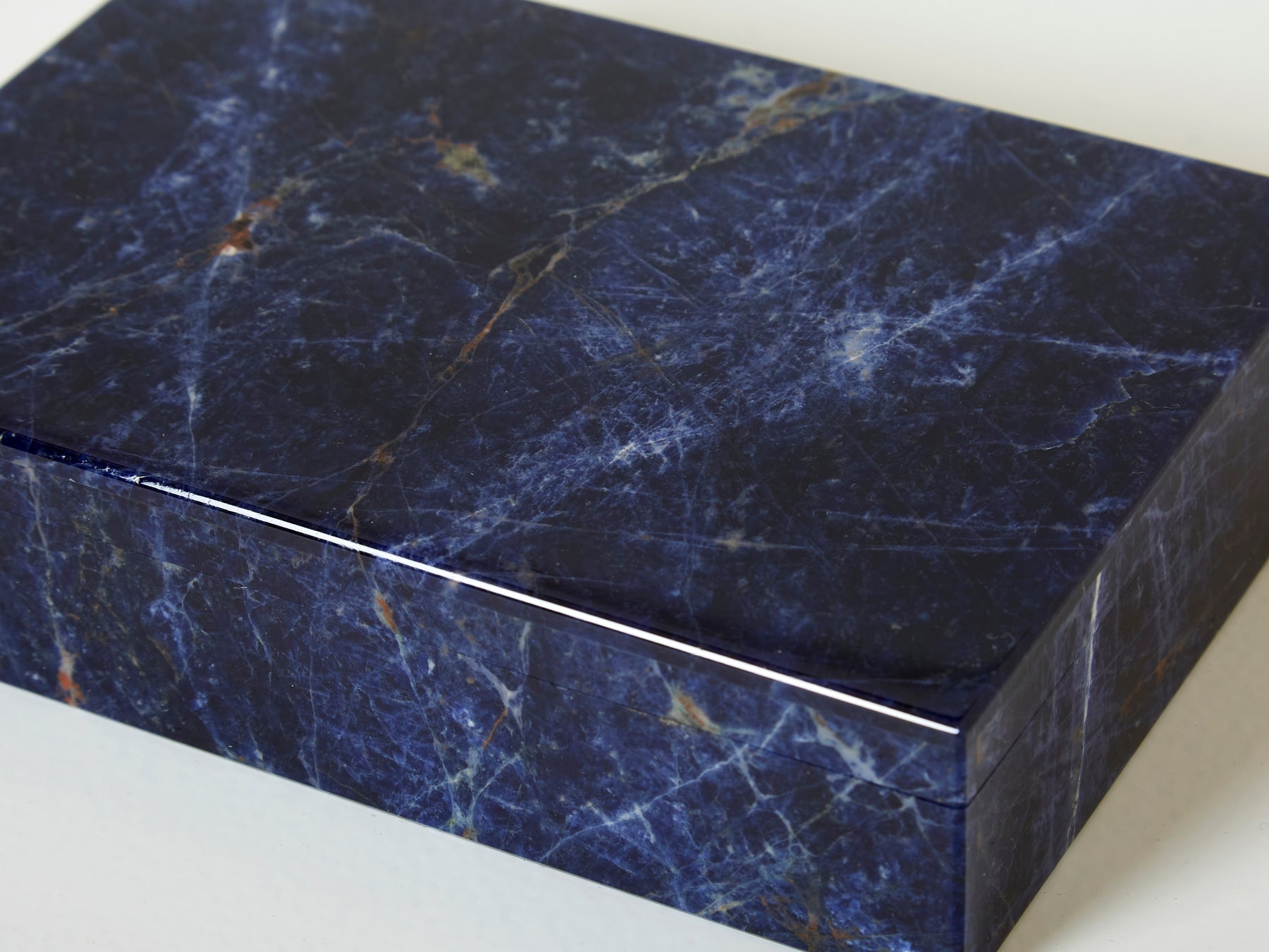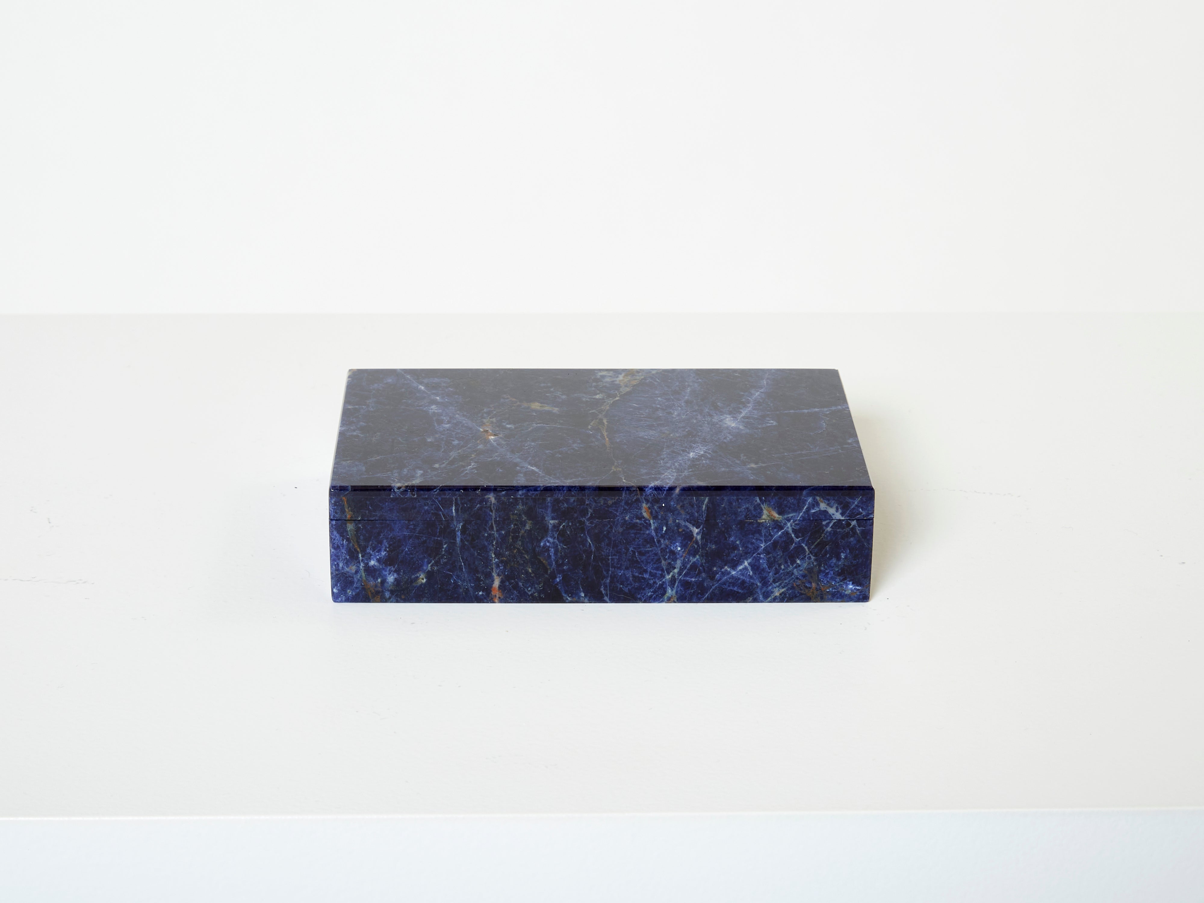 Beautiful blue Lapis Lazuli jewellery box made in the 1980s. Created from deep blue Lapis Lazuli, its interior is covered by white translucent onyx, with a brass hinge. A very nice piece, perfect as a gift, with a very nice decorative presence for a coffee table, console, or vanity, and found in an amazing condition.