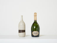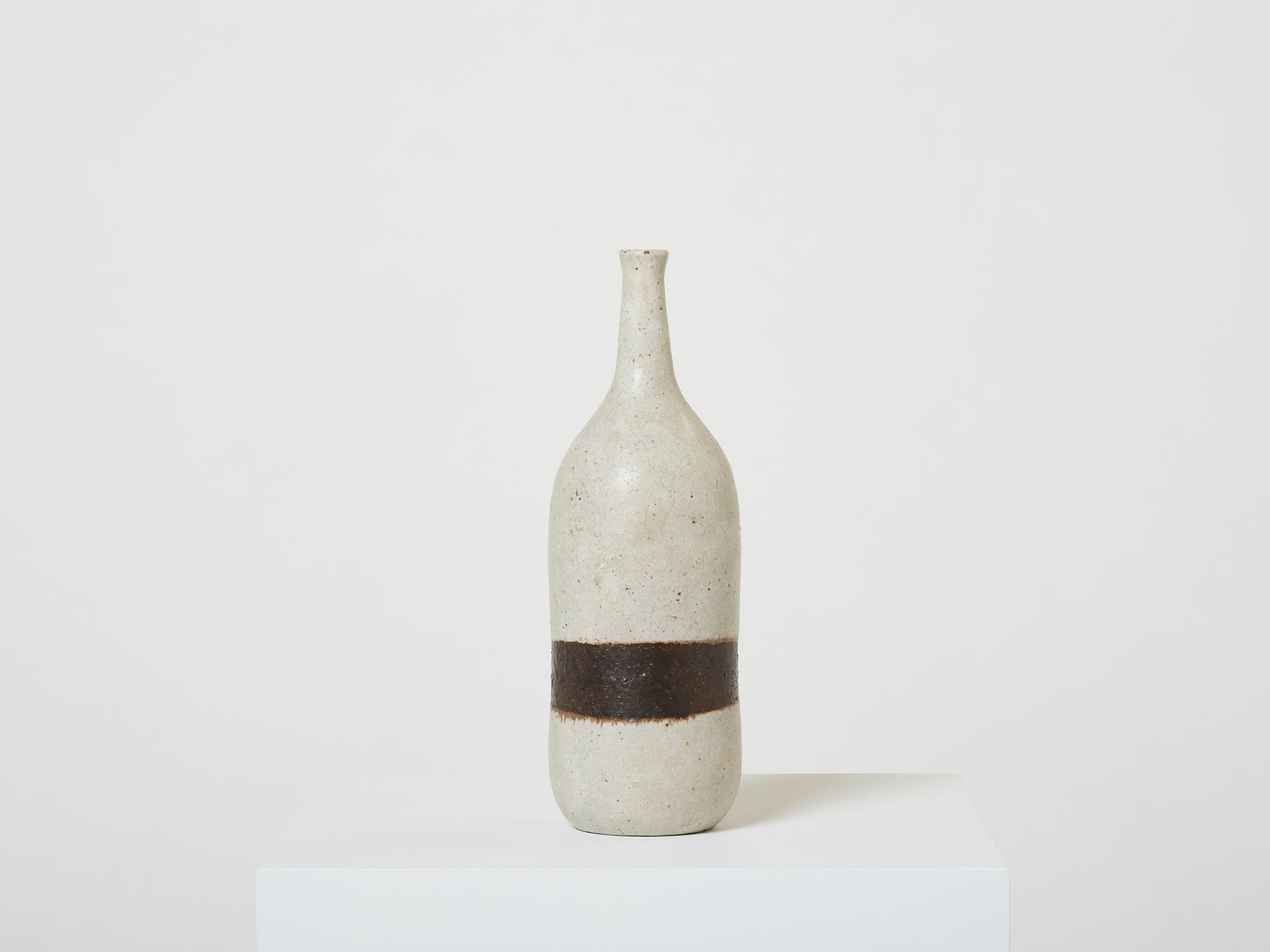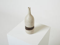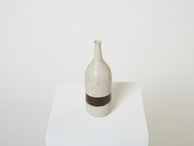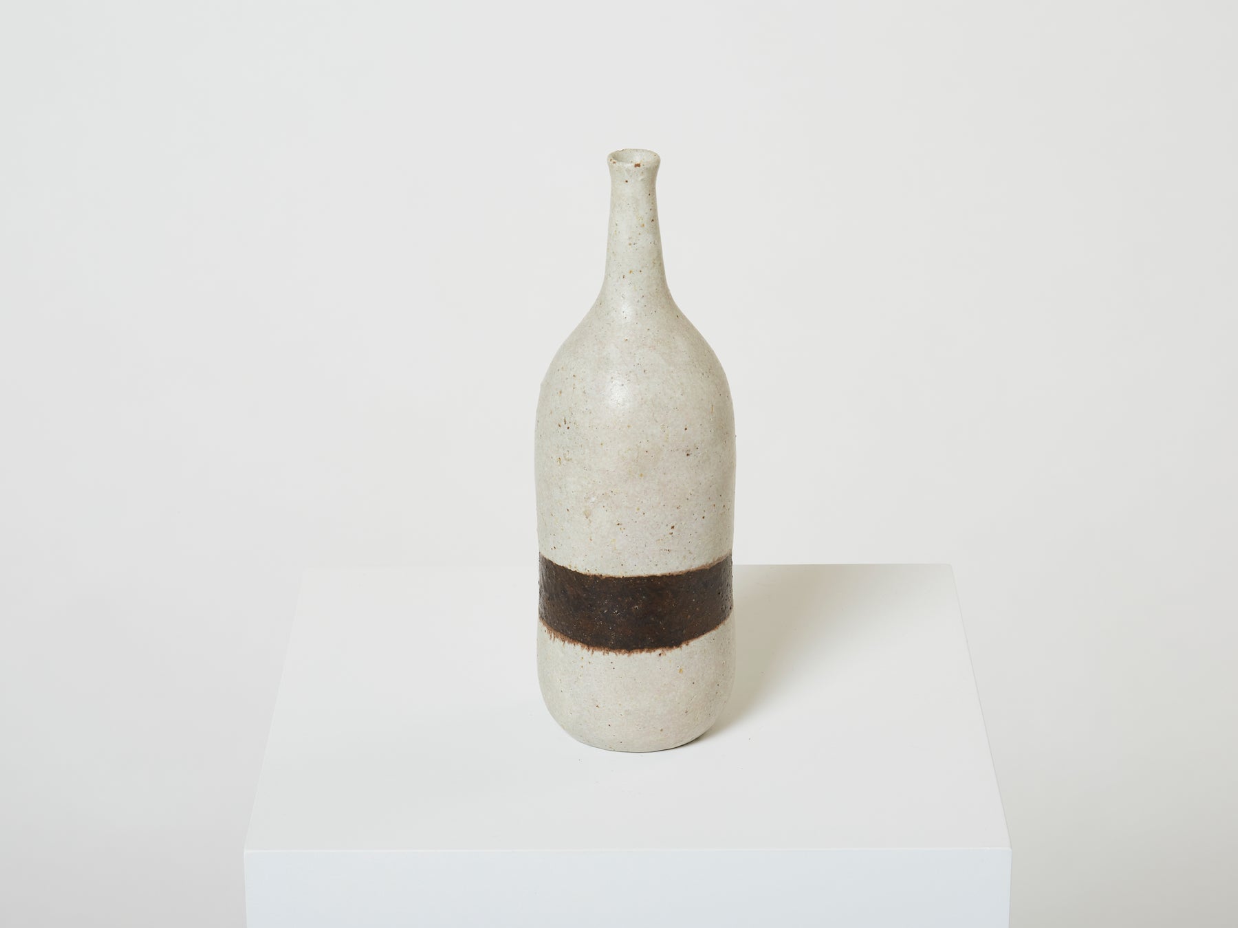 Beautiful Bruno Gambone greige glazed stoneware ceramic single flower vase, bottle shaped, made in the mid-1970s. This beautiful vase is typical of Bruno Gambone minimalistic design, with a single brown line. Bruno returned to Florence in 1969 to keep the ceramic studio running after his father Guido passed away, and started to express his own artistic touch, influenced by 1970s minimalist art, with simple lines and duo tones. Marked with glazed signature to underside Gambone. Found in a very good vintage condition.