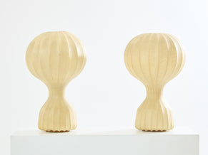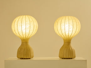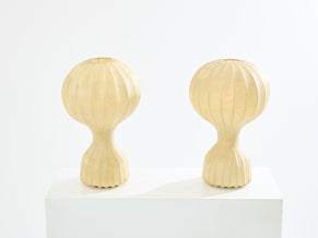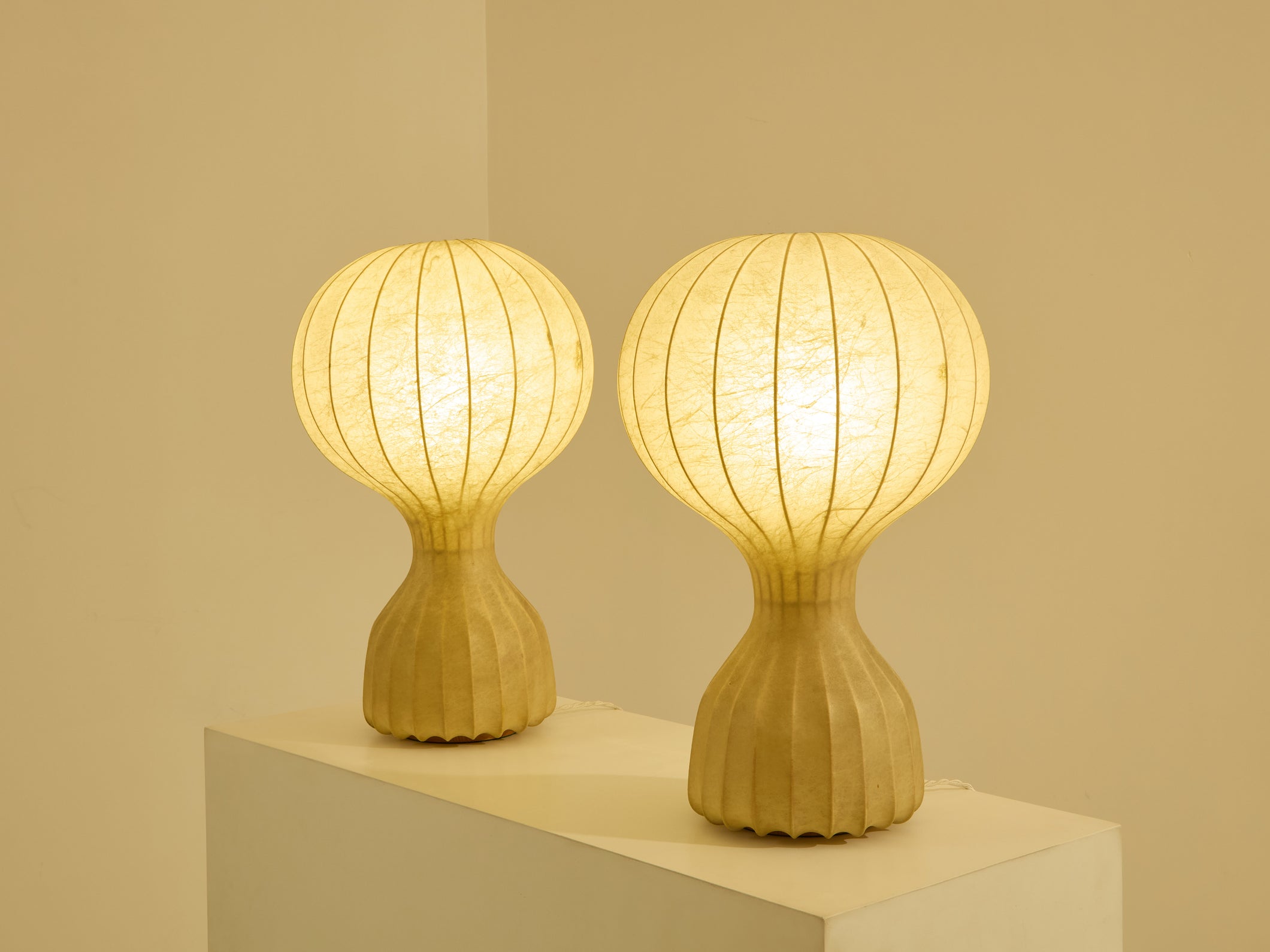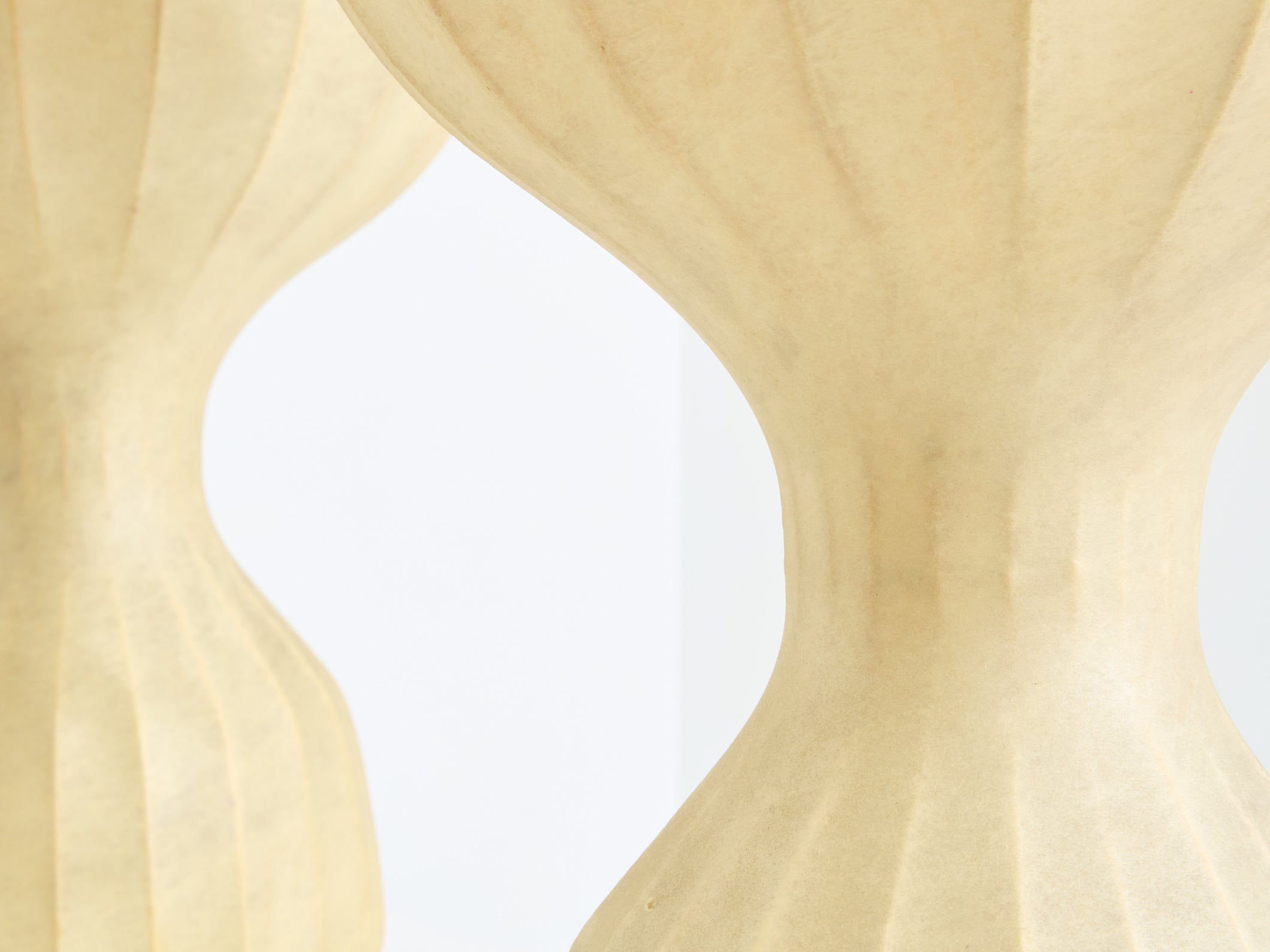 Pair of Gatto Grande first edition lamps designed by Achille and Pier Giacomo Castiglioni for Flos in the early 1960s. They feature their original white powder-coated metal structure, and diffuser made of cocoon resin sprayed onto the structure. Each lamp cocoon resin has an amazing light beige patina, giving a warm and cosy feeling even when lit off. They are found in an amazing condition considering their age. Both lamps are signed on the inside, and fully rewired.
