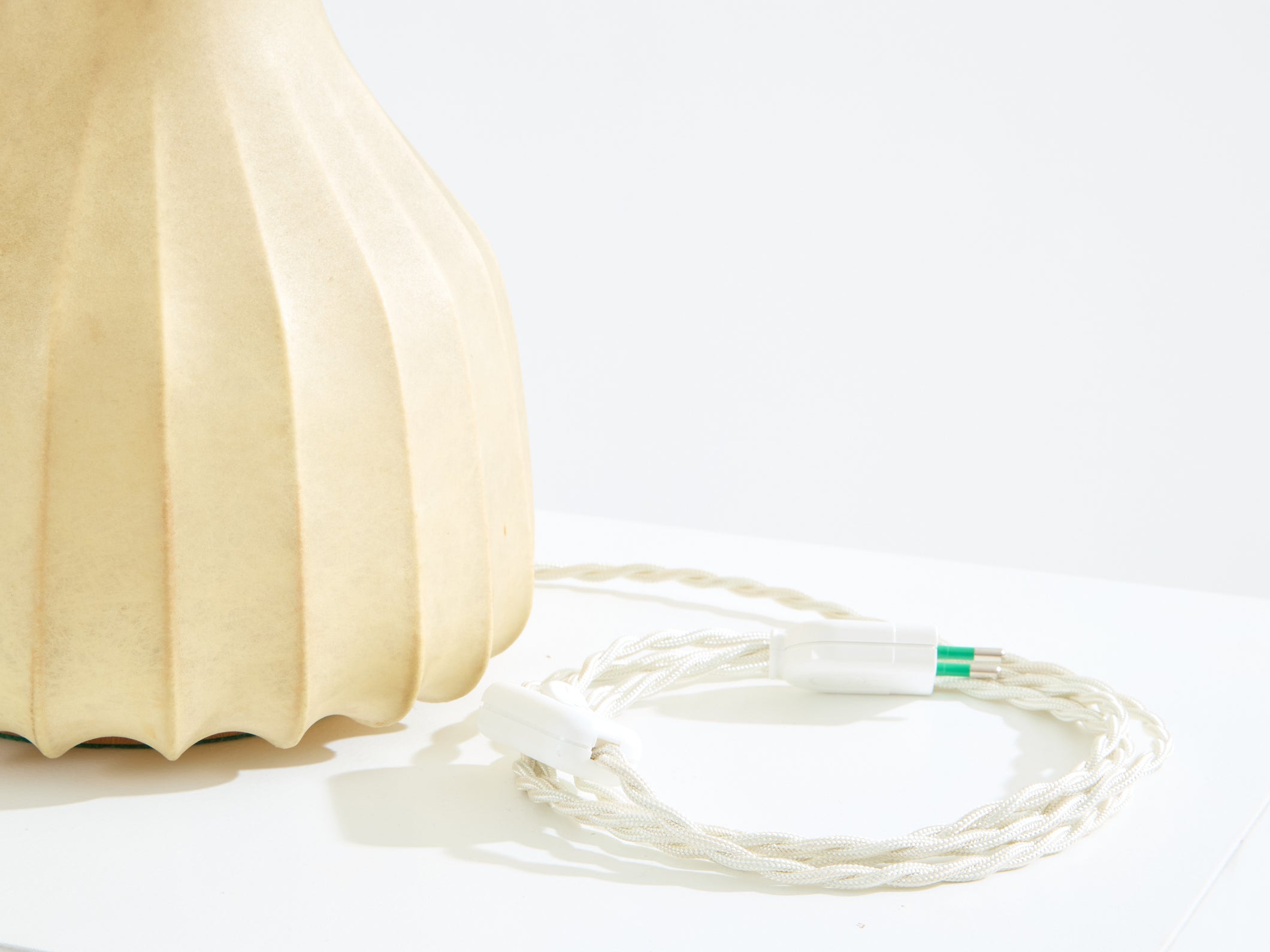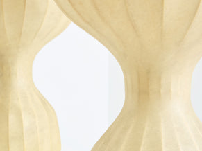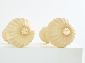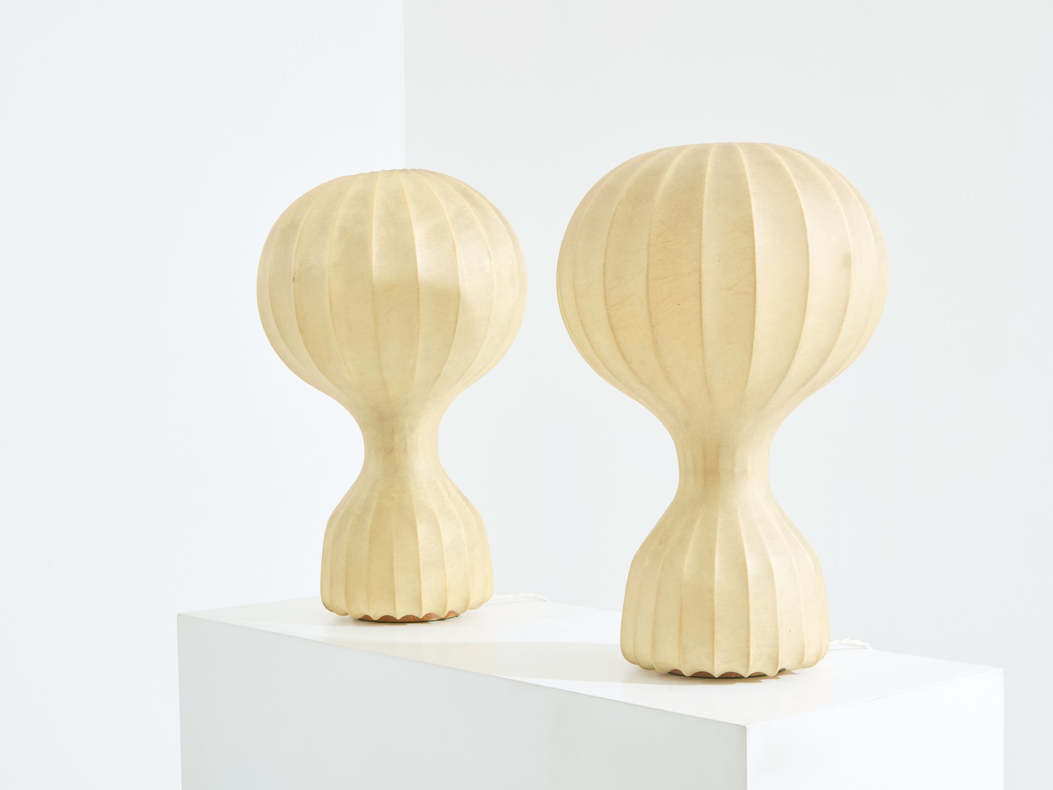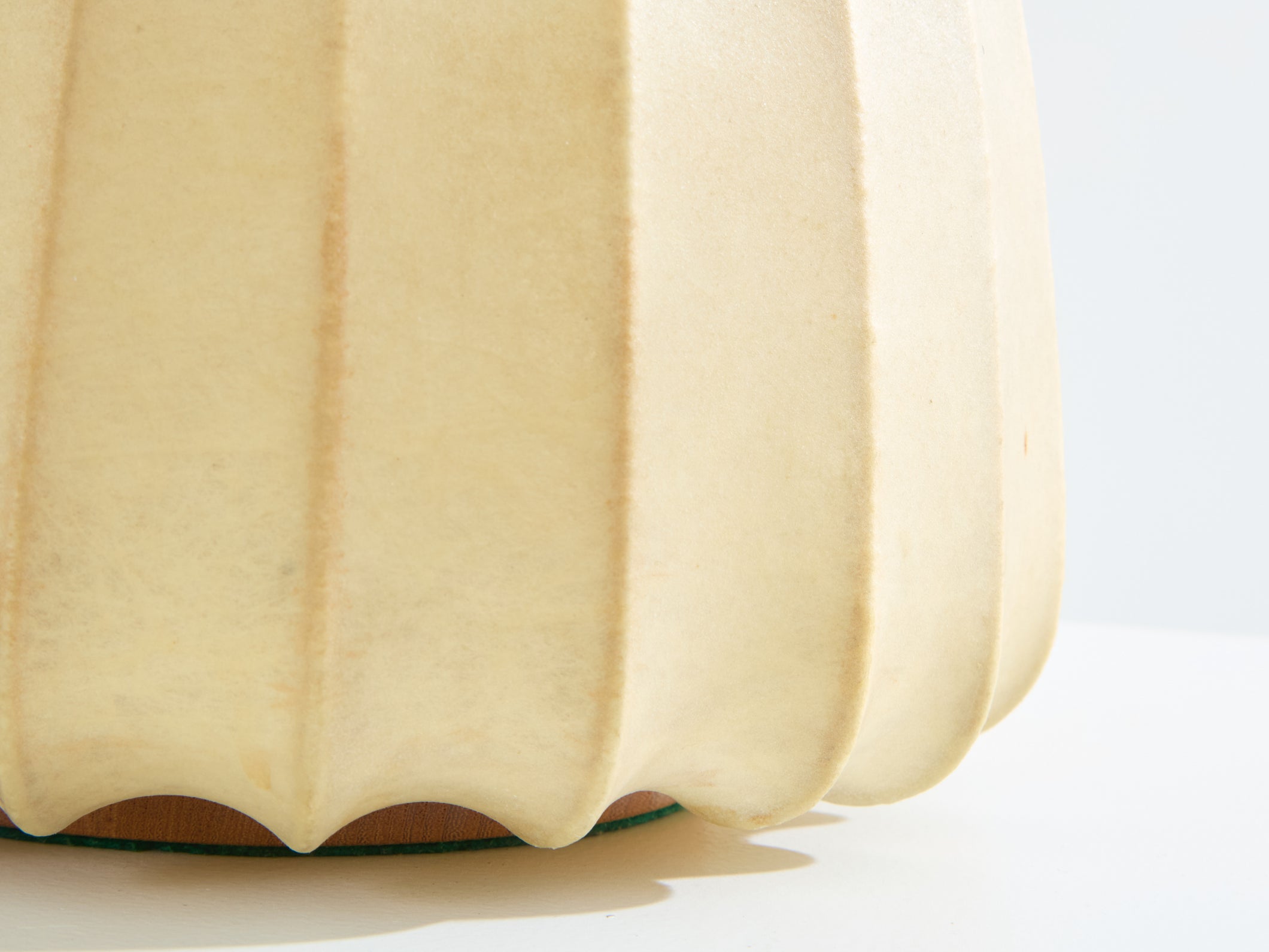 Pair of Gatto Grande first edition lamps designed by Achille and Pier Giacomo Castiglioni for Flos in the early 1960s. They feature their original white powder-coated metal structure, and diffuser made of cocoon resin sprayed onto the structure. Each lamp cocoon resin has an amazing light beige patina, giving a warm and cosy feeling even when lit off. They are found in an amazing condition considering their age. Both lamps are signed on the inside, and fully rewired.