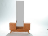 Warm sycamore maple, adorned with quality brass accents, is responsible for the cosy, romantic feeling that this piece effuses. The dressing table, with a strikingly tall mirror jutting up from its center, is emblematic of renowned art deco designer Suzanne Guiguichon’s precocious work; her designs were oft noted for being modern for their time. Its smooth, neutral surface and relatively simple design makes the piece ideal for contemporary bedrooms, infusing any space with a hint of the idealistic and dreamy world of the 1950’s. If desired as a full set, the double bed that was created with the dressing table is also available.