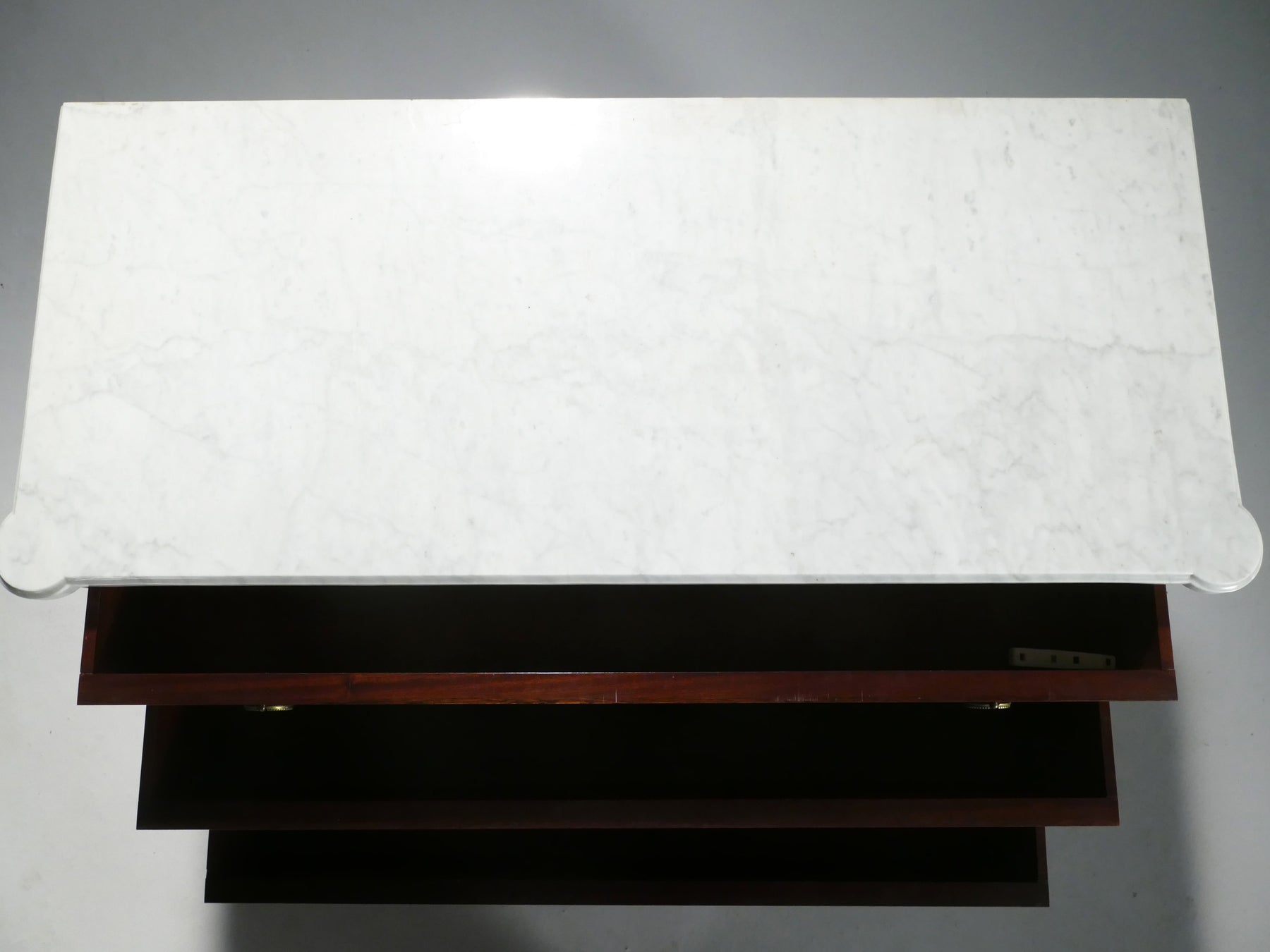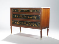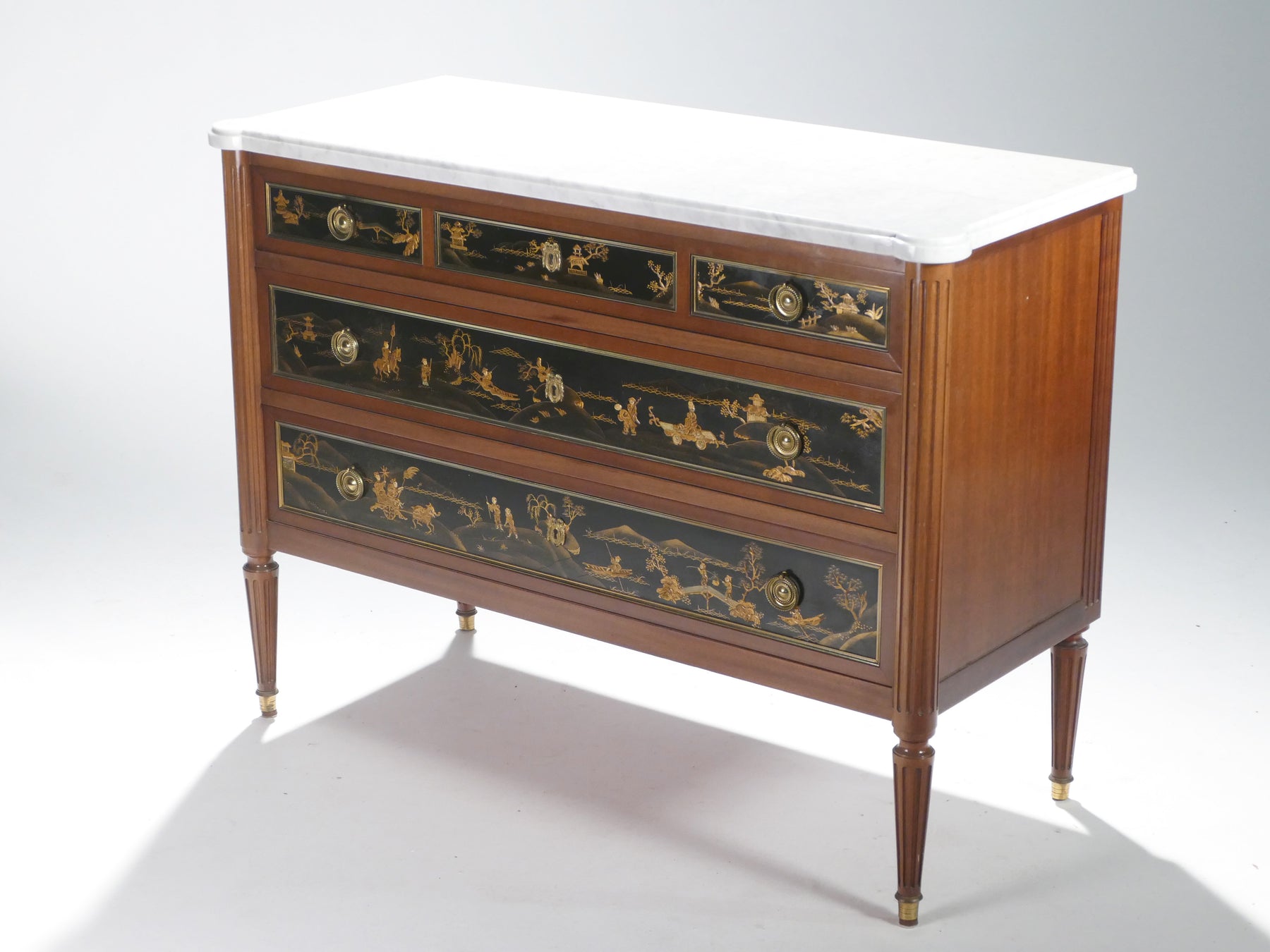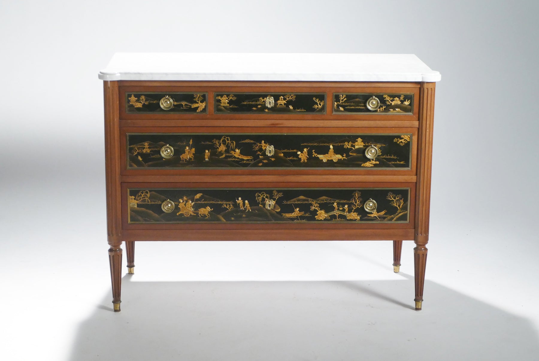 Created in the 1950s, this Maison Jansen stamped chest of drawers combines the refined symmetry of French neoclassicism with whimsical chinoiserie, making it an eye-catching work of art that’s also fully functional for your modern home. The warm mahogany base with brass accents and milky marble slab top contrast beautifully to add a touch of 19th century elegance to your space.