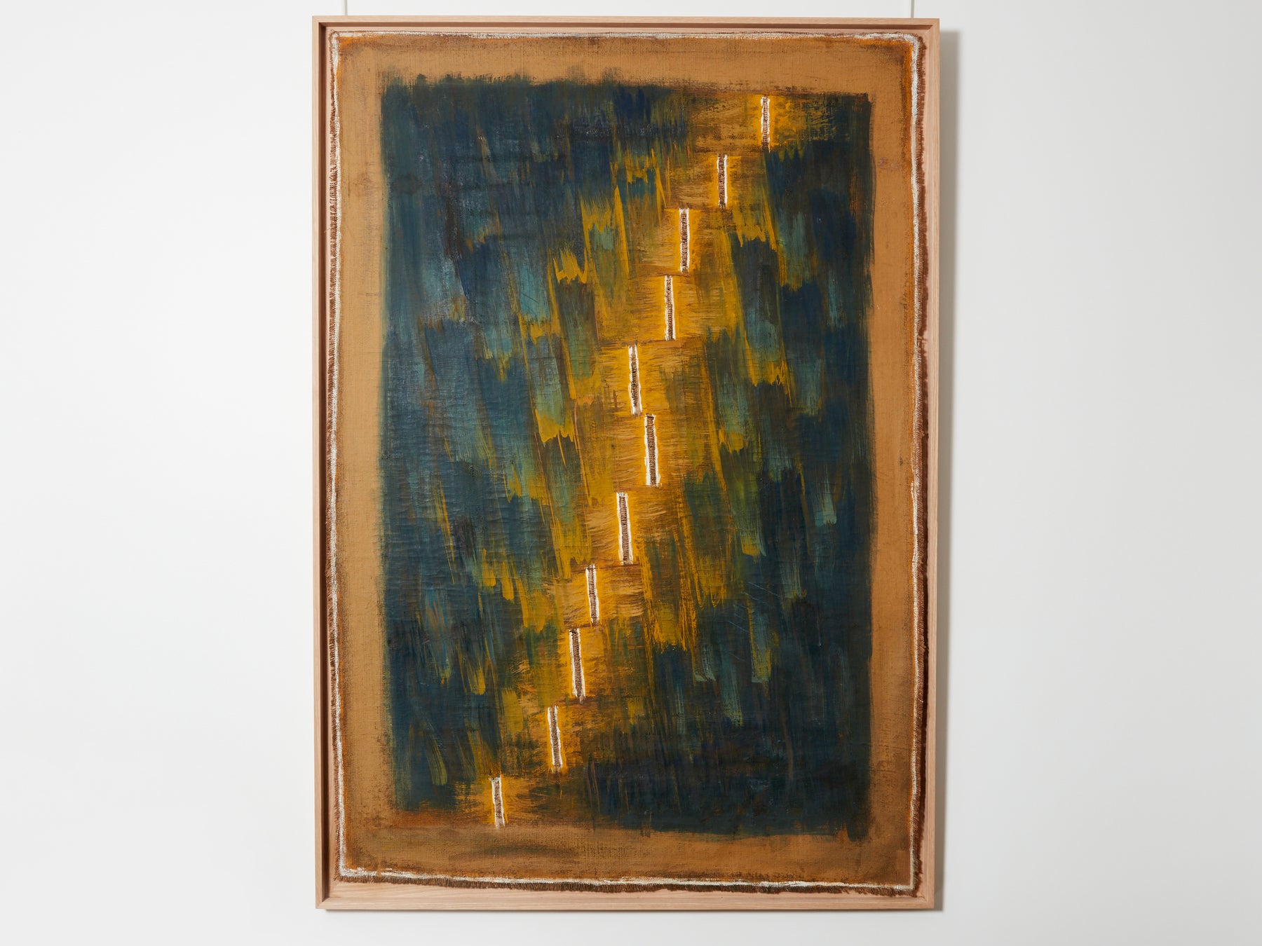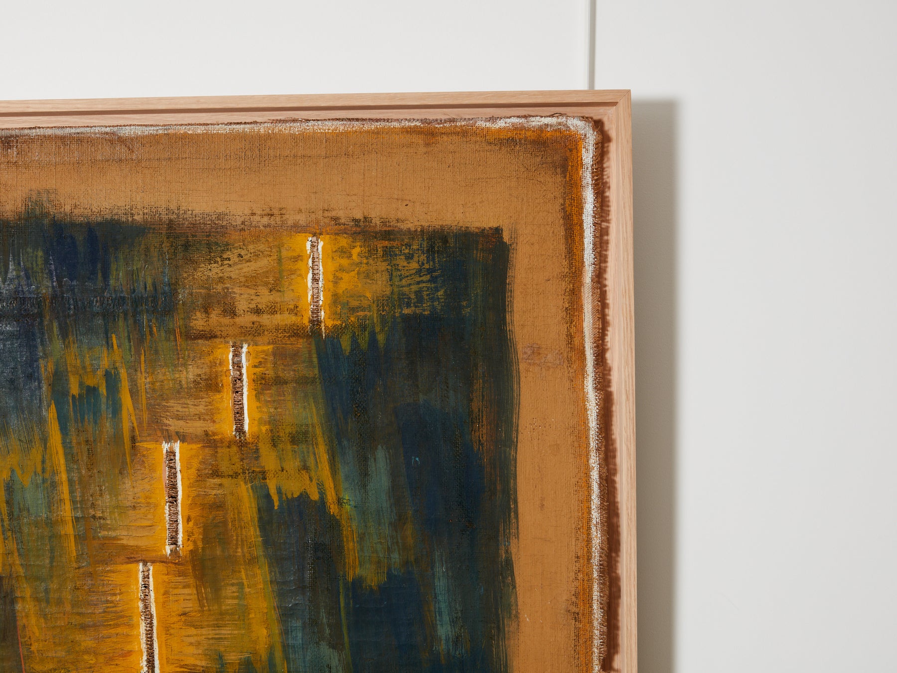 This is a large and powerful oil on toile de jute by Greek artist Daniel Panagopoulos, dit Danil, dated 1989 on the back. It’s been framed with an oak wood shadow box matching the jute color. The size includes the frame, the jute being 52 inches x 36.2 inches.