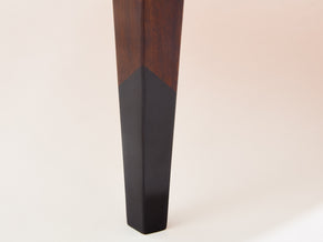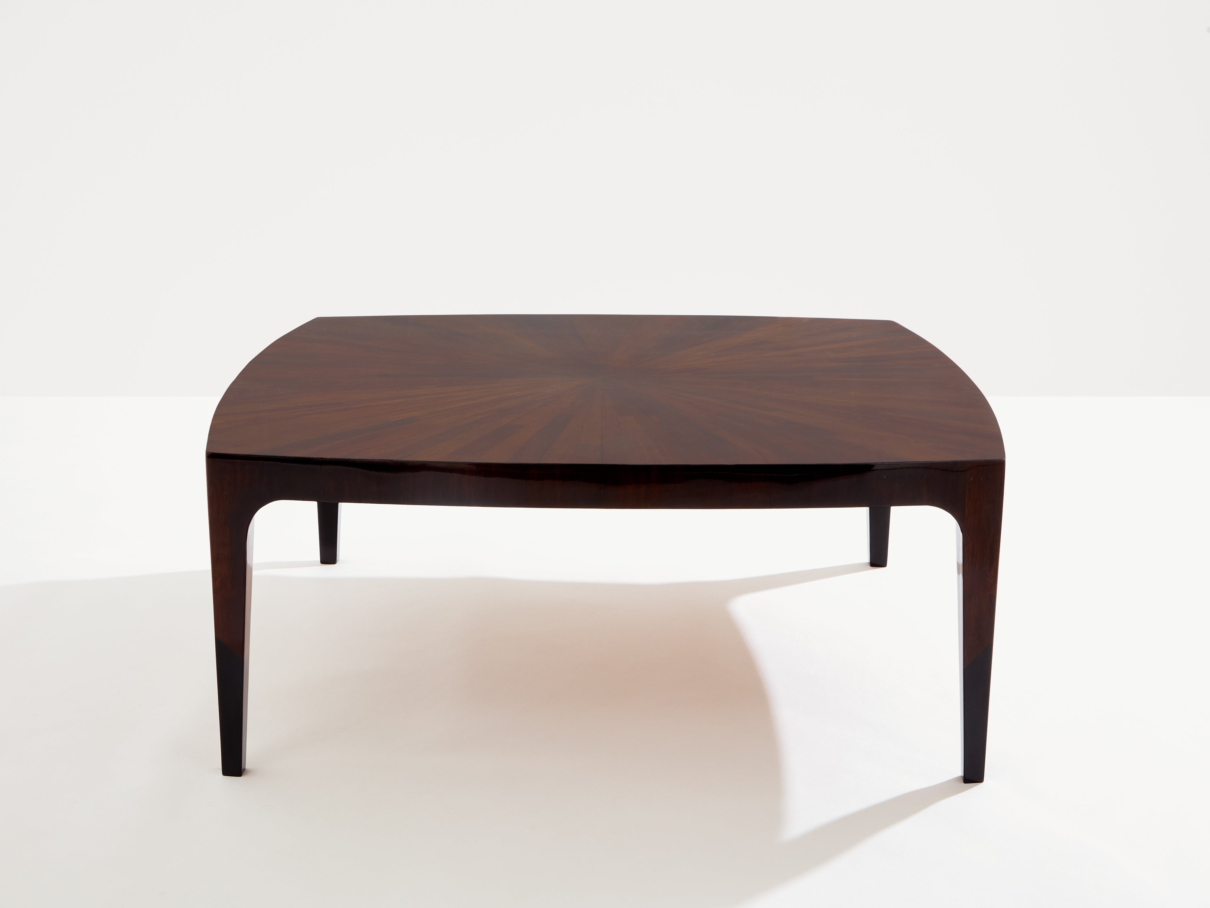 Beautiful coffee table made to order by an anonymous French cabinetmaker in the 1970s. Natural walnut as the chief material, the patterned marquetry on the table top creates a beautiful symmetry, with an organic aesthetic, while the slightly curved shape of the table and ebonized feet adds an eye-catching touch. The table has been fully restored and fully varnished. A beautiful piece, with a very nice decorative presence.