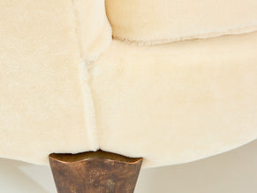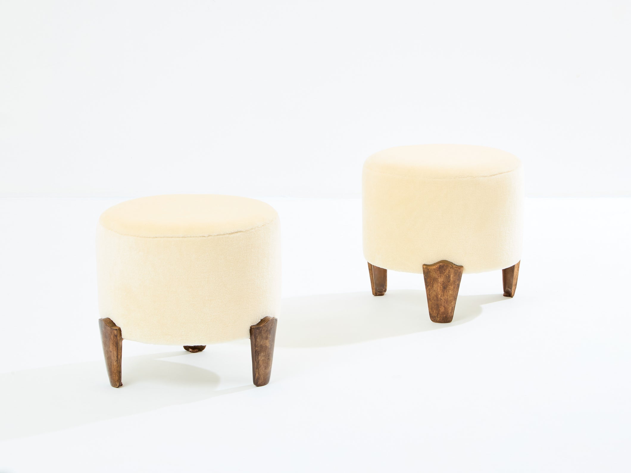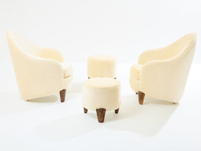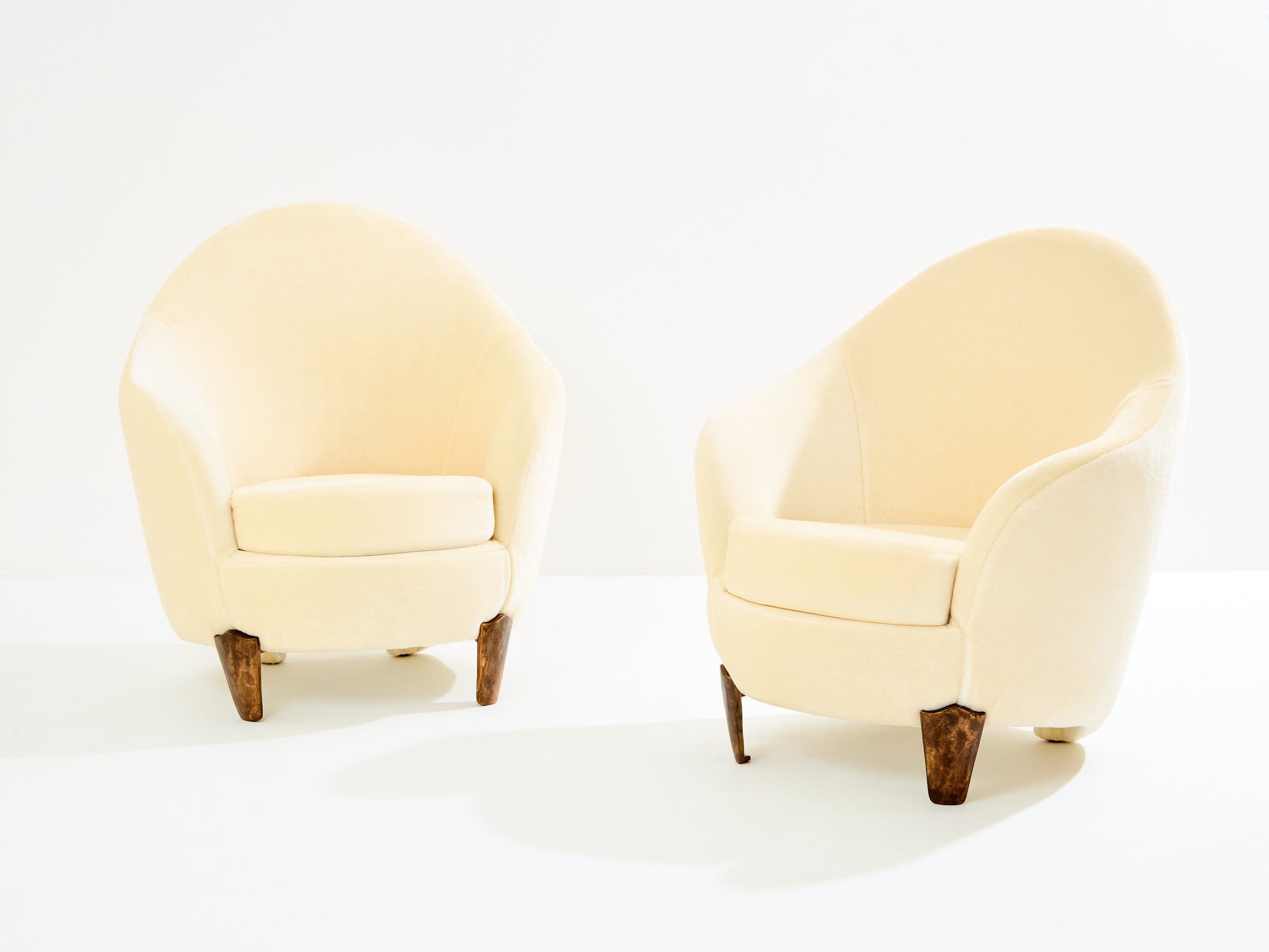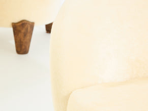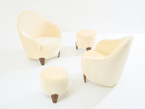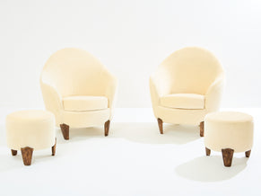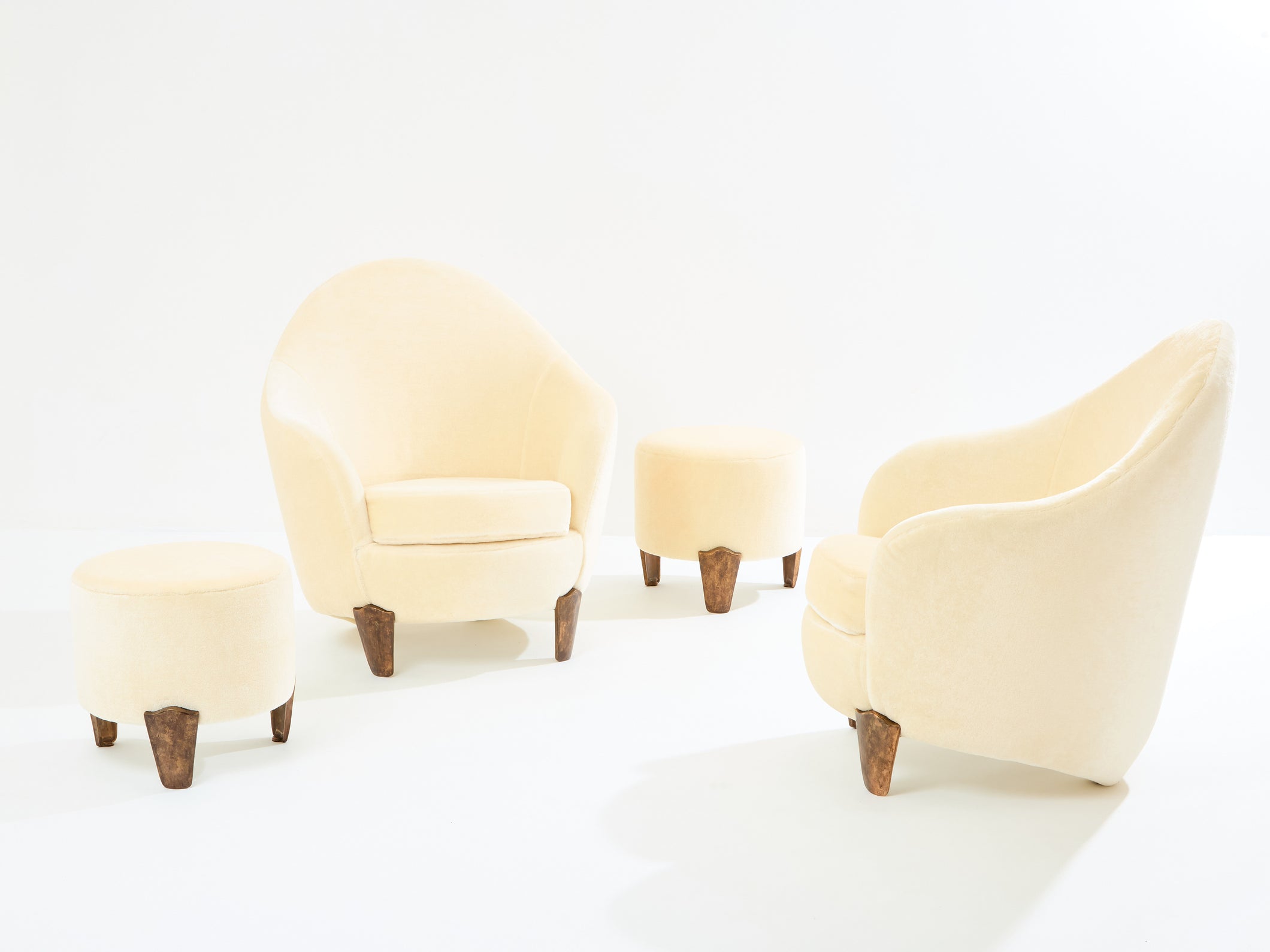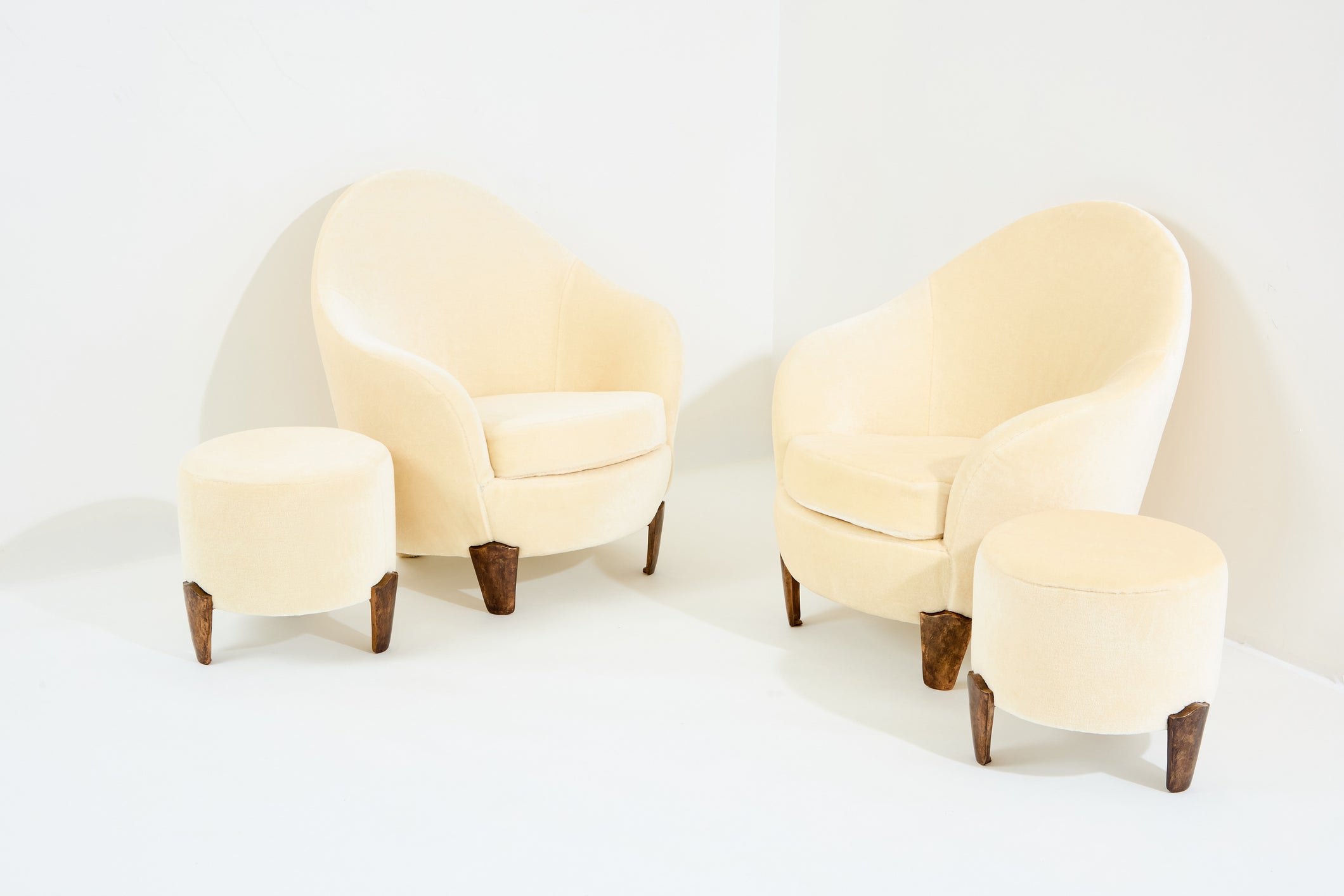 This is a beautiful pair of armchairs with their ottomans by Elizabeth Garouste & Mattia Bonetti, model Koala, with solid bronze feet, fully restored and reupholstered. Garouste & Bonetti began their collaboration and gained global recognition for their interior design of the Paris nightclub Le Palace in 1979. These models of Koala armchairs and stools were designed by the duo in 1995, and edited by BGH Edition. Each foot is stamped B.G. They have been newly upholstered using an off white pure mohair velvet, which is incredibly comfortable and soft, suiting these armchairs perfectly. This is an opportunity to purchase a part of modern design history, these pieces being iconic ones from Elizabeth Garouste & Mattia Bonetti. The ottomans dimensions, diameter 16.55 inches x height 15.35 inches.