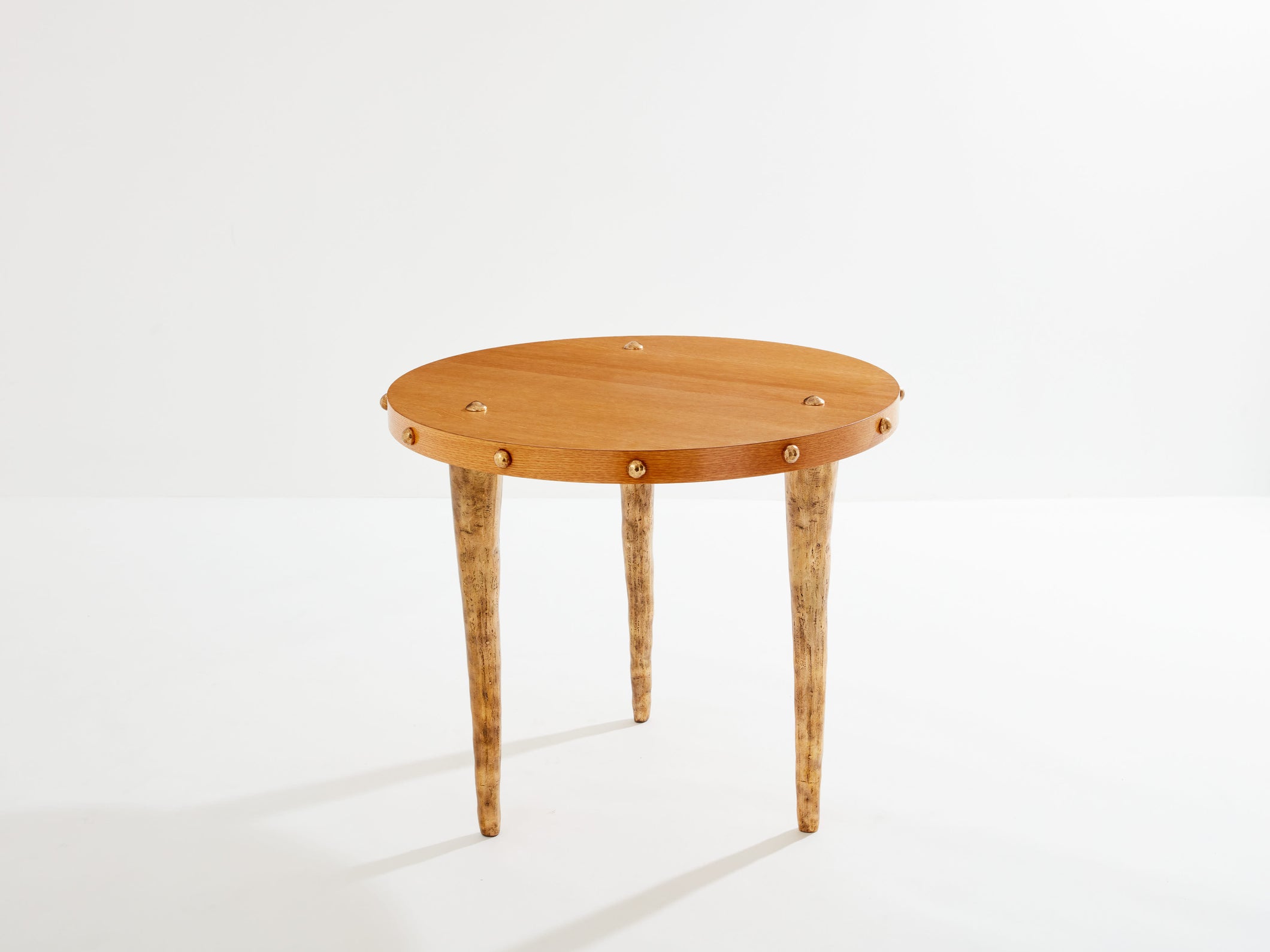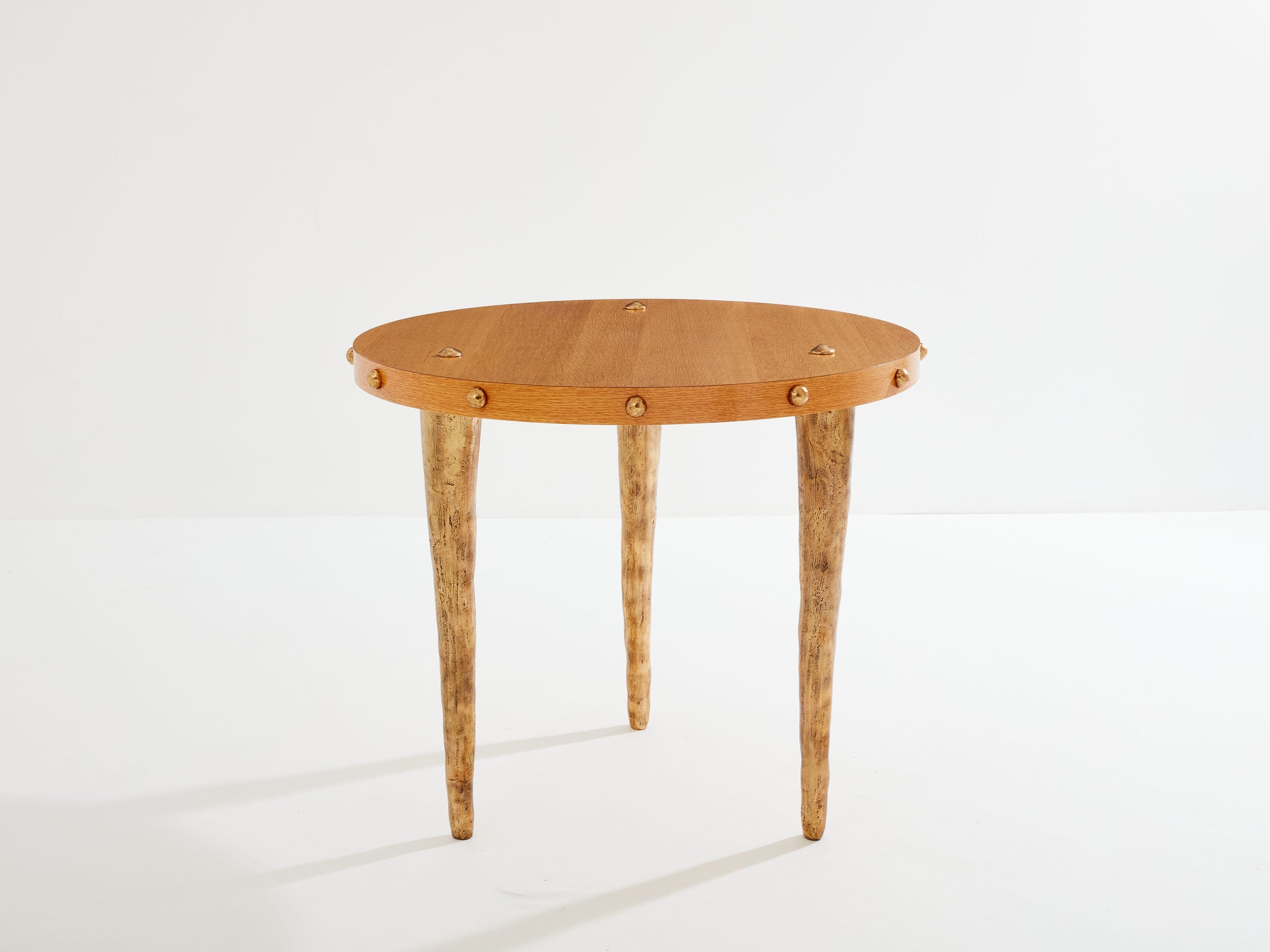 Nice gueridon table by Elizabeth Garouste & Mattia Bonetti, designed in 1987 by the iconic duo, and edited by B.G.H. Editions. The three large feet are made in solid patinated bronze, topped by an oakwood round top adorned with gilt and patinated bronze elements. This is clearly a statement piece, especially for those that believe passionate expressions of creativity go hand-in-hand with interior design. The piece is emblematic of the design duo’s commitment to avant-garde, romantic style, and is highly decorative. It has been fully restored, bronze lightly cleaned and revarnished, respecting its original patina.