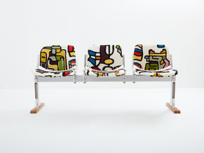 This bench, designed by Giancarlo Piretti for Anonima Castelli, was crafted in Italy and dates back to 1970. The piece features three seats mounted on a metal frame with oak wood feet, connected to the bench's skeleton by visible steel elements. The seats have been reupholstered with a Pierre Frey fabric adorned with abstract patterns forming a vibrant geometric composition. The combination of Piretti's creation and the fabric from Pierre Frey gives the piece a unique allure, making it a focal point in any decorative arrangement. The structure has been fully restored, and is found in a great vintage condition.