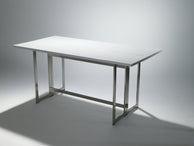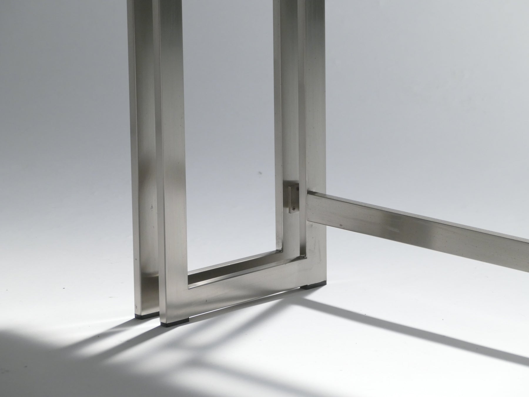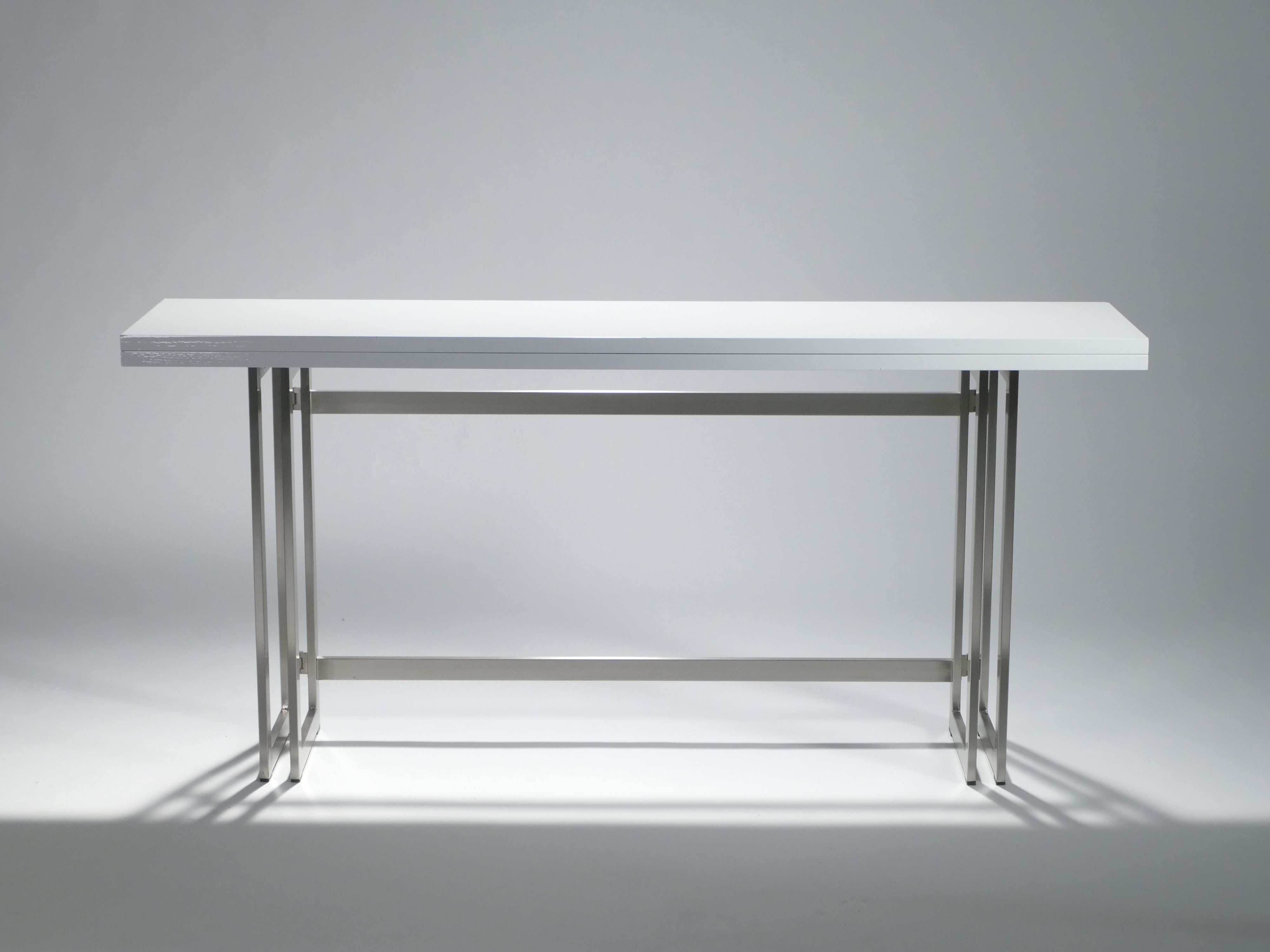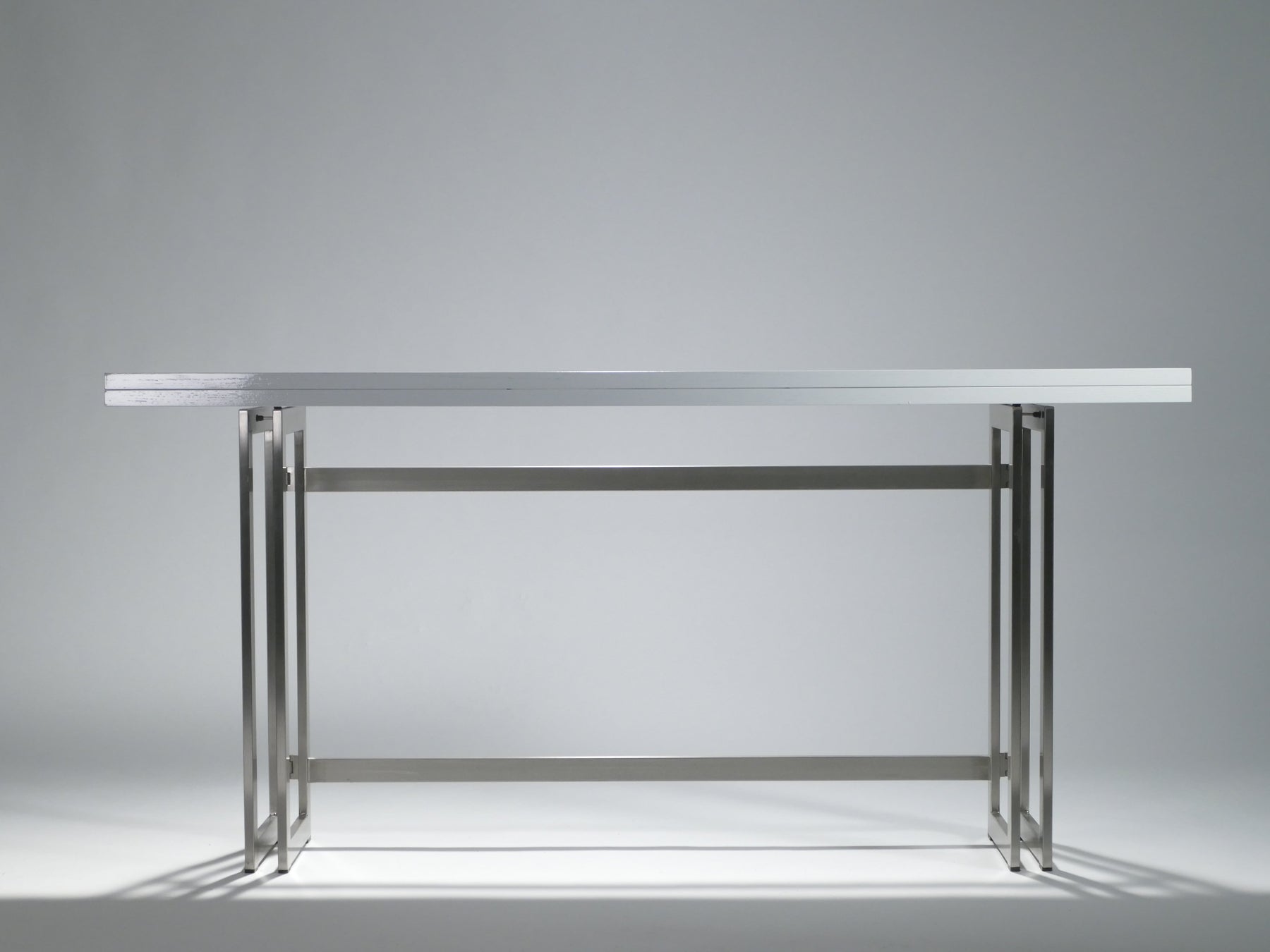 With a shining white lacquered top, sharply geometric brushed metal legs and a foldable body to fit your particular spatial needs, this console table carries a stellar futuristic mid-century aesthetic into the contemporary home. The angular appearance of the table is as notable as its overall structure, which can be expanded or condensed on a whim, perfect for the changing desires of a given room.