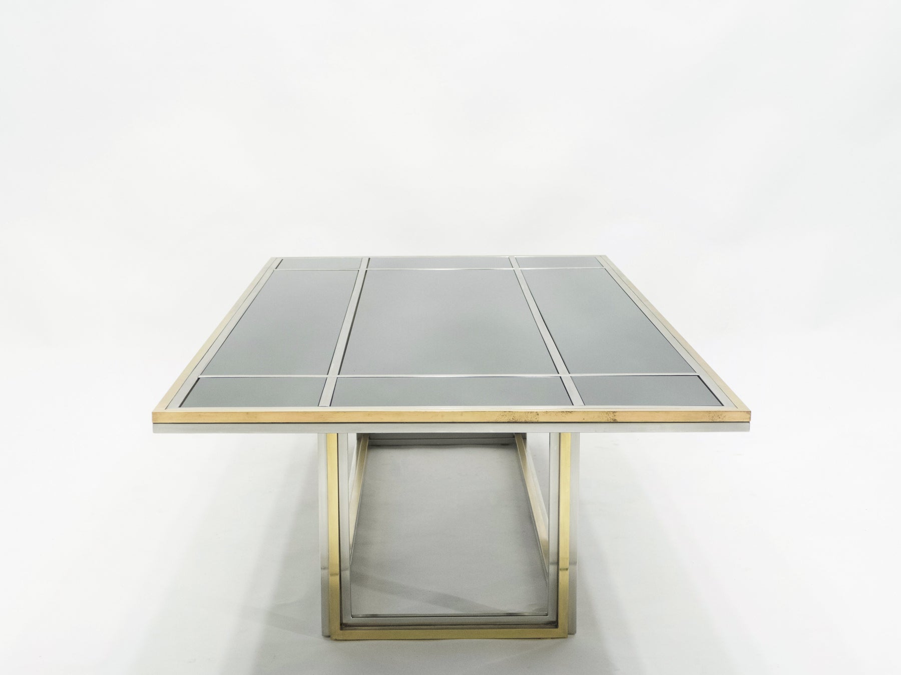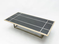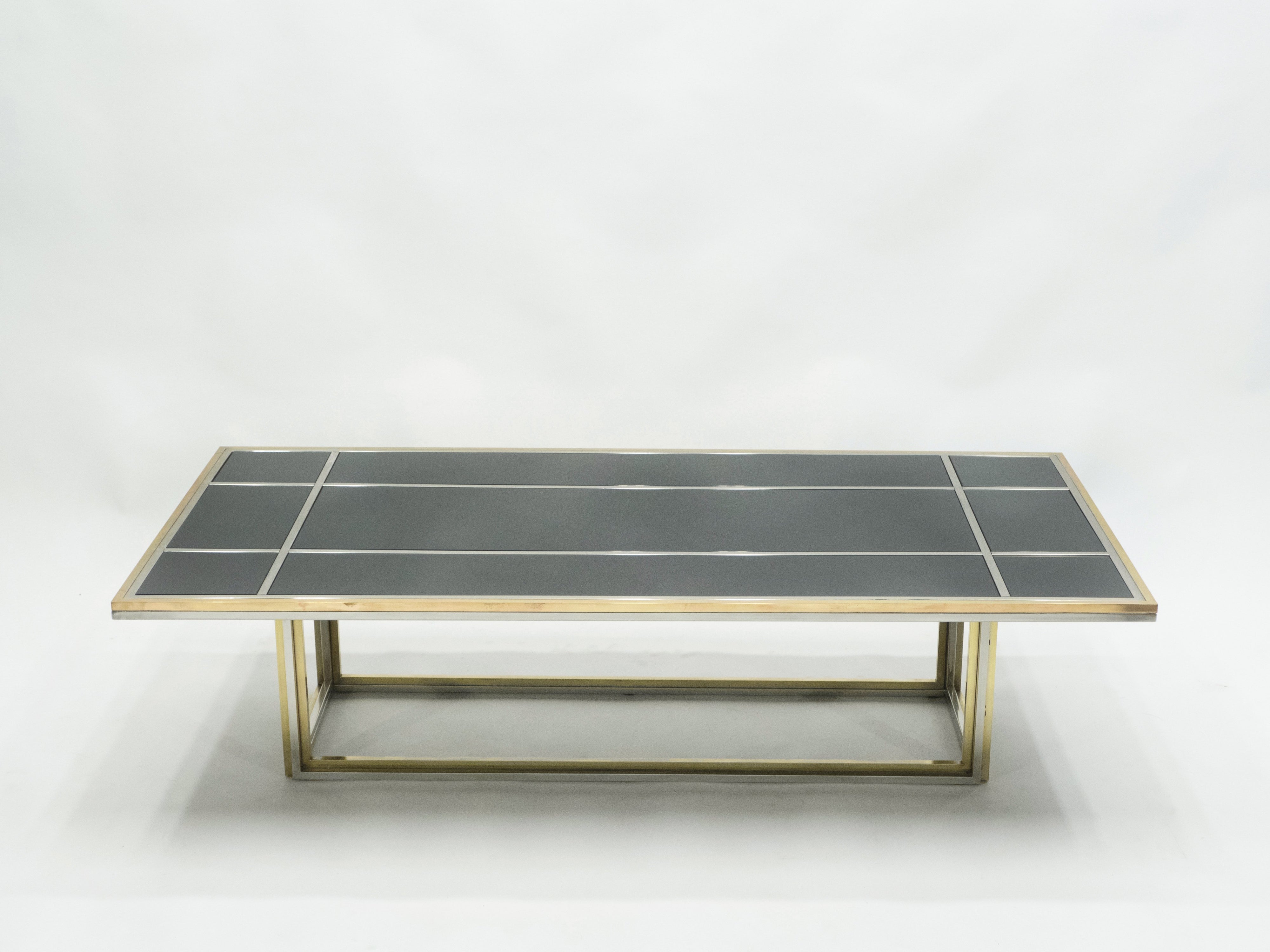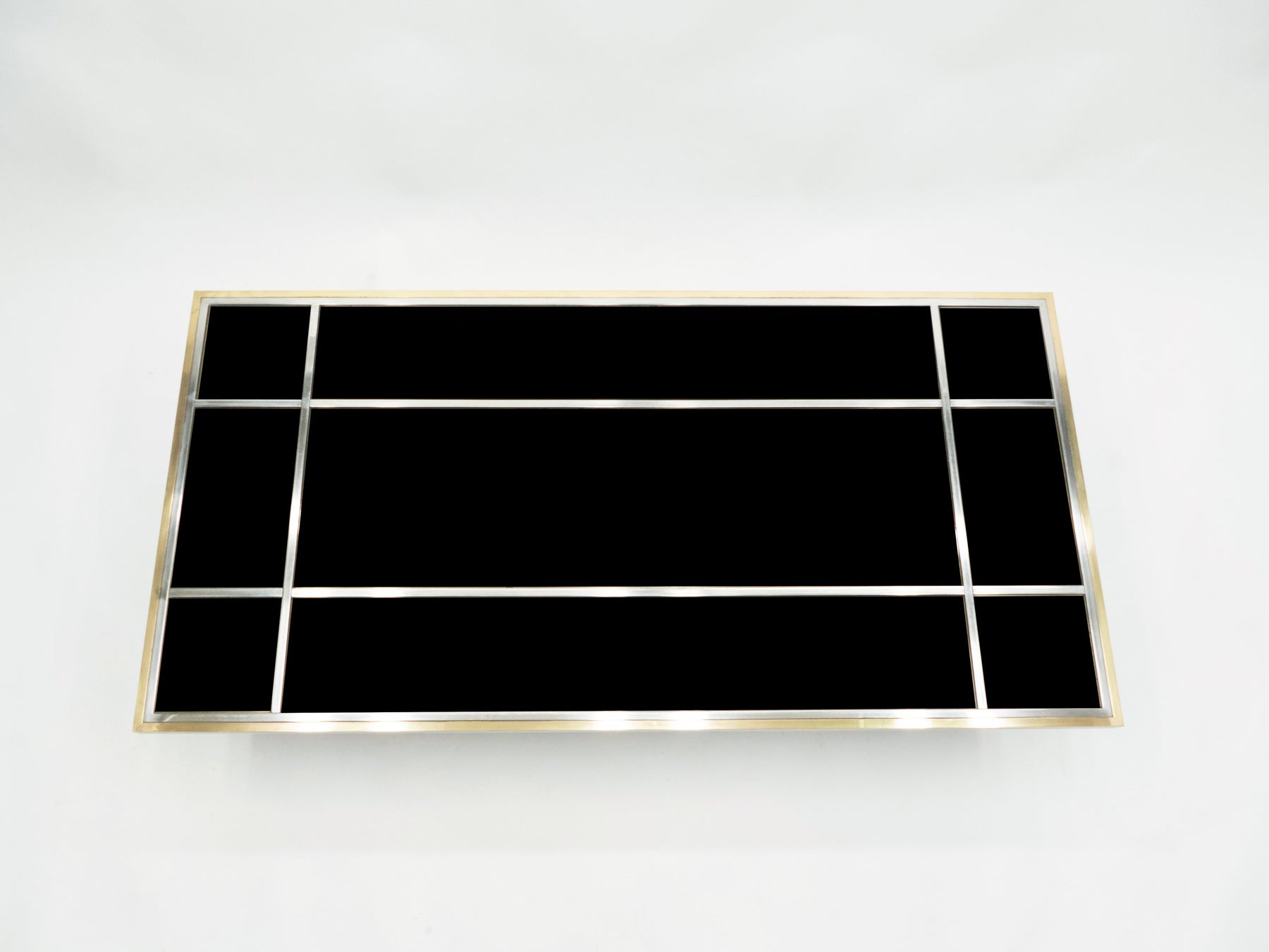 An intriguing piece of design, this coffee table deserves to be the focal point of a room. Symmetrical brass and chrome elements strike through a transparent glass top, the result being an impressively sleek living room centerpiece. Made in Italy for Metalarte in the 1970s and signed by Romeo Rega, it has been maintained in mint condition.
