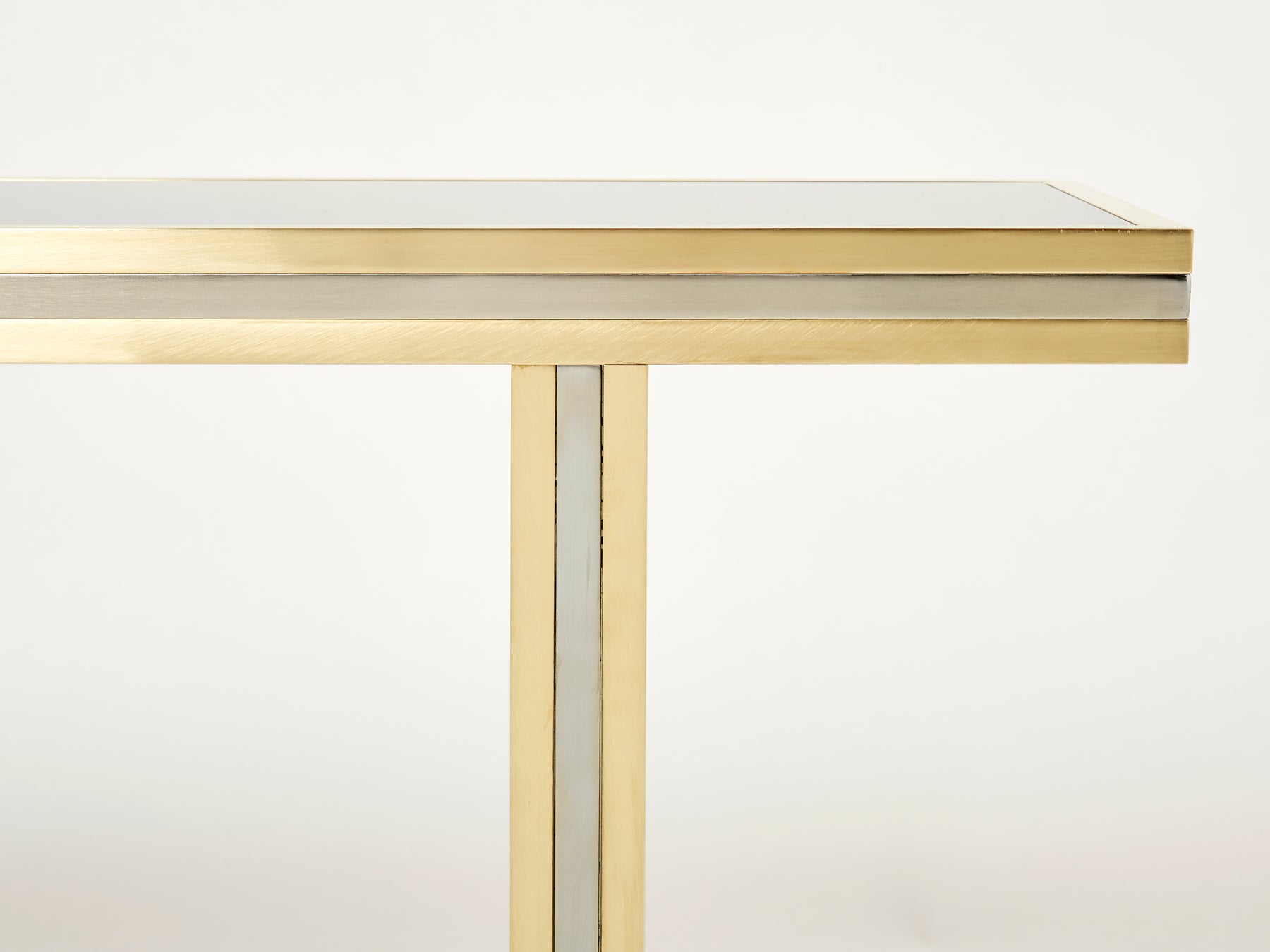 A beautiful piece of design, this console table deserves to be the focal point of your entrance or living room. Symmetrical brass and chrome elements strike through a black opaline glass top, the result being an impressively sleek decorative piece. Made in Italy for Metalarte in the 1970s and designed by Romeo Rega, it has been fully restored and cleaned, black opaline glass top replaced, and has been maintained in a great vintage condition.