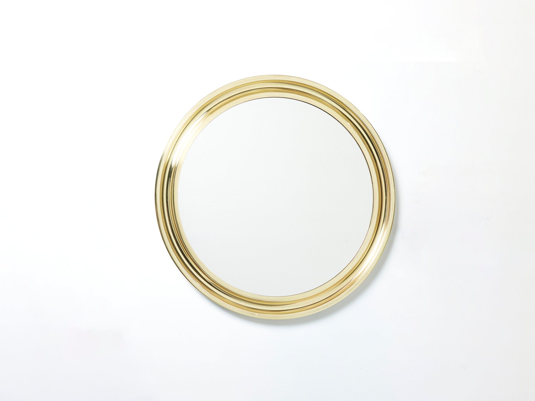 With its strong geometric design, this statement round brass mirror “Narciso” was designed by Italian Sergio Mazza for Artemide in the late 1960s. A perfect mirror for an entrance, or powder room. Found in very good vintage condition and made with high-quality materials, this mid-century modern mirror imparts its glamourous energy to any space it inhabits.
