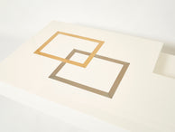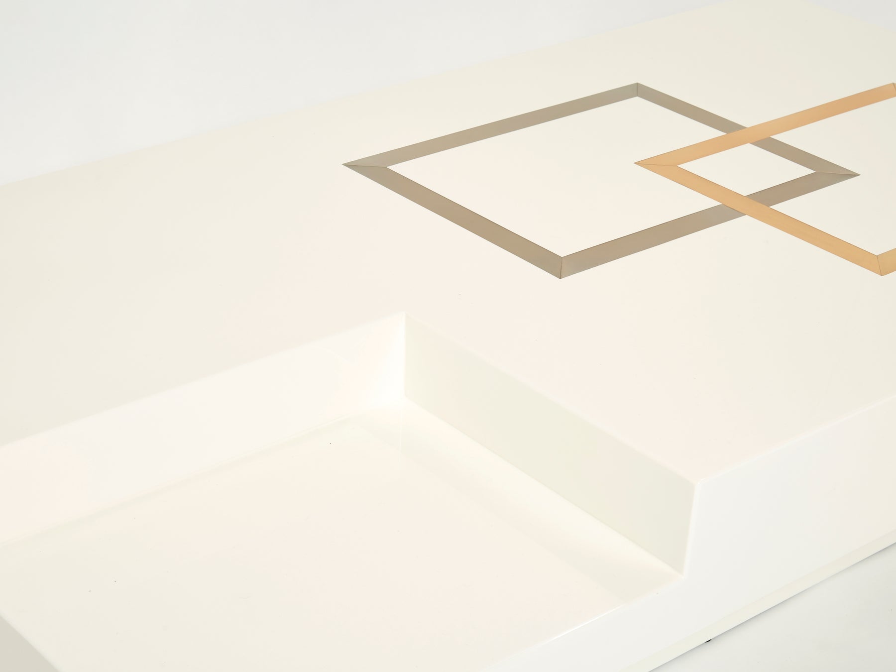 This stunning coffee table is guaranteed to be the focus of attention when you entertain guests, and will make a fascinating centerpiece for your living room. Following the glamorous mid-century look of other classic Italian design from the 1970s, the gleaming white lacquered table is inset with an eye-catching brass and steel insert on the top, which creates a wonderfully radiant negative space in the surface of the piece. A very rare find in this extra large size, fully restored and relacquered, found in great vintage condition.
