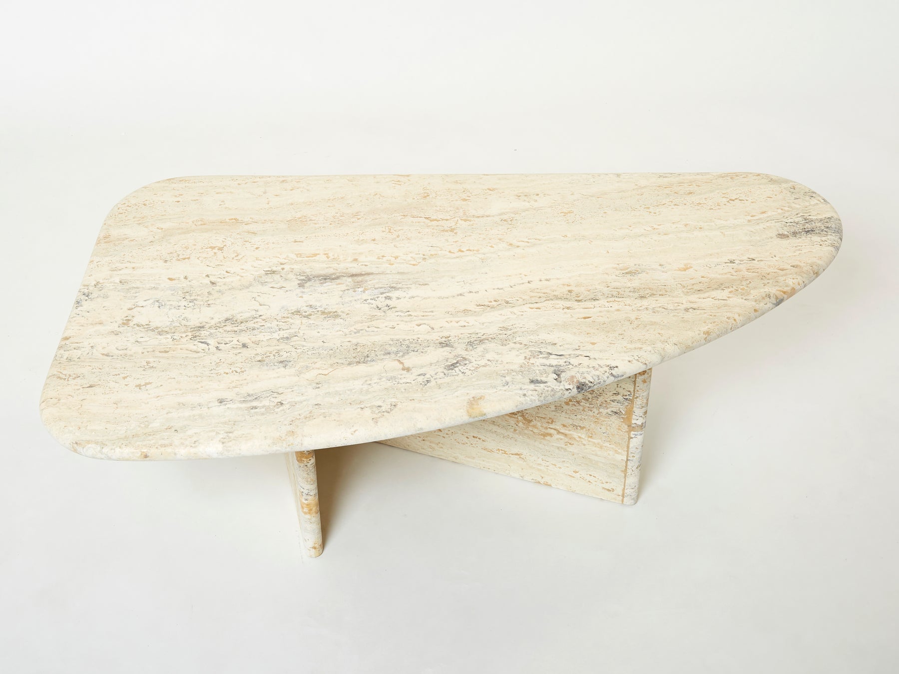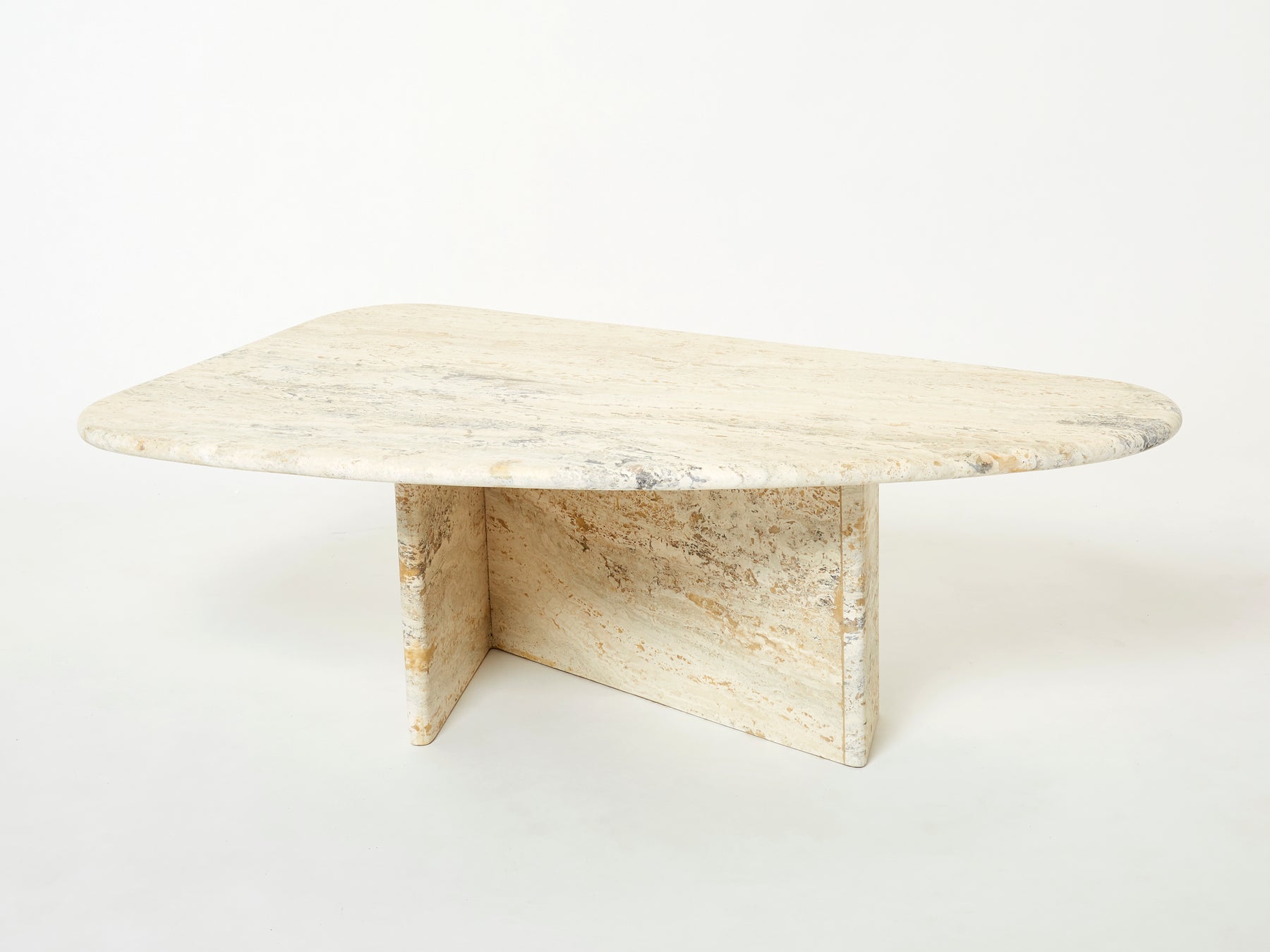 Beautiful vintage coffee table, free form shaped, produced in Italy in the early 1970s from a beautiful travertine marble. The thick shaped surface of this table is slick yet intriguing, with beautiful veins and colors, making it a staging piece of the living room. The Z shape foot is also made of travertine. The result is a sophisticated, naturalist look. Fully repolished, this table is found in an amazing condition.