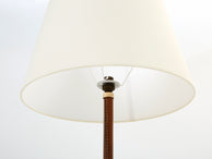 This elegant Jacques Adnet floor lamp is sure to add an element of French modernisme to any room in your home. It was designed and produced by Jacques Adnet in the 1950s. With piqué sellier stitched brown leather structure, with brass accents, brass sabots and a beautiful black laminate top, this lamp is a beautiful example of Jacques Adnet timeless chic. It has been fully restored, rewired, and is in a beautiful condition. Dimensions include the lamp shade.