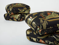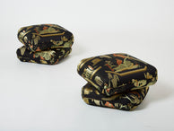 Beautiful pair of ottomans or stools by French Designer Jacques Charpentier for Maison Jansen designed in the 1970s. The stools ottomans are made of two large cushion elements connected together. They have been newly upholstered with a silky Jacquard depicting a celestial atmosphere from Dedar Milano. This ottomans set exudes a stylized 1970s allure that will anchor your space in french mid-century modernity.