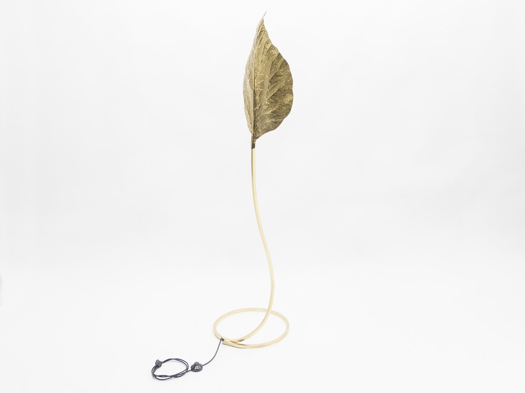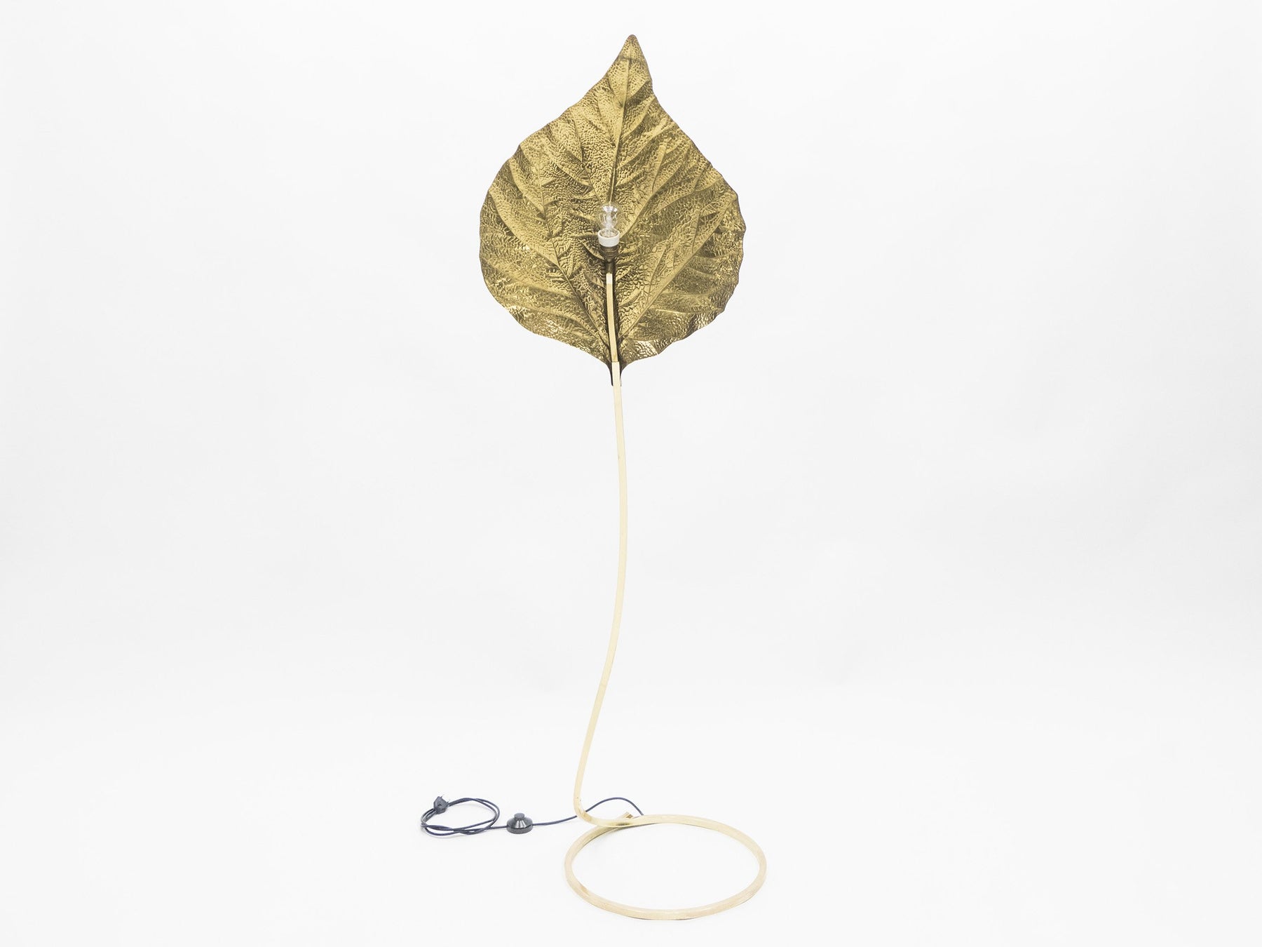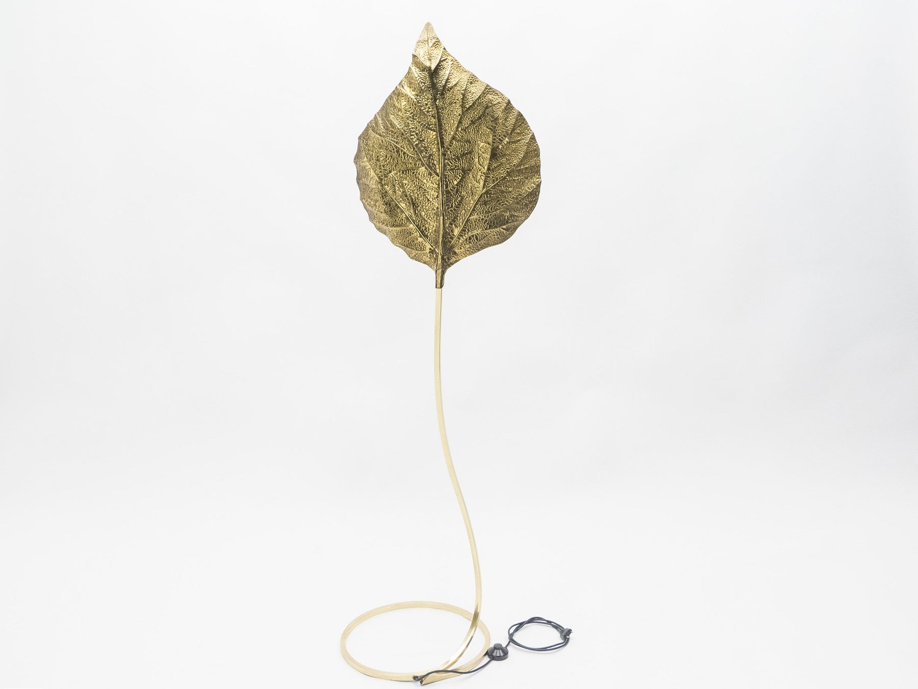 This iconic single leaf Rhubarb floor lamp by Tommaso Barbi was produced by Carlo Giorgi in Italy in the 1970s. The circular brass frame sweeps upwards from the base to support the large, decorative, hammered brass leaf. The handcrafted element gives this lamp a very sculptural appearance. The lamp produces a beautiful light with its warm, gold reflections and is truly a statement piece of Hollywood Regency Italian design from the 1970s. This piece has been newly polished, and in excellent vintage condition.