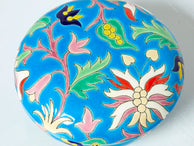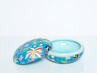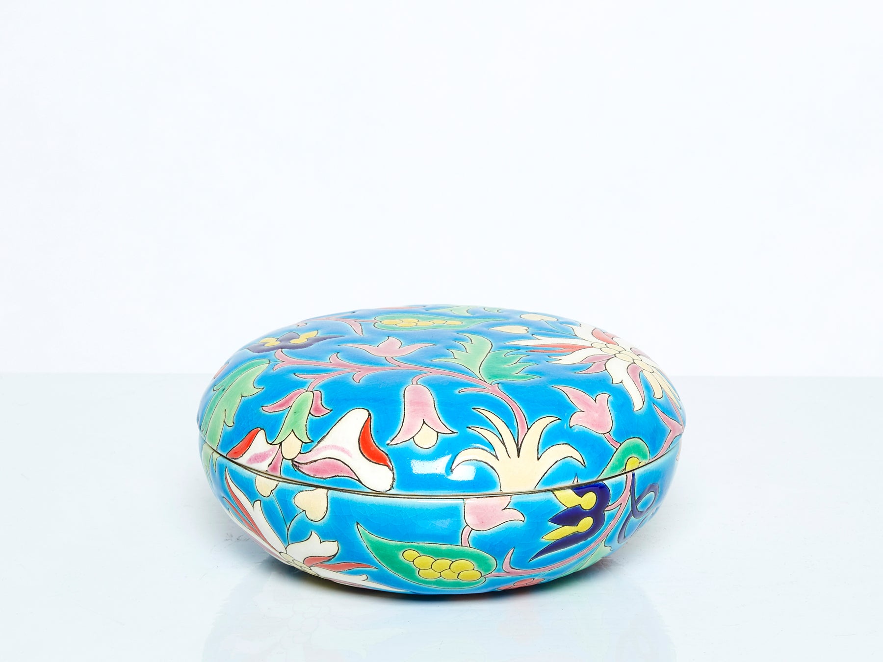 Colourful ceramic Art deco round box by Faïenceries et Emaux de Longwy made around 1950. This turquoise blue box features beautiful flowers all around, and Longwy's signature craquelure glaze. The Longwy manufacture has hundreds of years of tradition, their golden age is clearly the 1920s and 1940s when the cloisonné technique reached a creative Art deco peak. A collectible piece, with a nice decorative presence, found in a very good vintage condition. Perfect as a gift, it can be used as a ring or jewellery box.