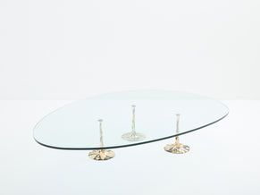 Rare and unique coffee table designed by a French anonymous designer in the 1970s. The three adjustable brutalist feet are made in patinated and gilt wrought iron, with gold leaf finish, with a forme libre thick transparent glass top, reminiscent of Charlotte Perriand forme libre shapes tables. This is clearly a statement piece, brutalist, and highly decorative. It has been fully restored, and is in a great vintage condition.