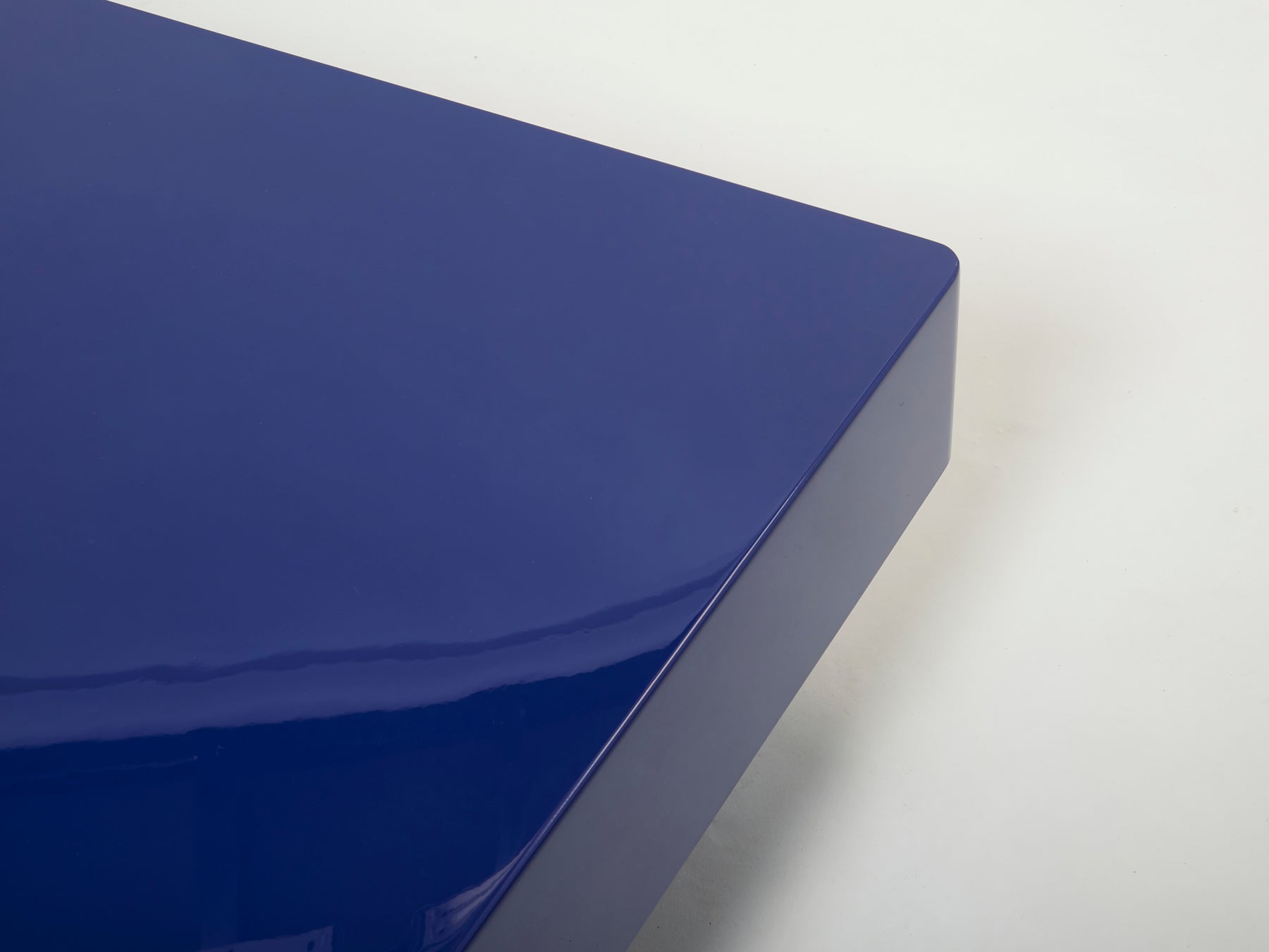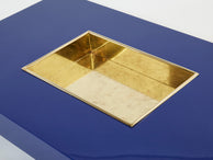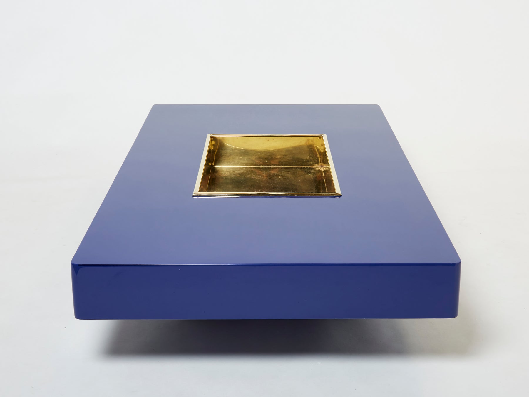 This stunning extra large coffee table is guaranteed to be the focus of attention when you entertain guests, and will make a fascinating centerpiece for your living room. Following the glamorous mid-century look of other classic Willy Rizzo designs, the gleaming blue lacquered table is inset with an eye-catching brass bar at it, with rounded corners, which creates a wonderfully radiant negative space in the surface of the piece. A very rare find in this extra large size, fully restored and relacquered, and in great vintage condition.
