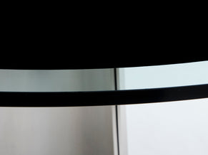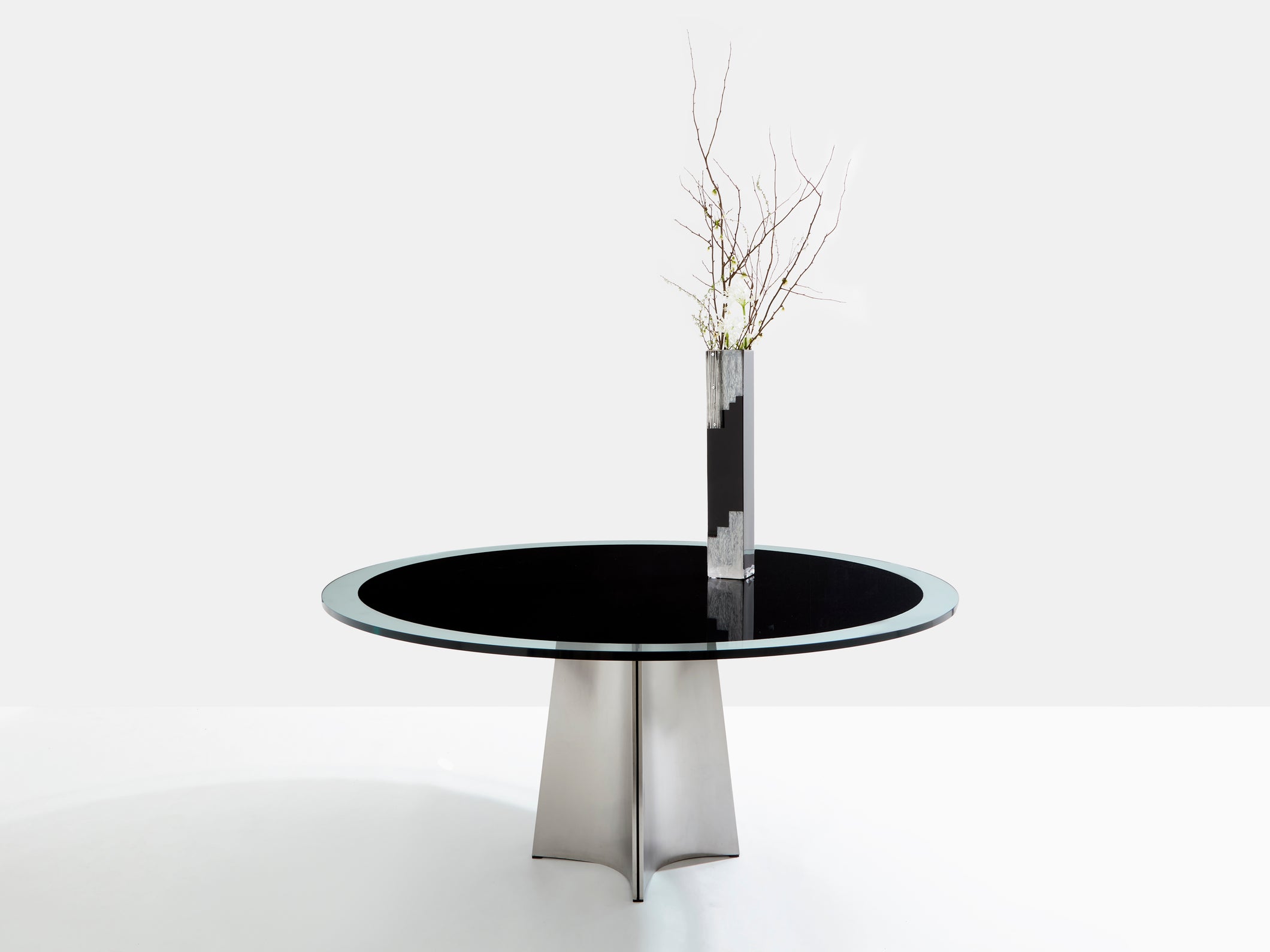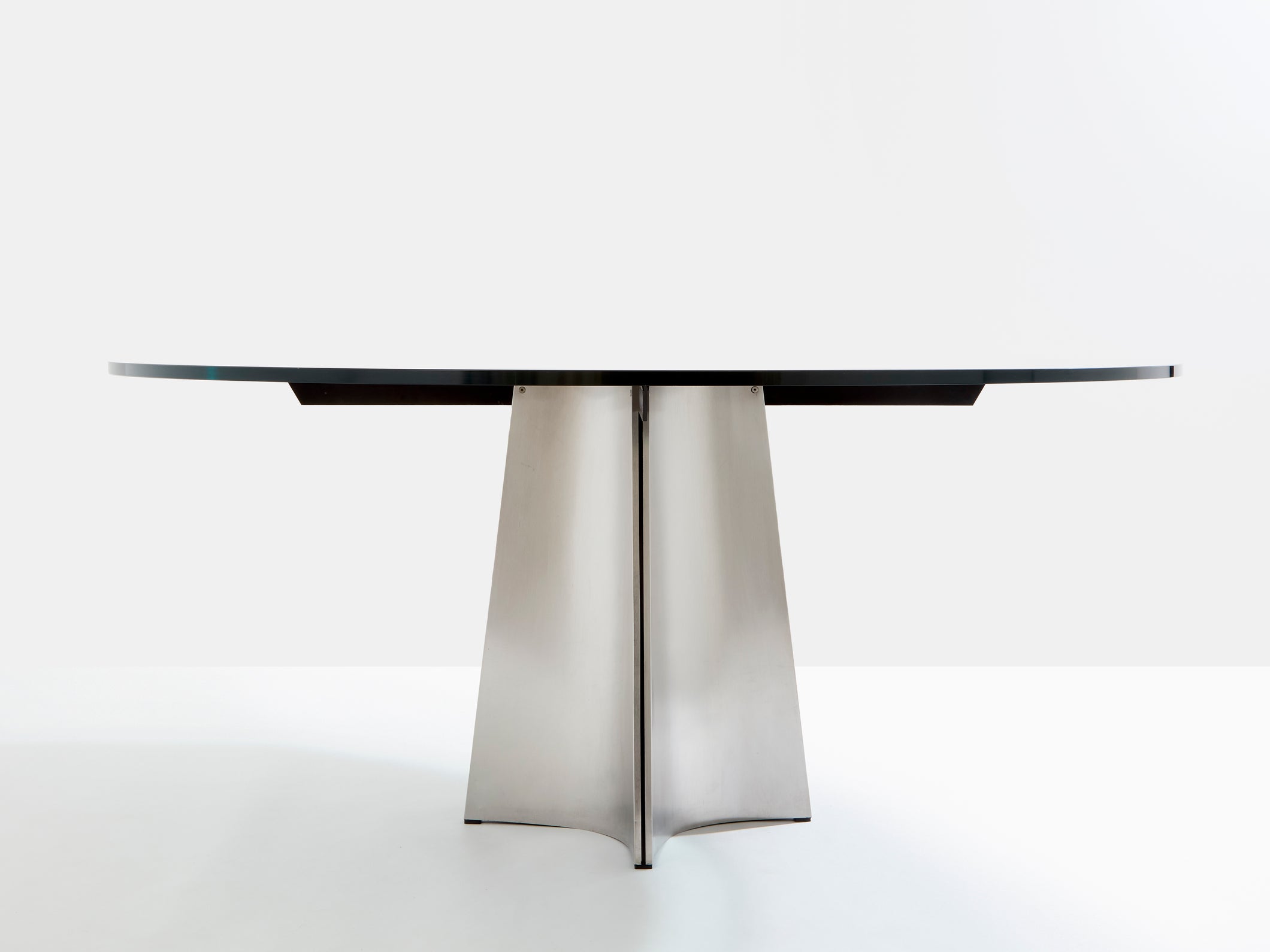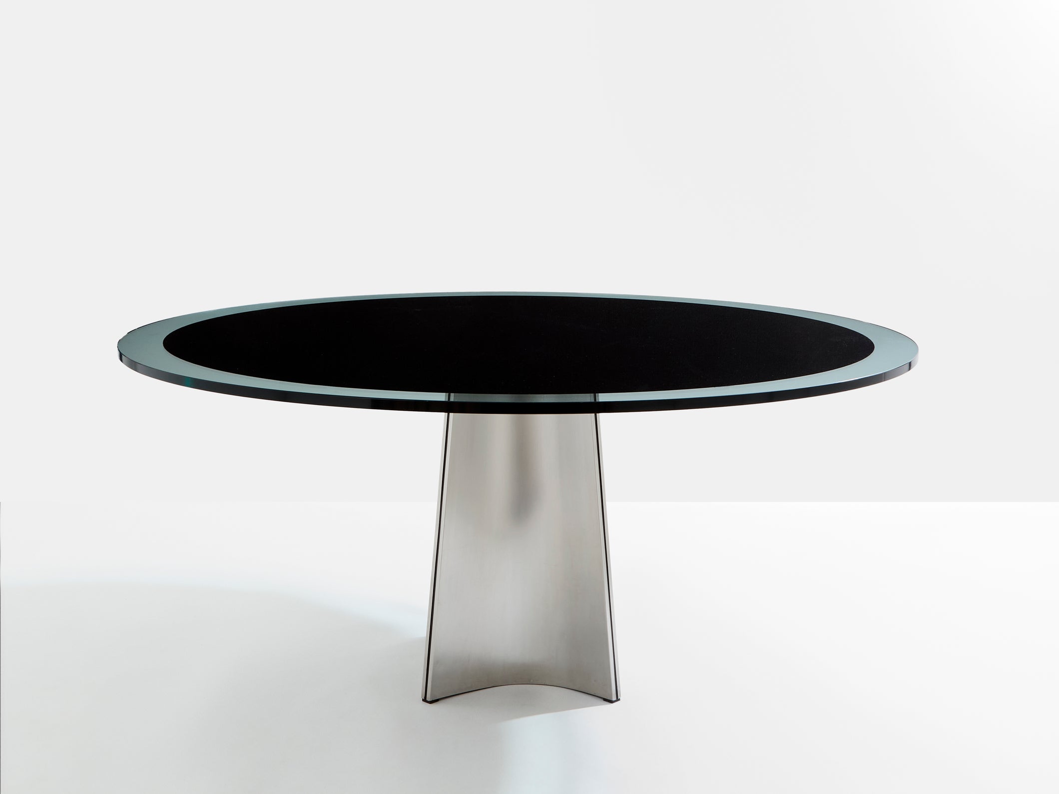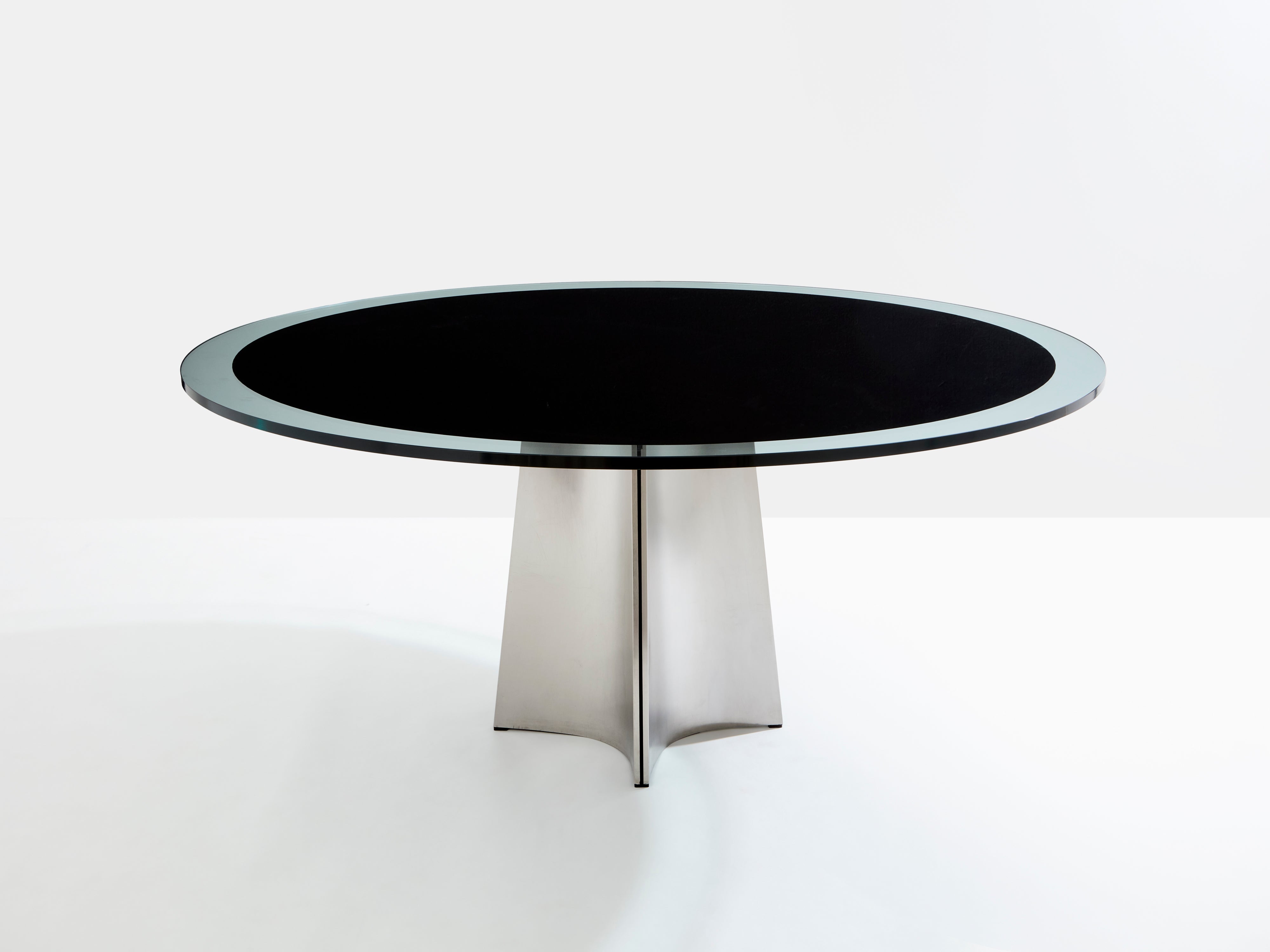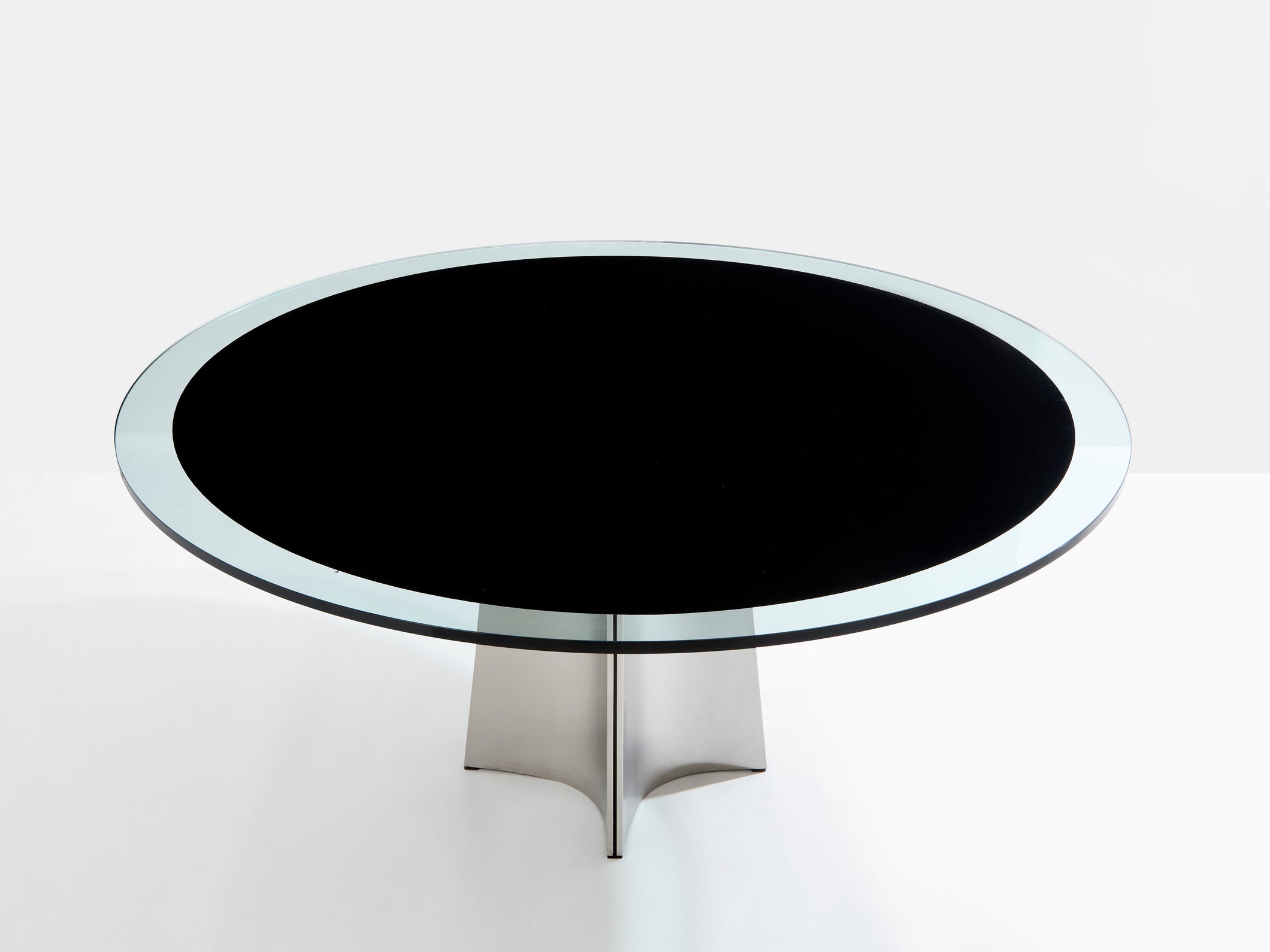 This beautiful round dining table is perfect in every way. Curved in toward the table's center, this iconic UFO piece by Italian Modernist Luigi Saccardo for Arrmet was distributed in France by Maison Jansen in the 1970s. It is made from concave bendable sleek brushed stainless steel pedestal frame with a black and transparent original glass top that gives a timeless modernism and industrial feel. This model is the largest one from the UFO serie, with the top diameter being 63 inches. The foot has been fully repolished, while the original glass top is in almost unused condition, with no scratches or dents. A very rare find in this condition.